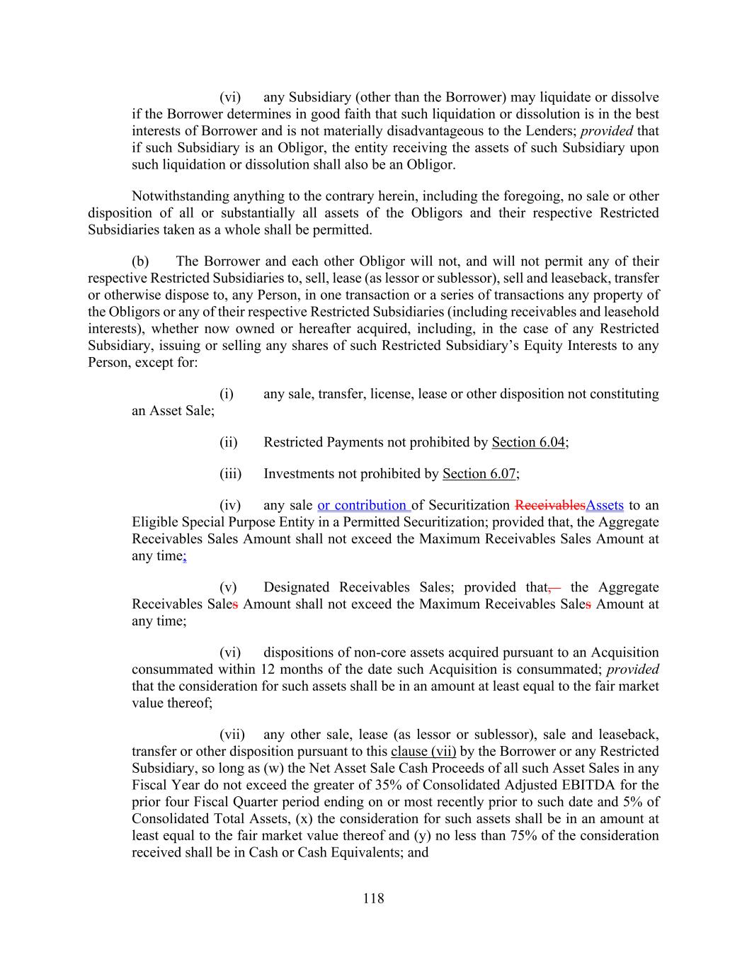 118 (vi) any Subsidiary (other than the Borrower) may liquidate or dissolve if the Borrower determines in good faith that such liquidation or dissolution is in the best interests of Borrower and is not materially disadvantageous to the Lenders; provided that if such Subsidiary is an Obligor, the entity receiving the assets of such Subsidiary upon such liquidation or dissolution shall also be an Obligor. Notwithstanding anything to the contrary herein, including the foregoing, no sale or other disposition of all or substantially all assets of the Obligors and their respective Restricted Subsidiaries taken as a whole shall be permitted. (b) The Borrower and each other Obligor will not, and will not permit any of their respective Restricted Subsidiaries to, sell, lease (as lessor or sublessor), sell and leaseback, transfer or otherwise dispose to, any Person, in one transaction or a series of transactions any property of the Obligors or any of their respective Restricted Subsidiaries (including receivables and leasehold interests), whether now owned or hereafter acquired, including, in the case of any Restricted Subsidiary, issuing or selling any shares of such Restricted Subsidiary’s Equity Interests to any Person, except for: (i) any sale, transfer, license, lease or other disposition not constituting an Asset Sale; (ii) Restricted Payments not prohibited by Section 6.04; (iii) Investments not prohibited by Section 6.07; (iv) any sale or contribution of Securitization ReceivablesAssets to an Eligible Special Purpose Entity in a Permitted Securitization; provided that, the Aggregate Receivables Sales Amount shall not exceed the Maximum Receivables Sales Amount at any time; (v) Designated Receivables Sales; provided that, the Aggregate Receivables Sales Amount shall not exceed the Maximum Receivables Sales Amount at any time; (vi) dispositions of non-core assets acquired pursuant to an Acquisition consummated within 12 months of the date such Acquisition is consummated; provided that the consideration for such assets shall be in an amount at least equal to the fair market value thereof; (vii) any other sale, lease (as lessor or sublessor), sale and leaseback, transfer or other disposition pursuant to this clause (vii) by the Borrower or any Restricted Subsidiary, so long as (w) the Net Asset Sale Cash Proceeds of all such Asset Sales in any Fiscal Year do not exceed the greater of 35% of Consolidated Adjusted EBITDA for the prior four Fiscal Quarter period ending on or most recently prior to such date and 5% of Consolidated Total Assets, (x) the consideration for such assets shall be in an amount at least equal to the fair market value thereof and (y) no less than 75% of the consideration received shall be in Cash or Cash Equivalents; and