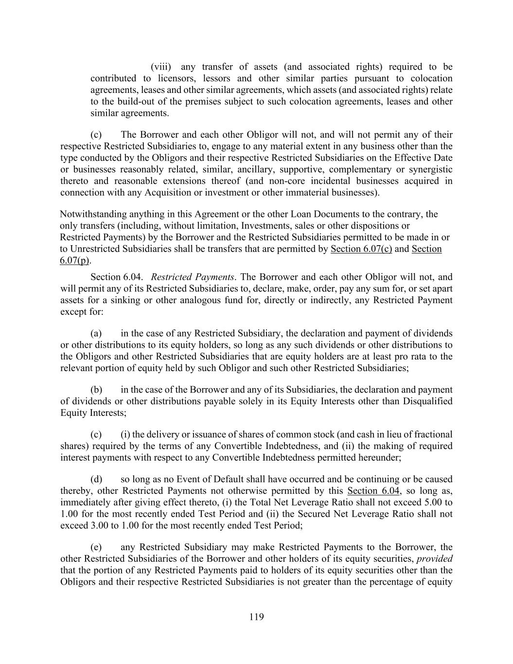 119 (viii) any transfer of assets (and associated rights) required to be contributed to licensors, lessors and other similar parties pursuant to colocation agreements, leases and other similar agreements, which assets (and associated rights) relate to the build-out of the premises subject to such colocation agreements, leases and other similar agreements. (c) The Borrower and each other Obligor will not, and will not permit any of their respective Restricted Subsidiaries to, engage to any material extent in any business other than the type conducted by the Obligors and their respective Restricted Subsidiaries on the Effective Date or businesses reasonably related, similar, ancillary, supportive, complementary or synergistic thereto and reasonable extensions thereof (and non-core incidental businesses acquired in connection with any Acquisition or investment or other immaterial businesses). Notwithstanding anything in this Agreement or the other Loan Documents to the contrary, the only transfers (including, without limitation, Investments, sales or other dispositions or Restricted Payments) by the Borrower and the Restricted Subsidiaries permitted to be made in or to Unrestricted Subsidiaries shall be transfers that are permitted by Section 6.07(c) and Section 6.07(p). Section 6.04. Restricted Payments. The Borrower and each other Obligor will not, and will permit any of its Restricted Subsidiaries to, declare, make, order, pay any sum for, or set apart assets for a sinking or other analogous fund for, directly or indirectly, any Restricted Payment except for: (a) in the case of any Restricted Subsidiary, the declaration and payment of dividends or other distributions to its equity holders, so long as any such dividends or other distributions to the Obligors and other Restricted Subsidiaries that are equity holders are at least pro rata to the relevant portion of equity held by such Obligor and such other Restricted Subsidiaries; (b) in the case of the Borrower and any of its Subsidiaries, the declaration and payment of dividends or other distributions payable solely in its Equity Interests other than Disqualified Equity Interests; (c) (i) the delivery or issuance of shares of common stock (and cash in lieu of fractional shares) required by the terms of any Convertible Indebtedness, and (ii) the making of required interest payments with respect to any Convertible Indebtedness permitted hereunder; (d) so long as no Event of Default shall have occurred and be continuing or be caused thereby, other Restricted Payments not otherwise permitted by this Section 6.04, so long as, immediately after giving effect thereto, (i) the Total Net Leverage Ratio shall not exceed 5.00 to 1.00 for the most recently ended Test Period and (ii) the Secured Net Leverage Ratio shall not exceed 3.00 to 1.00 for the most recently ended Test Period; (e) any Restricted Subsidiary may make Restricted Payments to the Borrower, the other Restricted Subsidiaries of the Borrower and other holders of its equity securities, provided that the portion of any Restricted Payments paid to holders of its equity securities other than the Obligors and their respective Restricted Subsidiaries is not greater than the percentage of equity
