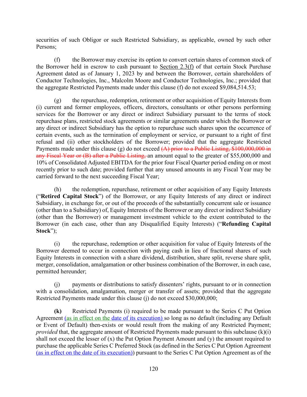 120 securities of such Obligor or such Restricted Subsidiary, as applicable, owned by such other Persons; (f) the Borrower may exercise its option to convert certain shares of common stock of the Borrower held in escrow to cash pursuant to Section 2.3(f) of that certain Stock Purchase Agreement dated as of January 1, 2023 by and between the Borrower, certain shareholders of Conductor Technologies, Inc., Malcolm Moore and Conductor Technologies, Inc.; provided that the aggregate Restricted Payments made under this clause (f) do not exceed $9,084,514.53; (g) the repurchase, redemption, retirement or other acquisition of Equity Interests from (i) current and former employees, officers, directors, consultants or other persons performing services for the Borrower or any direct or indirect Subsidiary pursuant to the terms of stock repurchase plans, restricted stock agreements or similar agreements under which the Borrower or any direct or indirect Subsidiary has the option to repurchase such shares upon the occurrence of certain events, such as the termination of employment or service, or pursuant to a right of first refusal and (ii) other stockholders of the Borrower; provided that the aggregate Restricted Payments made under this clause (g) do not exceed (A) prior to a Public Listing, $100,000,000 in any Fiscal Year or (B) after a Public Listing, an amount equal to the greater of $55,000,000 and 10% of Consolidated Adjusted EBITDA for the prior four Fiscal Quarter period ending on or most recently prior to such date; provided further that any unused amounts in any Fiscal Year may be carried forward to the next succeeding Fiscal Year; (h) the redemption, repurchase, retirement or other acquisition of any Equity Interests (“Retired Capital Stock”) of the Borrower, or any Equity Interests of any direct or indirect Subsidiary, in exchange for, or out of the proceeds of the substantially concurrent sale or issuance (other than to a Subsidiary) of, Equity Interests of the Borrower or any direct or indirect Subsidiary (other than the Borrower) or management investment vehicle to the extent contributed to the Borrower (in each case, other than any Disqualified Equity Interests) (“Refunding Capital Stock”); (i) the repurchase, redemption or other acquisition for value of Equity Interests of the Borrower deemed to occur in connection with paying cash in lieu of fractional shares of such Equity Interests in connection with a share dividend, distribution, share split, reverse share split, merger, consolidation, amalgamation or other business combination of the Borrower, in each case, permitted hereunder; (j) payments or distributions to satisfy dissenters’ rights, pursuant to or in connection with a consolidation, amalgamation, merger or transfer of assets; provided that the aggregate Restricted Payments made under this clause (j) do not exceed $30,000,000; (k) Restricted Payments (i) required to be made pursuant to the Series C Put Option Agreement (as in effect on the date of its execution) so long as no default (including any Default or Event of Default) then-exists or would result from the making of any Restricted Payment; provided that, the aggregate amount of Restricted Payments made pursuant to this subclause (k)(i) shall not exceed the lesser of (x) the Put Option Payment Amount and (y) the amount required to purchase the applicable Series C Preferred Stock (as defined in the Series C Put Option Agreement (as in effect on the date of its execution)) pursuant to the Series C Put Option Agreement as of the