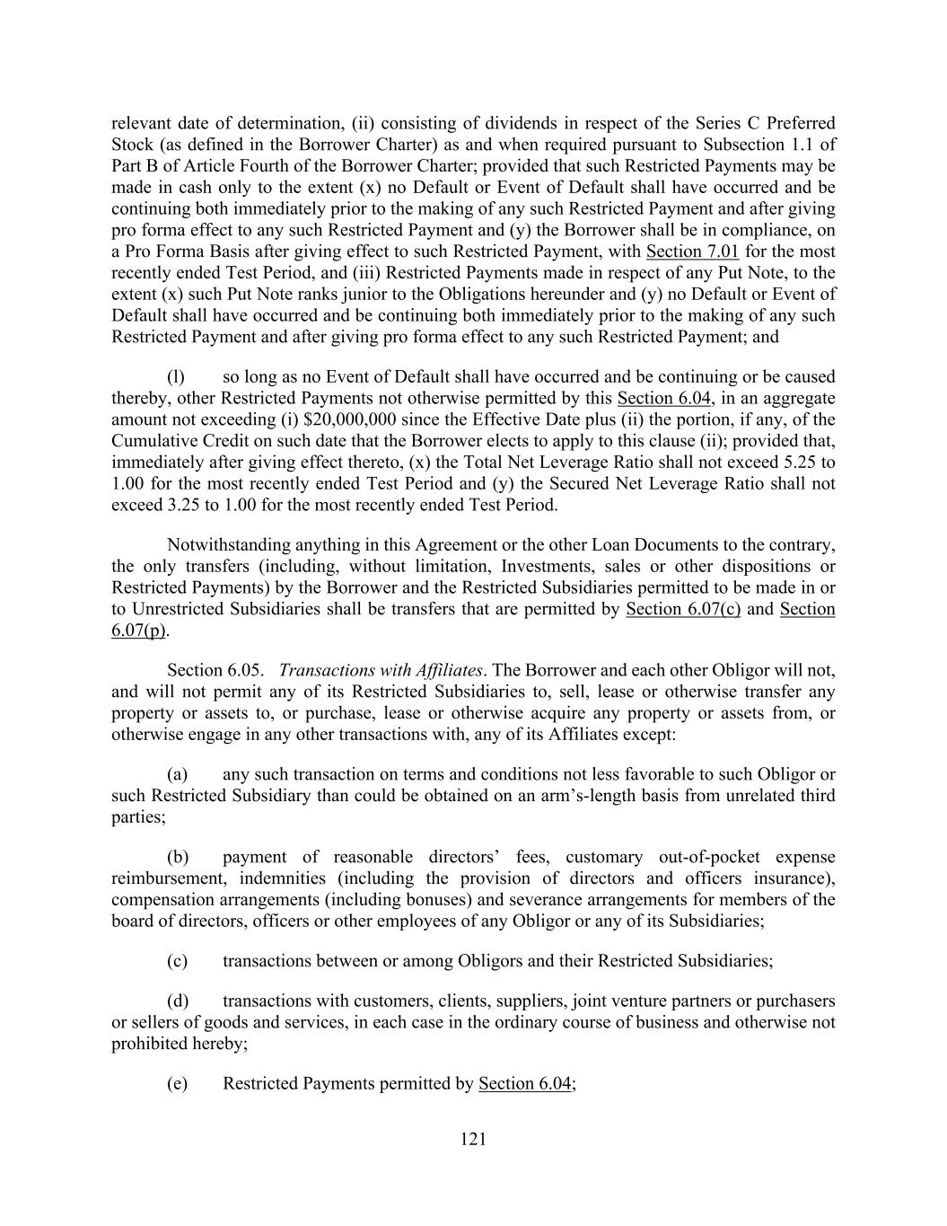 121 relevant date of determination, (ii) consisting of dividends in respect of the Series C Preferred Stock (as defined in the Borrower Charter) as and when required pursuant to Subsection 1.1 of Part B of Article Fourth of the Borrower Charter; provided that such Restricted Payments may be made in cash only to the extent (x) no Default or Event of Default shall have occurred and be continuing both immediately prior to the making of any such Restricted Payment and after giving pro forma effect to any such Restricted Payment and (y) the Borrower shall be in compliance, on a Pro Forma Basis after giving effect to such Restricted Payment, with Section 7.01 for the most recently ended Test Period, and (iii) Restricted Payments made in respect of any Put Note, to the extent (x) such Put Note ranks junior to the Obligations hereunder and (y) no Default or Event of Default shall have occurred and be continuing both immediately prior to the making of any such Restricted Payment and after giving pro forma effect to any such Restricted Payment; and (l) so long as no Event of Default shall have occurred and be continuing or be caused thereby, other Restricted Payments not otherwise permitted by this Section 6.04, in an aggregate amount not exceeding (i) $20,000,000 since the Effective Date plus (ii) the portion, if any, of the Cumulative Credit on such date that the Borrower elects to apply to this clause (ii); provided that, immediately after giving effect thereto, (x) the Total Net Leverage Ratio shall not exceed 5.25 to 1.00 for the most recently ended Test Period and (y) the Secured Net Leverage Ratio shall not exceed 3.25 to 1.00 for the most recently ended Test Period. Notwithstanding anything in this Agreement or the other Loan Documents to the contrary, the only transfers (including, without limitation, Investments, sales or other dispositions or Restricted Payments) by the Borrower and the Restricted Subsidiaries permitted to be made in or to Unrestricted Subsidiaries shall be transfers that are permitted by Section 6.07(c) and Section 6.07(p). Section 6.05. Transactions with Affiliates. The Borrower and each other Obligor will not, and will not permit any of its Restricted Subsidiaries to, sell, lease or otherwise transfer any property or assets to, or purchase, lease or otherwise acquire any property or assets from, or otherwise engage in any other transactions with, any of its Affiliates except: (a) any such transaction on terms and conditions not less favorable to such Obligor or such Restricted Subsidiary than could be obtained on an arm’s-length basis from unrelated third parties; (b) payment of reasonable directors’ fees, customary out-of-pocket expense reimbursement, indemnities (including the provision of directors and officers insurance), compensation arrangements (including bonuses) and severance arrangements for members of the board of directors, officers or other employees of any Obligor or any of its Subsidiaries; (c) transactions between or among Obligors and their Restricted Subsidiaries; (d) transactions with customers, clients, suppliers, joint venture partners or purchasers or sellers of goods and services, in each case in the ordinary course of business and otherwise not prohibited hereby; (e) Restricted Payments permitted by Section 6.04;