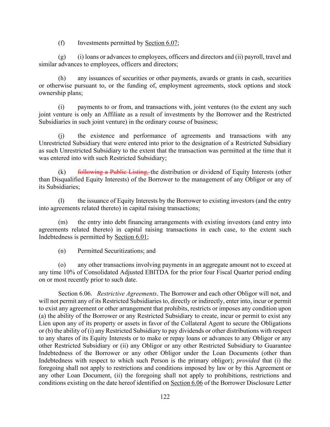 122 (f) Investments permitted by Section 6.07; (g) (i) loans or advances to employees, officers and directors and (ii) payroll, travel and similar advances to employees, officers and directors; (h) any issuances of securities or other payments, awards or grants in cash, securities or otherwise pursuant to, or the funding of, employment agreements, stock options and stock ownership plans; (i) payments to or from, and transactions with, joint ventures (to the extent any such joint venture is only an Affiliate as a result of investments by the Borrower and the Restricted Subsidiaries in such joint venture) in the ordinary course of business; (j) the existence and performance of agreements and transactions with any Unrestricted Subsidiary that were entered into prior to the designation of a Restricted Subsidiary as such Unrestricted Subsidiary to the extent that the transaction was permitted at the time that it was entered into with such Restricted Subsidiary; (k) following a Public Listing, the distribution or dividend of Equity Interests (other than Disqualified Equity Interests) of the Borrower to the management of any Obligor or any of its Subsidiaries; (l) the issuance of Equity Interests by the Borrower to existing investors (and the entry into agreements related thereto) in capital raising transactions; (m) the entry into debt financing arrangements with existing investors (and entry into agreements related thereto) in capital raising transactions in each case, to the extent such Indebtedness is permitted by Section 6.01; (n) Permitted Securitizations; and (o) any other transactions involving payments in an aggregate amount not to exceed at any time 10% of Consolidated Adjusted EBITDA for the prior four Fiscal Quarter period ending on or most recently prior to such date. Section 6.06. Restrictive Agreements. The Borrower and each other Obligor will not, and will not permit any of its Restricted Subsidiaries to, directly or indirectly, enter into, incur or permit to exist any agreement or other arrangement that prohibits, restricts or imposes any condition upon (a) the ability of the Borrower or any Restricted Subsidiary to create, incur or permit to exist any Lien upon any of its property or assets in favor of the Collateral Agent to secure the Obligations or (b) the ability of (i) any Restricted Subsidiary to pay dividends or other distributions with respect to any shares of its Equity Interests or to make or repay loans or advances to any Obligor or any other Restricted Subsidiary or (ii) any Obligor or any other Restricted Subsidiary to Guarantee Indebtedness of the Borrower or any other Obligor under the Loan Documents (other than Indebtedness with respect to which such Person is the primary obligor); provided that (i) the foregoing shall not apply to restrictions and conditions imposed by law or by this Agreement or any other Loan Document, (ii) the foregoing shall not apply to prohibitions, restrictions and conditions existing on the date hereof identified on Section 6.06 of the Borrower Disclosure Letter