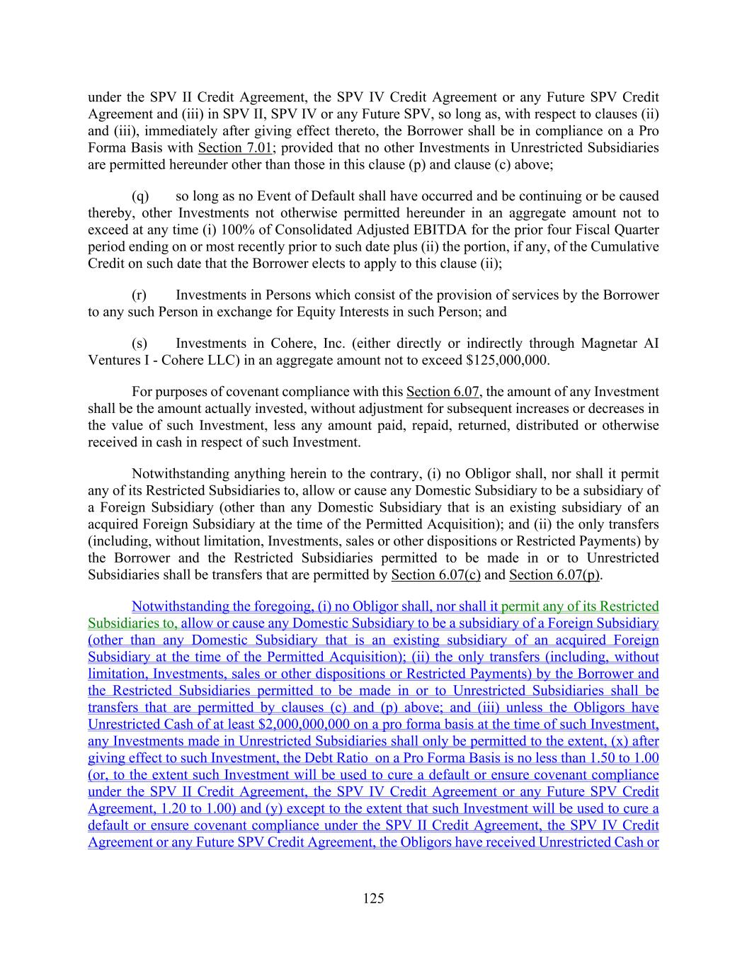 125 under the SPV II Credit Agreement, the SPV IV Credit Agreement or any Future SPV Credit Agreement and (iii) in SPV II, SPV IV or any Future SPV, so long as, with respect to clauses (ii) and (iii), immediately after giving effect thereto, the Borrower shall be in compliance on a Pro Forma Basis with Section 7.01; provided that no other Investments in Unrestricted Subsidiaries are permitted hereunder other than those in this clause (p) and clause (c) above; (q) so long as no Event of Default shall have occurred and be continuing or be caused thereby, other Investments not otherwise permitted hereunder in an aggregate amount not to exceed at any time (i) 100% of Consolidated Adjusted EBITDA for the prior four Fiscal Quarter period ending on or most recently prior to such date plus (ii) the portion, if any, of the Cumulative Credit on such date that the Borrower elects to apply to this clause (ii); (r) Investments in Persons which consist of the provision of services by the Borrower to any such Person in exchange for Equity Interests in such Person; and (s) Investments in Cohere, Inc. (either directly or indirectly through Magnetar AI Ventures I - Cohere LLC) in an aggregate amount not to exceed $125,000,000. For purposes of covenant compliance with this Section 6.07, the amount of any Investment shall be the amount actually invested, without adjustment for subsequent increases or decreases in the value of such Investment, less any amount paid, repaid, returned, distributed or otherwise received in cash in respect of such Investment. Notwithstanding anything herein to the contrary, (i) no Obligor shall, nor shall it permit any of its Restricted Subsidiaries to, allow or cause any Domestic Subsidiary to be a subsidiary of a Foreign Subsidiary (other than any Domestic Subsidiary that is an existing subsidiary of an acquired Foreign Subsidiary at the time of the Permitted Acquisition); and (ii) the only transfers (including, without limitation, Investments, sales or other dispositions or Restricted Payments) by the Borrower and the Restricted Subsidiaries permitted to be made in or to Unrestricted Subsidiaries shall be transfers that are permitted by Section 6.07(c) and Section 6.07(p). Notwithstanding the foregoing, (i) no Obligor shall, nor shall it permit any of its Restricted Subsidiaries to, allow or cause any Domestic Subsidiary to be a subsidiary of a Foreign Subsidiary (other than any Domestic Subsidiary that is an existing subsidiary of an acquired Foreign Subsidiary at the time of the Permitted Acquisition); (ii) the only transfers (including, without limitation, Investments, sales or other dispositions or Restricted Payments) by the Borrower and the Restricted Subsidiaries permitted to be made in or to Unrestricted Subsidiaries shall be transfers that are permitted by clauses (c) and (p) above; and (iii) unless the Obligors have Unrestricted Cash of at least $2,000,000,000 on a pro forma basis at the time of such Investment, any Investments made in Unrestricted Subsidiaries shall only be permitted to the extent, (x) after giving effect to such Investment, the Debt Ratio on a Pro Forma Basis is no less than 1.50 to 1.00 (or, to the extent such Investment will be used to cure a default or ensure covenant compliance under the SPV II Credit Agreement, the SPV IV Credit Agreement or any Future SPV Credit Agreement, 1.20 to 1.00) and (y) except to the extent that such Investment will be used to cure a default or ensure covenant compliance under the SPV II Credit Agreement, the SPV IV Credit Agreement or any Future SPV Credit Agreement, the Obligors have received Unrestricted Cash or