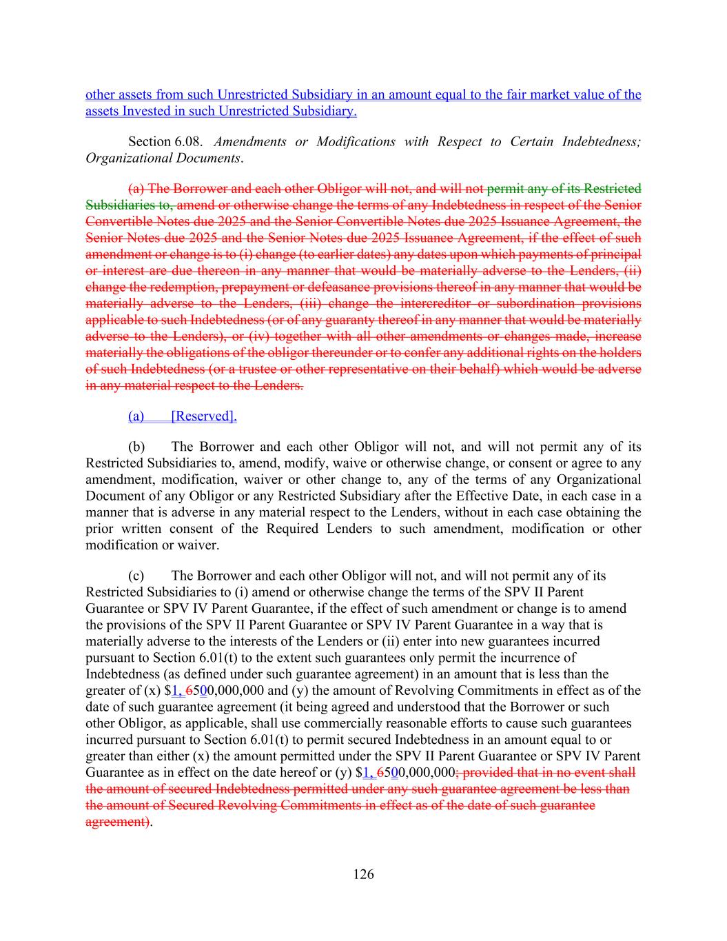 126 other assets from such Unrestricted Subsidiary in an amount equal to the fair market value of the assets Invested in such Unrestricted Subsidiary. Section 6.08. Amendments or Modifications with Respect to Certain Indebtedness; Organizational Documents. (a) The Borrower and each other Obligor will not, and will not permit any of its Restricted Subsidiaries to, amend or otherwise change the terms of any Indebtedness in respect of the Senior Convertible Notes due 2025 and the Senior Convertible Notes due 2025 Issuance Agreement, the Senior Notes due 2025 and the Senior Notes due 2025 Issuance Agreement, if the effect of such amendment or change is to (i) change (to earlier dates) any dates upon which payments of principal or interest are due thereon in any manner that would be materially adverse to the Lenders, (ii) change the redemption, prepayment or defeasance provisions thereof in any manner that would be materially adverse to the Lenders, (iii) change the intercreditor or subordination provisions applicable to such Indebtedness (or of any guaranty thereof in any manner that would be materially adverse to the Lenders), or (iv) together with all other amendments or changes made, increase materially the obligations of the obligor thereunder or to confer any additional rights on the holders of such Indebtedness (or a trustee or other representative on their behalf) which would be adverse in any material respect to the Lenders. (a) [Reserved]. (b) The Borrower and each other Obligor will not, and will not permit any of its Restricted Subsidiaries to, amend, modify, waive or otherwise change, or consent or agree to any amendment, modification, waiver or other change to, any of the terms of any Organizational Document of any Obligor or any Restricted Subsidiary after the Effective Date, in each case in a manner that is adverse in any material respect to the Lenders, without in each case obtaining the prior written consent of the Required Lenders to such amendment, modification or other modification or waiver. (c) The Borrower and each other Obligor will not, and will not permit any of its Restricted Subsidiaries to (i) amend or otherwise change the terms of the SPV II Parent Guarantee or SPV IV Parent Guarantee, if the effect of such amendment or change is to amend the provisions of the SPV II Parent Guarantee or SPV IV Parent Guarantee in a way that is materially adverse to the interests of the Lenders or (ii) enter into new guarantees incurred pursuant to Section 6.01(t) to the extent such guarantees only permit the incurrence of Indebtedness (as defined under such guarantee agreement) in an amount that is less than the greater of (x) $1, 6500,000,000 and (y) the amount of Revolving Commitments in effect as of the date of such guarantee agreement (it being agreed and understood that the Borrower or such other Obligor, as applicable, shall use commercially reasonable efforts to cause such guarantees incurred pursuant to Section 6.01(t) to permit secured Indebtedness in an amount equal to or greater than either (x) the amount permitted under the SPV II Parent Guarantee or SPV IV Parent Guarantee as in effect on the date hereof or (y) $1, 6500,000,000; provided that in no event shall the amount of secured Indebtedness permitted under any such guarantee agreement be less than the amount of Secured Revolving Commitments in effect as of the date of such guarantee agreement).