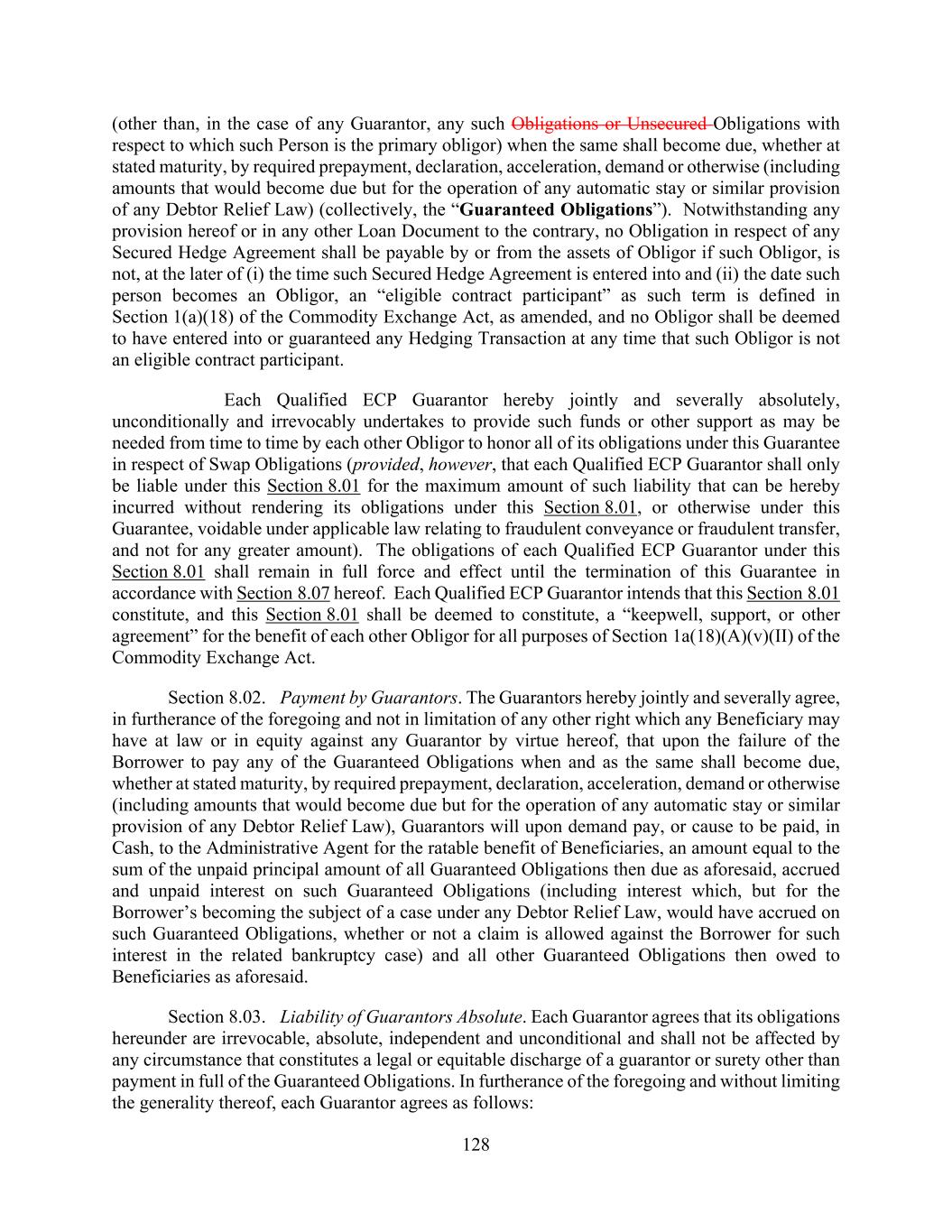 128 (other than, in the case of any Guarantor, any such Obligations or Unsecured Obligations with respect to which such Person is the primary obligor) when the same shall become due, whether at stated maturity, by required prepayment, declaration, acceleration, demand or otherwise (including amounts that would become due but for the operation of any automatic stay or similar provision of any Debtor Relief Law) (collectively, the “Guaranteed Obligations”). Notwithstanding any provision hereof or in any other Loan Document to the contrary, no Obligation in respect of any Secured Hedge Agreement shall be payable by or from the assets of Obligor if such Obligor, is not, at the later of (i) the time such Secured Hedge Agreement is entered into and (ii) the date such person becomes an Obligor, an “eligible contract participant” as such term is defined in Section 1(a)(18) of the Commodity Exchange Act, as amended, and no Obligor shall be deemed to have entered into or guaranteed any Hedging Transaction at any time that such Obligor is not an eligible contract participant. Each Qualified ECP Guarantor hereby jointly and severally absolutely, unconditionally and irrevocably undertakes to provide such funds or other support as may be needed from time to time by each other Obligor to honor all of its obligations under this Guarantee in respect of Swap Obligations (provided, however, that each Qualified ECP Guarantor shall only be liable under this Section 8.01 for the maximum amount of such liability that can be hereby incurred without rendering its obligations under this Section 8.01, or otherwise under this Guarantee, voidable under applicable law relating to fraudulent conveyance or fraudulent transfer, and not for any greater amount). The obligations of each Qualified ECP Guarantor under this Section 8.01 shall remain in full force and effect until the termination of this Guarantee in accordance with Section 8.07 hereof. Each Qualified ECP Guarantor intends that this Section 8.01 constitute, and this Section 8.01 shall be deemed to constitute, a “keepwell, support, or other agreement” for the benefit of each other Obligor for all purposes of Section 1a(18)(A)(v)(II) of the Commodity Exchange Act. Section 8.02. Payment by Guarantors. The Guarantors hereby jointly and severally agree, in furtherance of the foregoing and not in limitation of any other right which any Beneficiary may have at law or in equity against any Guarantor by virtue hereof, that upon the failure of the Borrower to pay any of the Guaranteed Obligations when and as the same shall become due, whether at stated maturity, by required prepayment, declaration, acceleration, demand or otherwise (including amounts that would become due but for the operation of any automatic stay or similar provision of any Debtor Relief Law), Guarantors will upon demand pay, or cause to be paid, in Cash, to the Administrative Agent for the ratable benefit of Beneficiaries, an amount equal to the sum of the unpaid principal amount of all Guaranteed Obligations then due as aforesaid, accrued and unpaid interest on such Guaranteed Obligations (including interest which, but for the Borrower’s becoming the subject of a case under any Debtor Relief Law, would have accrued on such Guaranteed Obligations, whether or not a claim is allowed against the Borrower for such interest in the related bankruptcy case) and all other Guaranteed Obligations then owed to Beneficiaries as aforesaid. Section 8.03. Liability of Guarantors Absolute. Each Guarantor agrees that its obligations hereunder are irrevocable, absolute, independent and unconditional and shall not be affected by any circumstance that constitutes a legal or equitable discharge of a guarantor or surety other than payment in full of the Guaranteed Obligations. In furtherance of the foregoing and without limiting the generality thereof, each Guarantor agrees as follows: