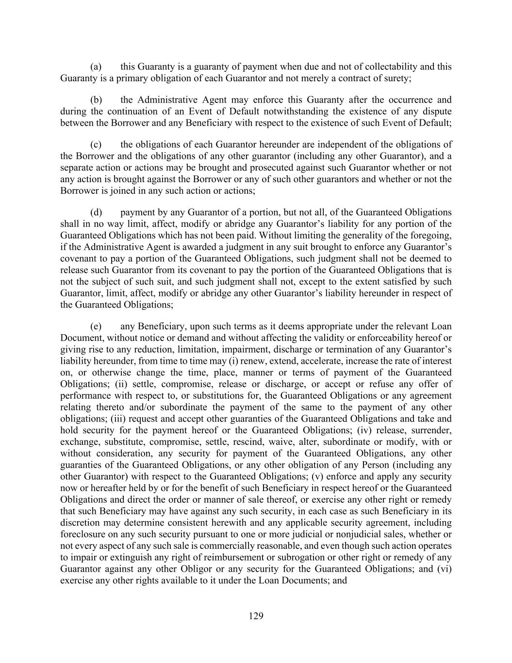 129 (a) this Guaranty is a guaranty of payment when due and not of collectability and this Guaranty is a primary obligation of each Guarantor and not merely a contract of surety; (b) the Administrative Agent may enforce this Guaranty after the occurrence and during the continuation of an Event of Default notwithstanding the existence of any dispute between the Borrower and any Beneficiary with respect to the existence of such Event of Default; (c) the obligations of each Guarantor hereunder are independent of the obligations of the Borrower and the obligations of any other guarantor (including any other Guarantor), and a separate action or actions may be brought and prosecuted against such Guarantor whether or not any action is brought against the Borrower or any of such other guarantors and whether or not the Borrower is joined in any such action or actions; (d) payment by any Guarantor of a portion, but not all, of the Guaranteed Obligations shall in no way limit, affect, modify or abridge any Guarantor’s liability for any portion of the Guaranteed Obligations which has not been paid. Without limiting the generality of the foregoing, if the Administrative Agent is awarded a judgment in any suit brought to enforce any Guarantor’s covenant to pay a portion of the Guaranteed Obligations, such judgment shall not be deemed to release such Guarantor from its covenant to pay the portion of the Guaranteed Obligations that is not the subject of such suit, and such judgment shall not, except to the extent satisfied by such Guarantor, limit, affect, modify or abridge any other Guarantor’s liability hereunder in respect of the Guaranteed Obligations; (e) any Beneficiary, upon such terms as it deems appropriate under the relevant Loan Document, without notice or demand and without affecting the validity or enforceability hereof or giving rise to any reduction, limitation, impairment, discharge or termination of any Guarantor’s liability hereunder, from time to time may (i) renew, extend, accelerate, increase the rate of interest on, or otherwise change the time, place, manner or terms of payment of the Guaranteed Obligations; (ii) settle, compromise, release or discharge, or accept or refuse any offer of performance with respect to, or substitutions for, the Guaranteed Obligations or any agreement relating thereto and/or subordinate the payment of the same to the payment of any other obligations; (iii) request and accept other guaranties of the Guaranteed Obligations and take and hold security for the payment hereof or the Guaranteed Obligations; (iv) release, surrender, exchange, substitute, compromise, settle, rescind, waive, alter, subordinate or modify, with or without consideration, any security for payment of the Guaranteed Obligations, any other guaranties of the Guaranteed Obligations, or any other obligation of any Person (including any other Guarantor) with respect to the Guaranteed Obligations; (v) enforce and apply any security now or hereafter held by or for the benefit of such Beneficiary in respect hereof or the Guaranteed Obligations and direct the order or manner of sale thereof, or exercise any other right or remedy that such Beneficiary may have against any such security, in each case as such Beneficiary in its discretion may determine consistent herewith and any applicable security agreement, including foreclosure on any such security pursuant to one or more judicial or nonjudicial sales, whether or not every aspect of any such sale is commercially reasonable, and even though such action operates to impair or extinguish any right of reimbursement or subrogation or other right or remedy of any Guarantor against any other Obligor or any security for the Guaranteed Obligations; and (vi) exercise any other rights available to it under the Loan Documents; and