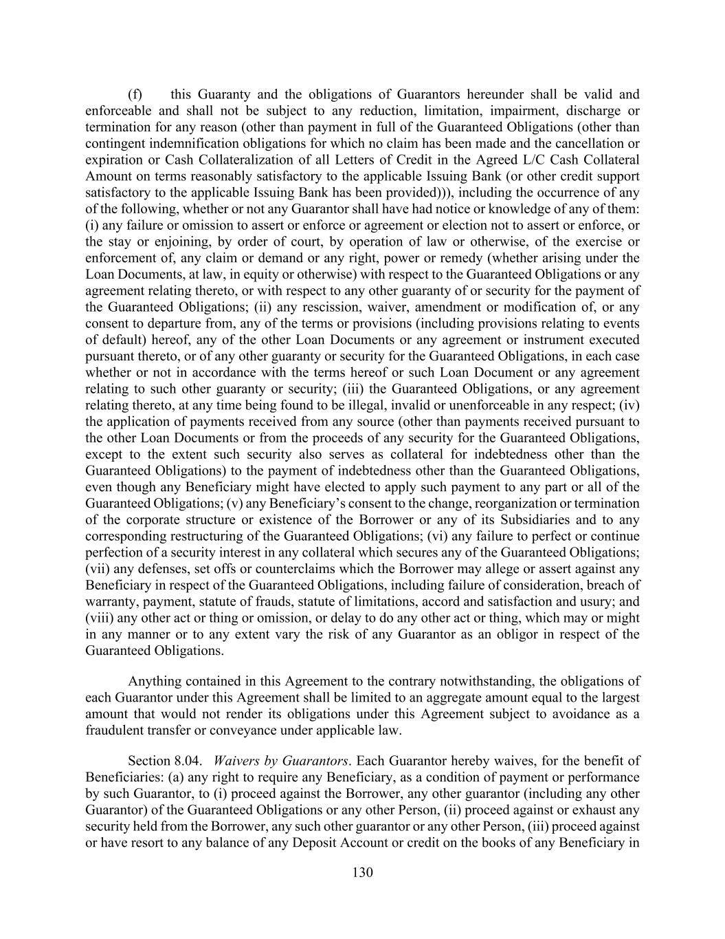 130 (f) this Guaranty and the obligations of Guarantors hereunder shall be valid and enforceable and shall not be subject to any reduction, limitation, impairment, discharge or termination for any reason (other than payment in full of the Guaranteed Obligations (other than contingent indemnification obligations for which no claim has been made and the cancellation or expiration or Cash Collateralization of all Letters of Credit in the Agreed L/C Cash Collateral Amount on terms reasonably satisfactory to the applicable Issuing Bank (or other credit support satisfactory to the applicable Issuing Bank has been provided))), including the occurrence of any of the following, whether or not any Guarantor shall have had notice or knowledge of any of them: (i) any failure or omission to assert or enforce or agreement or election not to assert or enforce, or the stay or enjoining, by order of court, by operation of law or otherwise, of the exercise or enforcement of, any claim or demand or any right, power or remedy (whether arising under the Loan Documents, at law, in equity or otherwise) with respect to the Guaranteed Obligations or any agreement relating thereto, or with respect to any other guaranty of or security for the payment of the Guaranteed Obligations; (ii) any rescission, waiver, amendment or modification of, or any consent to departure from, any of the terms or provisions (including provisions relating to events of default) hereof, any of the other Loan Documents or any agreement or instrument executed pursuant thereto, or of any other guaranty or security for the Guaranteed Obligations, in each case whether or not in accordance with the terms hereof or such Loan Document or any agreement relating to such other guaranty or security; (iii) the Guaranteed Obligations, or any agreement relating thereto, at any time being found to be illegal, invalid or unenforceable in any respect; (iv) the application of payments received from any source (other than payments received pursuant to the other Loan Documents or from the proceeds of any security for the Guaranteed Obligations, except to the extent such security also serves as collateral for indebtedness other than the Guaranteed Obligations) to the payment of indebtedness other than the Guaranteed Obligations, even though any Beneficiary might have elected to apply such payment to any part or all of the Guaranteed Obligations; (v) any Beneficiary’s consent to the change, reorganization or termination of the corporate structure or existence of the Borrower or any of its Subsidiaries and to any corresponding restructuring of the Guaranteed Obligations; (vi) any failure to perfect or continue perfection of a security interest in any collateral which secures any of the Guaranteed Obligations; (vii) any defenses, set offs or counterclaims which the Borrower may allege or assert against any Beneficiary in respect of the Guaranteed Obligations, including failure of consideration, breach of warranty, payment, statute of frauds, statute of limitations, accord and satisfaction and usury; and (viii) any other act or thing or omission, or delay to do any other act or thing, which may or might in any manner or to any extent vary the risk of any Guarantor as an obligor in respect of the Guaranteed Obligations. Anything contained in this Agreement to the contrary notwithstanding, the obligations of each Guarantor under this Agreement shall be limited to an aggregate amount equal to the largest amount that would not render its obligations under this Agreement subject to avoidance as a fraudulent transfer or conveyance under applicable law. Section 8.04. Waivers by Guarantors. Each Guarantor hereby waives, for the benefit of Beneficiaries: (a) any right to require any Beneficiary, as a condition of payment or performance by such Guarantor, to (i) proceed against the Borrower, any other guarantor (including any other Guarantor) of the Guaranteed Obligations or any other Person, (ii) proceed against or exhaust any security held from the Borrower, any such other guarantor or any other Person, (iii) proceed against or have resort to any balance of any Deposit Account or credit on the books of any Beneficiary in