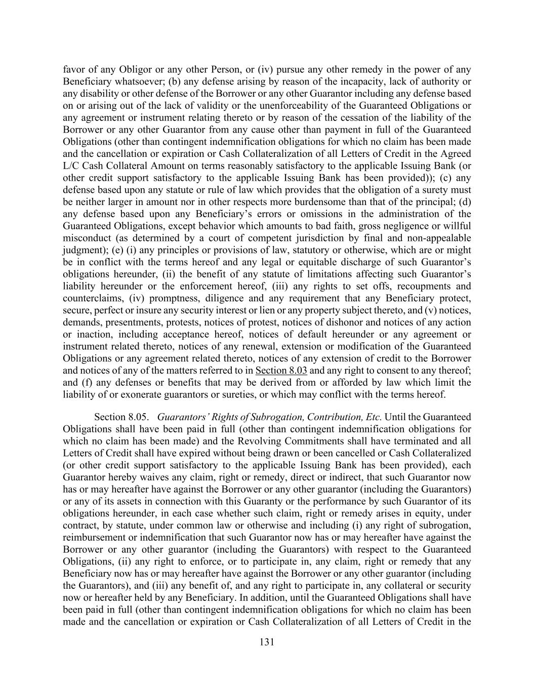 131 favor of any Obligor or any other Person, or (iv) pursue any other remedy in the power of any Beneficiary whatsoever; (b) any defense arising by reason of the incapacity, lack of authority or any disability or other defense of the Borrower or any other Guarantor including any defense based on or arising out of the lack of validity or the unenforceability of the Guaranteed Obligations or any agreement or instrument relating thereto or by reason of the cessation of the liability of the Borrower or any other Guarantor from any cause other than payment in full of the Guaranteed Obligations (other than contingent indemnification obligations for which no claim has been made and the cancellation or expiration or Cash Collateralization of all Letters of Credit in the Agreed L/C Cash Collateral Amount on terms reasonably satisfactory to the applicable Issuing Bank (or other credit support satisfactory to the applicable Issuing Bank has been provided)); (c) any defense based upon any statute or rule of law which provides that the obligation of a surety must be neither larger in amount nor in other respects more burdensome than that of the principal; (d) any defense based upon any Beneficiary’s errors or omissions in the administration of the Guaranteed Obligations, except behavior which amounts to bad faith, gross negligence or willful misconduct (as determined by a court of competent jurisdiction by final and non-appealable judgment); (e) (i) any principles or provisions of law, statutory or otherwise, which are or might be in conflict with the terms hereof and any legal or equitable discharge of such Guarantor’s obligations hereunder, (ii) the benefit of any statute of limitations affecting such Guarantor’s liability hereunder or the enforcement hereof, (iii) any rights to set offs, recoupments and counterclaims, (iv) promptness, diligence and any requirement that any Beneficiary protect, secure, perfect or insure any security interest or lien or any property subject thereto, and (v) notices, demands, presentments, protests, notices of protest, notices of dishonor and notices of any action or inaction, including acceptance hereof, notices of default hereunder or any agreement or instrument related thereto, notices of any renewal, extension or modification of the Guaranteed Obligations or any agreement related thereto, notices of any extension of credit to the Borrower and notices of any of the matters referred to in Section 8.03 and any right to consent to any thereof; and (f) any defenses or benefits that may be derived from or afforded by law which limit the liability of or exonerate guarantors or sureties, or which may conflict with the terms hereof. Section 8.05. Guarantors’ Rights of Subrogation, Contribution, Etc. Until the Guaranteed Obligations shall have been paid in full (other than contingent indemnification obligations for which no claim has been made) and the Revolving Commitments shall have terminated and all Letters of Credit shall have expired without being drawn or been cancelled or Cash Collateralized (or other credit support satisfactory to the applicable Issuing Bank has been provided), each Guarantor hereby waives any claim, right or remedy, direct or indirect, that such Guarantor now has or may hereafter have against the Borrower or any other guarantor (including the Guarantors) or any of its assets in connection with this Guaranty or the performance by such Guarantor of its obligations hereunder, in each case whether such claim, right or remedy arises in equity, under contract, by statute, under common law or otherwise and including (i) any right of subrogation, reimbursement or indemnification that such Guarantor now has or may hereafter have against the Borrower or any other guarantor (including the Guarantors) with respect to the Guaranteed Obligations, (ii) any right to enforce, or to participate in, any claim, right or remedy that any Beneficiary now has or may hereafter have against the Borrower or any other guarantor (including the Guarantors), and (iii) any benefit of, and any right to participate in, any collateral or security now or hereafter held by any Beneficiary. In addition, until the Guaranteed Obligations shall have been paid in full (other than contingent indemnification obligations for which no claim has been made and the cancellation or expiration or Cash Collateralization of all Letters of Credit in the