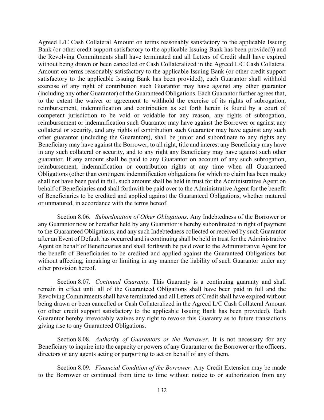 132 Agreed L/C Cash Collateral Amount on terms reasonably satisfactory to the applicable Issuing Bank (or other credit support satisfactory to the applicable Issuing Bank has been provided)) and the Revolving Commitments shall have terminated and all Letters of Credit shall have expired without being drawn or been cancelled or Cash Collateralized in the Agreed L/C Cash Collateral Amount on terms reasonably satisfactory to the applicable Issuing Bank (or other credit support satisfactory to the applicable Issuing Bank has been provided), each Guarantor shall withhold exercise of any right of contribution such Guarantor may have against any other guarantor (including any other Guarantor) of the Guaranteed Obligations. Each Guarantor further agrees that, to the extent the waiver or agreement to withhold the exercise of its rights of subrogation, reimbursement, indemnification and contribution as set forth herein is found by a court of competent jurisdiction to be void or voidable for any reason, any rights of subrogation, reimbursement or indemnification such Guarantor may have against the Borrower or against any collateral or security, and any rights of contribution such Guarantor may have against any such other guarantor (including the Guarantors), shall be junior and subordinate to any rights any Beneficiary may have against the Borrower, to all right, title and interest any Beneficiary may have in any such collateral or security, and to any right any Beneficiary may have against such other guarantor. If any amount shall be paid to any Guarantor on account of any such subrogation, reimbursement, indemnification or contribution rights at any time when all Guaranteed Obligations (other than contingent indemnification obligations for which no claim has been made) shall not have been paid in full, such amount shall be held in trust for the Administrative Agent on behalf of Beneficiaries and shall forthwith be paid over to the Administrative Agent for the benefit of Beneficiaries to be credited and applied against the Guaranteed Obligations, whether matured or unmatured, in accordance with the terms hereof. Section 8.06. Subordination of Other Obligations. Any Indebtedness of the Borrower or any Guarantor now or hereafter held by any Guarantor is hereby subordinated in right of payment to the Guaranteed Obligations, and any such Indebtedness collected or received by such Guarantor after an Event of Default has occurred and is continuing shall be held in trust for the Administrative Agent on behalf of Beneficiaries and shall forthwith be paid over to the Administrative Agent for the benefit of Beneficiaries to be credited and applied against the Guaranteed Obligations but without affecting, impairing or limiting in any manner the liability of such Guarantor under any other provision hereof. Section 8.07. Continual Guaranty. This Guaranty is a continuing guaranty and shall remain in effect until all of the Guaranteed Obligations shall have been paid in full and the Revolving Commitments shall have terminated and all Letters of Credit shall have expired without being drawn or been cancelled or Cash Collateralized in the Agreed L/C Cash Collateral Amount (or other credit support satisfactory to the applicable Issuing Bank has been provided). Each Guarantor hereby irrevocably waives any right to revoke this Guaranty as to future transactions giving rise to any Guaranteed Obligations. Section 8.08. Authority of Guarantors or the Borrower. It is not necessary for any Beneficiary to inquire into the capacity or powers of any Guarantor or the Borrower or the officers, directors or any agents acting or purporting to act on behalf of any of them. Section 8.09. Financial Condition of the Borrower. Any Credit Extension may be made to the Borrower or continued from time to time without notice to or authorization from any