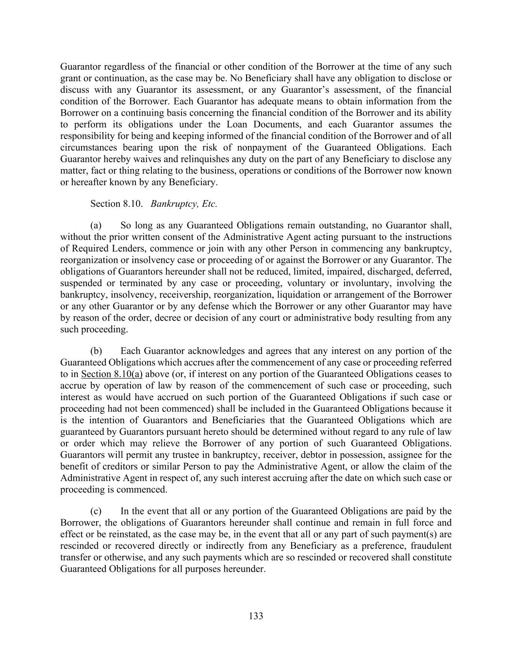 133 Guarantor regardless of the financial or other condition of the Borrower at the time of any such grant or continuation, as the case may be. No Beneficiary shall have any obligation to disclose or discuss with any Guarantor its assessment, or any Guarantor’s assessment, of the financial condition of the Borrower. Each Guarantor has adequate means to obtain information from the Borrower on a continuing basis concerning the financial condition of the Borrower and its ability to perform its obligations under the Loan Documents, and each Guarantor assumes the responsibility for being and keeping informed of the financial condition of the Borrower and of all circumstances bearing upon the risk of nonpayment of the Guaranteed Obligations. Each Guarantor hereby waives and relinquishes any duty on the part of any Beneficiary to disclose any matter, fact or thing relating to the business, operations or conditions of the Borrower now known or hereafter known by any Beneficiary. Section 8.10. Bankruptcy, Etc. (a) So long as any Guaranteed Obligations remain outstanding, no Guarantor shall, without the prior written consent of the Administrative Agent acting pursuant to the instructions of Required Lenders, commence or join with any other Person in commencing any bankruptcy, reorganization or insolvency case or proceeding of or against the Borrower or any Guarantor. The obligations of Guarantors hereunder shall not be reduced, limited, impaired, discharged, deferred, suspended or terminated by any case or proceeding, voluntary or involuntary, involving the bankruptcy, insolvency, receivership, reorganization, liquidation or arrangement of the Borrower or any other Guarantor or by any defense which the Borrower or any other Guarantor may have by reason of the order, decree or decision of any court or administrative body resulting from any such proceeding. (b) Each Guarantor acknowledges and agrees that any interest on any portion of the Guaranteed Obligations which accrues after the commencement of any case or proceeding referred to in Section 8.10(a) above (or, if interest on any portion of the Guaranteed Obligations ceases to accrue by operation of law by reason of the commencement of such case or proceeding, such interest as would have accrued on such portion of the Guaranteed Obligations if such case or proceeding had not been commenced) shall be included in the Guaranteed Obligations because it is the intention of Guarantors and Beneficiaries that the Guaranteed Obligations which are guaranteed by Guarantors pursuant hereto should be determined without regard to any rule of law or order which may relieve the Borrower of any portion of such Guaranteed Obligations. Guarantors will permit any trustee in bankruptcy, receiver, debtor in possession, assignee for the benefit of creditors or similar Person to pay the Administrative Agent, or allow the claim of the Administrative Agent in respect of, any such interest accruing after the date on which such case or proceeding is commenced. (c) In the event that all or any portion of the Guaranteed Obligations are paid by the Borrower, the obligations of Guarantors hereunder shall continue and remain in full force and effect or be reinstated, as the case may be, in the event that all or any part of such payment(s) are rescinded or recovered directly or indirectly from any Beneficiary as a preference, fraudulent transfer or otherwise, and any such payments which are so rescinded or recovered shall constitute Guaranteed Obligations for all purposes hereunder.
