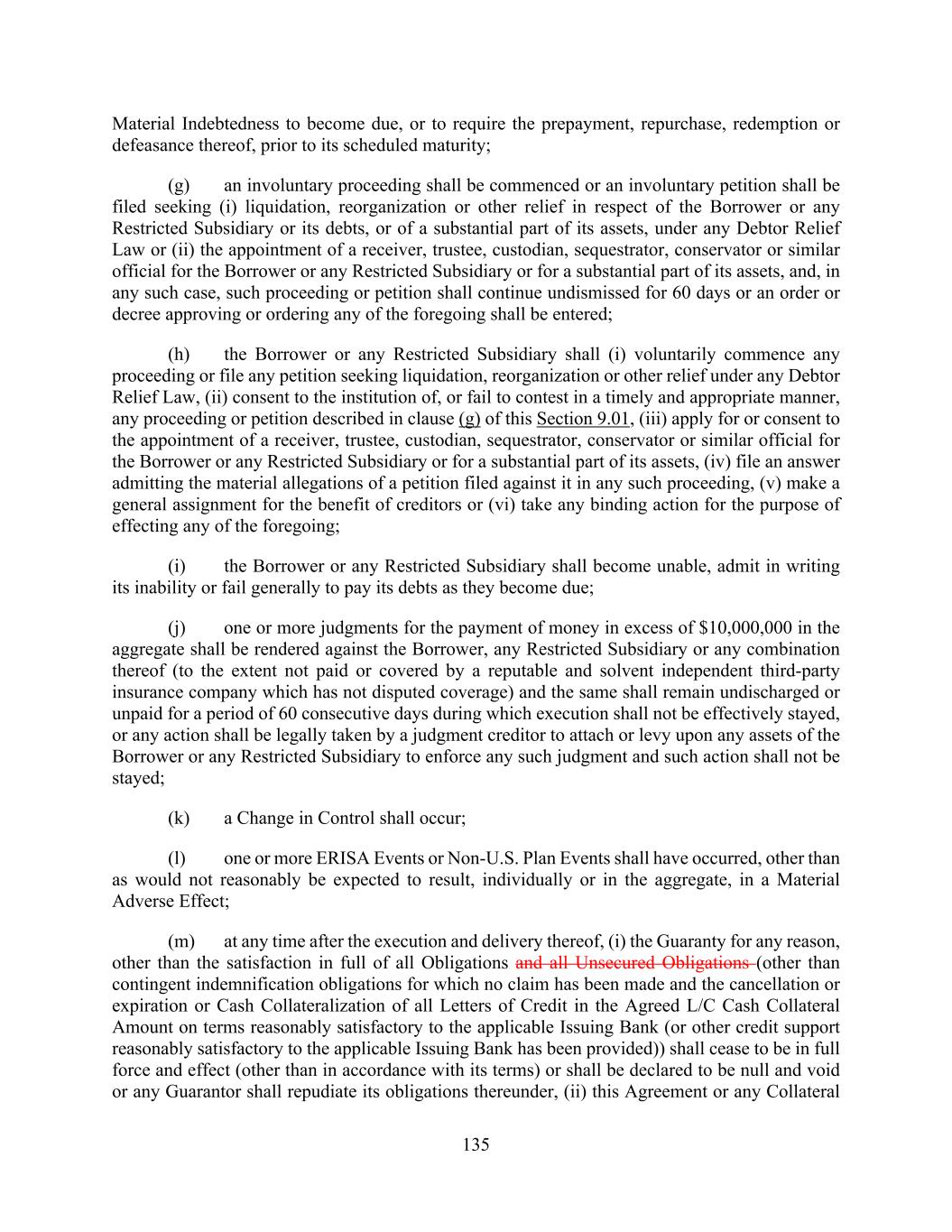135 Material Indebtedness to become due, or to require the prepayment, repurchase, redemption or defeasance thereof, prior to its scheduled maturity; (g) an involuntary proceeding shall be commenced or an involuntary petition shall be filed seeking (i) liquidation, reorganization or other relief in respect of the Borrower or any Restricted Subsidiary or its debts, or of a substantial part of its assets, under any Debtor Relief Law or (ii) the appointment of a receiver, trustee, custodian, sequestrator, conservator or similar official for the Borrower or any Restricted Subsidiary or for a substantial part of its assets, and, in any such case, such proceeding or petition shall continue undismissed for 60 days or an order or decree approving or ordering any of the foregoing shall be entered; (h) the Borrower or any Restricted Subsidiary shall (i) voluntarily commence any proceeding or file any petition seeking liquidation, reorganization or other relief under any Debtor Relief Law, (ii) consent to the institution of, or fail to contest in a timely and appropriate manner, any proceeding or petition described in clause (g) of this Section 9.01, (iii) apply for or consent to the appointment of a receiver, trustee, custodian, sequestrator, conservator or similar official for the Borrower or any Restricted Subsidiary or for a substantial part of its assets, (iv) file an answer admitting the material allegations of a petition filed against it in any such proceeding, (v) make a general assignment for the benefit of creditors or (vi) take any binding action for the purpose of effecting any of the foregoing; (i) the Borrower or any Restricted Subsidiary shall become unable, admit in writing its inability or fail generally to pay its debts as they become due; (j) one or more judgments for the payment of money in excess of $10,000,000 in the aggregate shall be rendered against the Borrower, any Restricted Subsidiary or any combination thereof (to the extent not paid or covered by a reputable and solvent independent third-party insurance company which has not disputed coverage) and the same shall remain undischarged or unpaid for a period of 60 consecutive days during which execution shall not be effectively stayed, or any action shall be legally taken by a judgment creditor to attach or levy upon any assets of the Borrower or any Restricted Subsidiary to enforce any such judgment and such action shall not be stayed; (k) a Change in Control shall occur; (l) one or more ERISA Events or Non-U.S. Plan Events shall have occurred, other than as would not reasonably be expected to result, individually or in the aggregate, in a Material Adverse Effect; (m) at any time after the execution and delivery thereof, (i) the Guaranty for any reason, other than the satisfaction in full of all Obligations and all Unsecured Obligations (other than contingent indemnification obligations for which no claim has been made and the cancellation or expiration or Cash Collateralization of all Letters of Credit in the Agreed L/C Cash Collateral Amount on terms reasonably satisfactory to the applicable Issuing Bank (or other credit support reasonably satisfactory to the applicable Issuing Bank has been provided)) shall cease to be in full force and effect (other than in accordance with its terms) or shall be declared to be null and void or any Guarantor shall repudiate its obligations thereunder, (ii) this Agreement or any Collateral