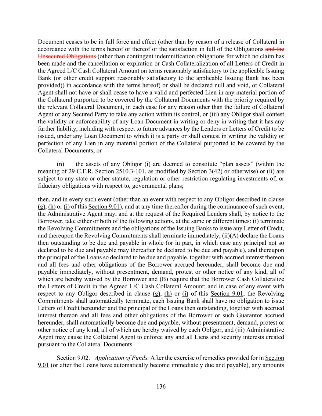 136 Document ceases to be in full force and effect (other than by reason of a release of Collateral in accordance with the terms hereof or thereof or the satisfaction in full of the Obligations and the Unsecured Obligations (other than contingent indemnification obligations for which no claim has been made and the cancellation or expiration or Cash Collateralization of all Letters of Credit in the Agreed L/C Cash Collateral Amount on terms reasonably satisfactory to the applicable Issuing Bank (or other credit support reasonably satisfactory to the applicable Issuing Bank has been provided)) in accordance with the terms hereof) or shall be declared null and void, or Collateral Agent shall not have or shall cease to have a valid and perfected Lien in any material portion of the Collateral purported to be covered by the Collateral Documents with the priority required by the relevant Collateral Document, in each case for any reason other than the failure of Collateral Agent or any Secured Party to take any action within its control, or (iii) any Obligor shall contest the validity or enforceability of any Loan Document in writing or deny in writing that it has any further liability, including with respect to future advances by the Lenders or Letters of Credit to be issued, under any Loan Document to which it is a party or shall contest in writing the validity or perfection of any Lien in any material portion of the Collateral purported to be covered by the Collateral Documents; or (n) the assets of any Obligor (i) are deemed to constitute “plan assets” (within the meaning of 29 C.F.R. Section 2510.3-101, as modified by Section 3(42) or otherwise) or (ii) are subject to any state or other statute, regulation or other restriction regulating investments of, or fiduciary obligations with respect to, governmental plans; then, and in every such event (other than an event with respect to any Obligor described in clause (g), (h) or (i) of this Section 9.01), and at any time thereafter during the continuance of such event, the Administrative Agent may, and at the request of the Required Lenders shall, by notice to the Borrower, take either or both of the following actions, at the same or different times: (i) terminate the Revolving Commitments and the obligations of the Issuing Banks to issue any Letter of Credit, and thereupon the Revolving Commitments shall terminate immediately, (ii)(A) declare the Loans then outstanding to be due and payable in whole (or in part, in which case any principal not so declared to be due and payable may thereafter be declared to be due and payable), and thereupon the principal of the Loans so declared to be due and payable, together with accrued interest thereon and all fees and other obligations of the Borrower accrued hereunder, shall become due and payable immediately, without presentment, demand, protest or other notice of any kind, all of which are hereby waived by the Borrower and (B) require that the Borrower Cash Collateralize the Letters of Credit in the Agreed L/C Cash Collateral Amount; and in case of any event with respect to any Obligor described in clause (g), (h) or (i) of this Section 9.01, the Revolving Commitments shall automatically terminate, each Issuing Bank shall have no obligation to issue Letters of Credit hereunder and the principal of the Loans then outstanding, together with accrued interest thereon and all fees and other obligations of the Borrower or such Guarantor accrued hereunder, shall automatically become due and payable, without presentment, demand, protest or other notice of any kind, all of which are hereby waived by each Obligor, and (iii) Administrative Agent may cause the Collateral Agent to enforce any and all Liens and security interests created pursuant to the Collateral Documents. Section 9.02. Application of Funds. After the exercise of remedies provided for in Section 9.01 (or after the Loans have automatically become immediately due and payable), any amounts