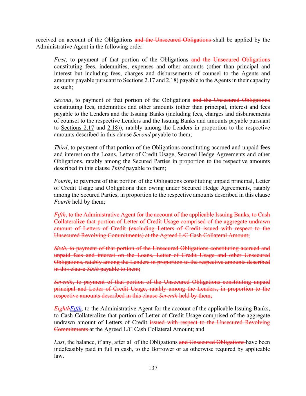 137 received on account of the Obligations and the Unsecured Obligations shall be applied by the Administrative Agent in the following order: First, to payment of that portion of the Obligations and the Unsecured Obligations constituting fees, indemnities, expenses and other amounts (other than principal and interest but including fees, charges and disbursements of counsel to the Agents and amounts payable pursuant to Sections 2.17 and 2.18) payable to the Agents in their capacity as such; Second, to payment of that portion of the Obligations and the Unsecured Obligations constituting fees, indemnities and other amounts (other than principal, interest and fees payable to the Lenders and the Issuing Banks (including fees, charges and disbursements of counsel to the respective Lenders and the Issuing Banks and amounts payable pursuant to Sections 2.17 and 2.18)), ratably among the Lenders in proportion to the respective amounts described in this clause Second payable to them; Third, to payment of that portion of the Obligations constituting accrued and unpaid fees and interest on the Loans, Letter of Credit Usage, Secured Hedge Agreements and other Obligations, ratably among the Secured Parties in proportion to the respective amounts described in this clause Third payable to them; Fourth, to payment of that portion of the Obligations constituting unpaid principal, Letter of Credit Usage and Obligations then owing under Secured Hedge Agreements, ratably among the Secured Parties, in proportion to the respective amounts described in this clause Fourth held by them; Fifth, to the Administrative Agent for the account of the applicable Issuing Banks, to Cash Collateralize that portion of Letter of Credit Usage comprised of the aggregate undrawn amount of Letters of Credit (excluding Letters of Credit issued with respect to the Unsecured Revolving Commitments) at the Agreed L/C Cash Collateral Amount; Sixth, to payment of that portion of the Unsecured Obligations constituting accrued and unpaid fees and interest on the Loans, Letter of Credit Usage and other Unsecured Obligations, ratably among the Lenders in proportion to the respective amounts described in this clause Sixth payable to them; Seventh, to payment of that portion of the Unsecured Obligations constituting unpaid principal and Letter of Credit Usage, ratably among the Lenders, in proportion to the respective amounts described in this clause Seventh held by them; EighthFifth, to the Administrative Agent for the account of the applicable Issuing Banks, to Cash Collateralize that portion of Letter of Credit Usage comprised of the aggregate undrawn amount of Letters of Credit issued with respect to the Unsecured Revolving Commitments at the Agreed L/C Cash Collateral Amount; and Last, the balance, if any, after all of the Obligations and Unsecured Obligations have been indefeasibly paid in full in cash, to the Borrower or as otherwise required by applicable law.