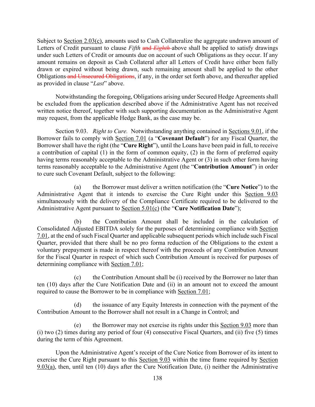 138 Subject to Section 2.03(c), amounts used to Cash Collateralize the aggregate undrawn amount of Letters of Credit pursuant to clause Fifth and Eighth above shall be applied to satisfy drawings under such Letters of Credit or amounts due on account of such Obligations as they occur. If any amount remains on deposit as Cash Collateral after all Letters of Credit have either been fully drawn or expired without being drawn, such remaining amount shall be applied to the other Obligations and Unsecured Obligations, if any, in the order set forth above, and thereafter applied as provided in clause “Last” above. Notwithstanding the foregoing, Obligations arising under Secured Hedge Agreements shall be excluded from the application described above if the Administrative Agent has not received written notice thereof, together with such supporting documentation as the Administrative Agent may request, from the applicable Hedge Bank, as the case may be. Section 9.03. Right to Cure. Notwithstanding anything contained in Sections 9.01, if the Borrower fails to comply with Section 7.01 (a “Covenant Default”) for any Fiscal Quarter, the Borrower shall have the right (the “Cure Right”), until the Loans have been paid in full, to receive a contribution of capital (1) in the form of common equity, (2) in the form of preferred equity having terms reasonably acceptable to the Administrative Agent or (3) in such other form having terms reasonably acceptable to the Administrative Agent (the “Contribution Amount”) in order to cure such Covenant Default, subject to the following: (a) the Borrower must deliver a written notification (the “Cure Notice”) to the Administrative Agent that it intends to exercise the Cure Right under this Section 9.03 simultaneously with the delivery of the Compliance Certificate required to be delivered to the Administrative Agent pursuant to Section 5.01(c) (the “Cure Notification Date”); (b) the Contribution Amount shall be included in the calculation of Consolidated Adjusted EBITDA solely for the purposes of determining compliance with Section 7.01, at the end of such Fiscal Quarter and applicable subsequent periods which include such Fiscal Quarter, provided that there shall be no pro forma reduction of the Obligations to the extent a voluntary prepayment is made in respect thereof with the proceeds of any Contribution Amount for the Fiscal Quarter in respect of which such Contribution Amount is received for purposes of determining compliance with Section 7.01; (c) the Contribution Amount shall be (i) received by the Borrower no later than ten (10) days after the Cure Notification Date and (ii) in an amount not to exceed the amount required to cause the Borrower to be in compliance with Section 7.01; (d) the issuance of any Equity Interests in connection with the payment of the Contribution Amount to the Borrower shall not result in a Change in Control; and (e) the Borrower may not exercise its rights under this Section 9.03 more than (i) two (2) times during any period of four (4) consecutive Fiscal Quarters, and (ii) five (5) times during the term of this Agreement. Upon the Administrative Agent’s receipt of the Cure Notice from Borrower of its intent to exercise the Cure Right pursuant to this Section 9.03 within the time frame required by Section 9.03(a), then, until ten (10) days after the Cure Notification Date, (i) neither the Administrative