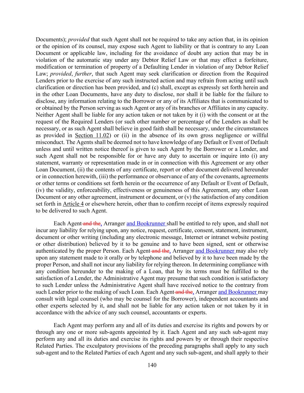 140 Documents); provided that such Agent shall not be required to take any action that, in its opinion or the opinion of its counsel, may expose such Agent to liability or that is contrary to any Loan Document or applicable law, including for the avoidance of doubt any action that may be in violation of the automatic stay under any Debtor Relief Law or that may effect a forfeiture, modification or termination of property of a Defaulting Lender in violation of any Debtor Relief Law; provided, further, that such Agent may seek clarification or direction from the Required Lenders prior to the exercise of any such instructed action and may refrain from acting until such clarification or direction has been provided, and (c) shall, except as expressly set forth herein and in the other Loan Documents, have any duty to disclose, nor shall it be liable for the failure to disclose, any information relating to the Borrower or any of its Affiliates that is communicated to or obtained by the Person serving as such Agent or any of its branches or Affiliates in any capacity. Neither Agent shall be liable for any action taken or not taken by it (i) with the consent or at the request of the Required Lenders (or such other number or percentage of the Lenders as shall be necessary, or as such Agent shall believe in good faith shall be necessary, under the circumstances as provided in Section 11.02) or (ii) in the absence of its own gross negligence or willful misconduct. The Agents shall be deemed not to have knowledge of any Default or Event of Default unless and until written notice thereof is given to such Agent by the Borrower or a Lender, and such Agent shall not be responsible for or have any duty to ascertain or inquire into (i) any statement, warranty or representation made in or in connection with this Agreement or any other Loan Document, (ii) the contents of any certificate, report or other document delivered hereunder or in connection herewith, (iii) the performance or observance of any of the covenants, agreements or other terms or conditions set forth herein or the occurrence of any Default or Event of Default, (iv) the validity, enforceability, effectiveness or genuineness of this Agreement, any other Loan Document or any other agreement, instrument or document, or (v) the satisfaction of any condition set forth in Article 4 or elsewhere herein, other than to confirm receipt of items expressly required to be delivered to such Agent. Each Agent and the, Arranger and Bookrunner shall be entitled to rely upon, and shall not incur any liability for relying upon, any notice, request, certificate, consent, statement, instrument, document or other writing (including any electronic message, Internet or intranet website posting or other distribution) believed by it to be genuine and to have been signed, sent or otherwise authenticated by the proper Person. Each Agent and the, Arranger and Bookrunner may also rely upon any statement made to it orally or by telephone and believed by it to have been made by the proper Person, and shall not incur any liability for relying thereon. In determining compliance with any condition hereunder to the making of a Loan, that by its terms must be fulfilled to the satisfaction of a Lender, the Administrative Agent may presume that such condition is satisfactory to such Lender unless the Administrative Agent shall have received notice to the contrary from such Lender prior to the making of such Loan. Each Agent and the, Arranger and Bookrunner may consult with legal counsel (who may be counsel for the Borrower), independent accountants and other experts selected by it, and shall not be liable for any action taken or not taken by it in accordance with the advice of any such counsel, accountants or experts. Each Agent may perform any and all of its duties and exercise its rights and powers by or through any one or more sub-agents appointed by it. Each Agent and any such sub-agent may perform any and all its duties and exercise its rights and powers by or through their respective Related Parties. The exculpatory provisions of the preceding paragraphs shall apply to any such sub-agent and to the Related Parties of each Agent and any such sub-agent, and shall apply to their