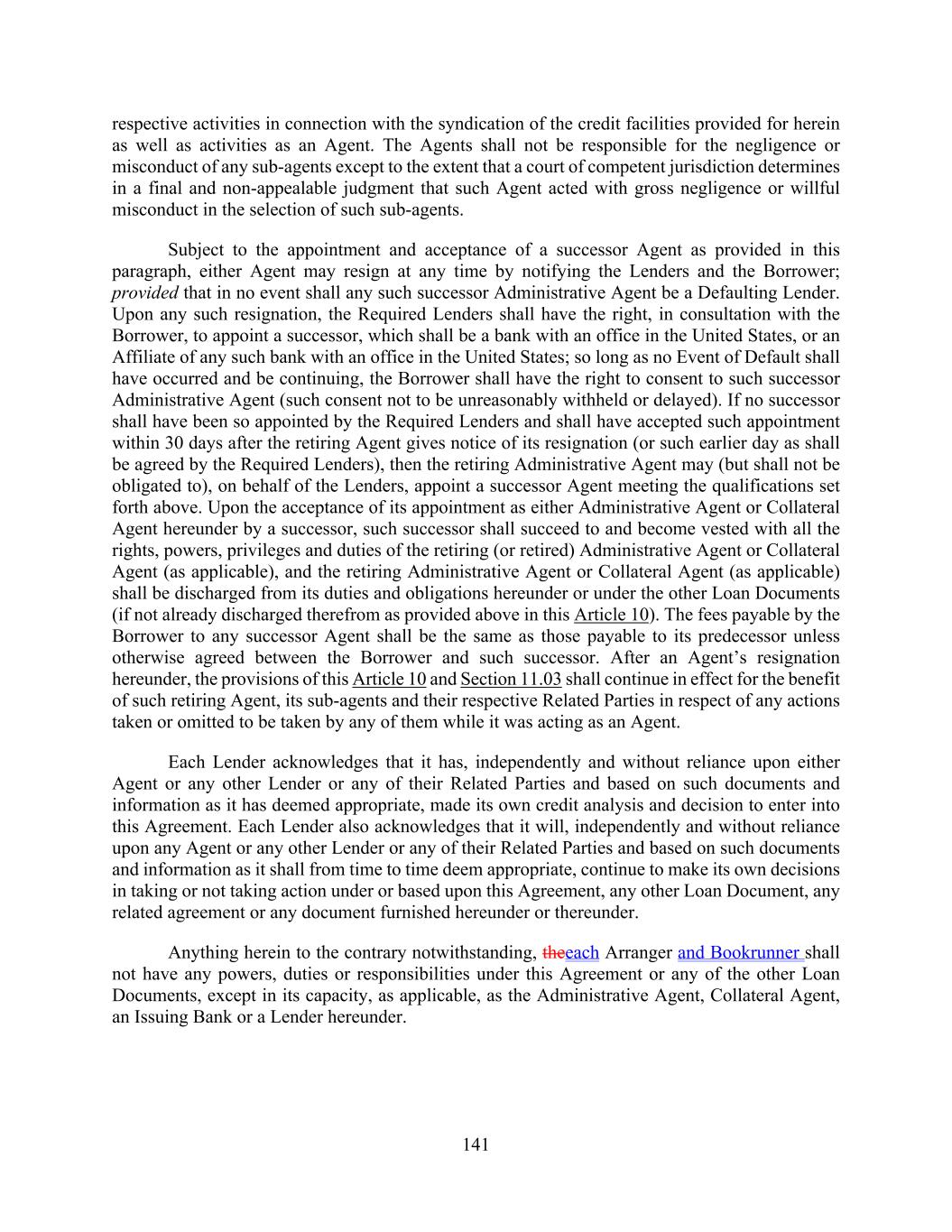 141 respective activities in connection with the syndication of the credit facilities provided for herein as well as activities as an Agent. The Agents shall not be responsible for the negligence or misconduct of any sub-agents except to the extent that a court of competent jurisdiction determines in a final and non-appealable judgment that such Agent acted with gross negligence or willful misconduct in the selection of such sub-agents. Subject to the appointment and acceptance of a successor Agent as provided in this paragraph, either Agent may resign at any time by notifying the Lenders and the Borrower; provided that in no event shall any such successor Administrative Agent be a Defaulting Lender. Upon any such resignation, the Required Lenders shall have the right, in consultation with the Borrower, to appoint a successor, which shall be a bank with an office in the United States, or an Affiliate of any such bank with an office in the United States; so long as no Event of Default shall have occurred and be continuing, the Borrower shall have the right to consent to such successor Administrative Agent (such consent not to be unreasonably withheld or delayed). If no successor shall have been so appointed by the Required Lenders and shall have accepted such appointment within 30 days after the retiring Agent gives notice of its resignation (or such earlier day as shall be agreed by the Required Lenders), then the retiring Administrative Agent may (but shall not be obligated to), on behalf of the Lenders, appoint a successor Agent meeting the qualifications set forth above. Upon the acceptance of its appointment as either Administrative Agent or Collateral Agent hereunder by a successor, such successor shall succeed to and become vested with all the rights, powers, privileges and duties of the retiring (or retired) Administrative Agent or Collateral Agent (as applicable), and the retiring Administrative Agent or Collateral Agent (as applicable) shall be discharged from its duties and obligations hereunder or under the other Loan Documents (if not already discharged therefrom as provided above in this Article 10). The fees payable by the Borrower to any successor Agent shall be the same as those payable to its predecessor unless otherwise agreed between the Borrower and such successor. After an Agent’s resignation hereunder, the provisions of this Article 10 and Section 11.03 shall continue in effect for the benefit of such retiring Agent, its sub-agents and their respective Related Parties in respect of any actions taken or omitted to be taken by any of them while it was acting as an Agent. Each Lender acknowledges that it has, independently and without reliance upon either Agent or any other Lender or any of their Related Parties and based on such documents and information as it has deemed appropriate, made its own credit analysis and decision to enter into this Agreement. Each Lender also acknowledges that it will, independently and without reliance upon any Agent or any other Lender or any of their Related Parties and based on such documents and information as it shall from time to time deem appropriate, continue to make its own decisions in taking or not taking action under or based upon this Agreement, any other Loan Document, any related agreement or any document furnished hereunder or thereunder. Anything herein to the contrary notwithstanding, theeach Arranger and Bookrunner shall not have any powers, duties or responsibilities under this Agreement or any of the other Loan Documents, except in its capacity, as applicable, as the Administrative Agent, Collateral Agent, an Issuing Bank or a Lender hereunder.