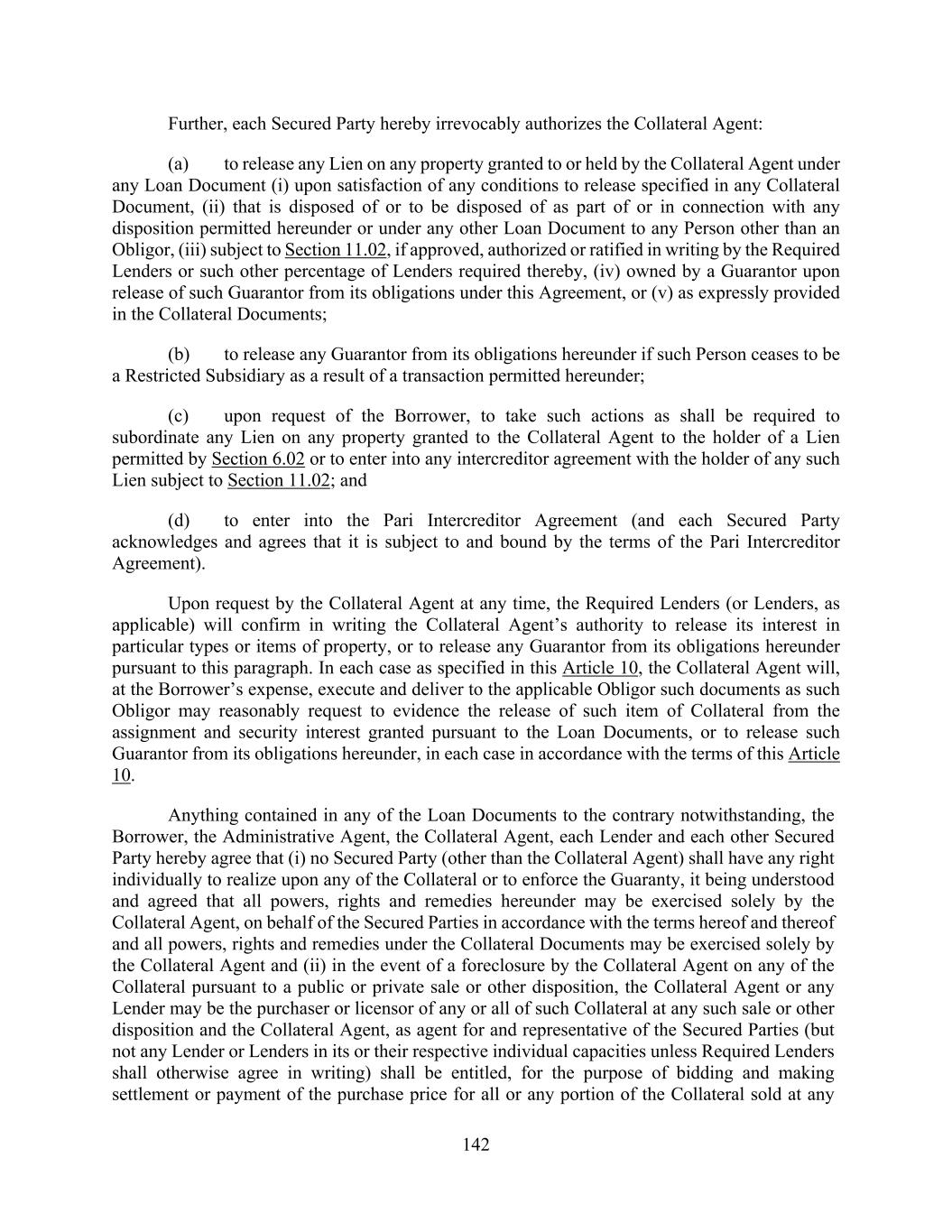142 Further, each Secured Party hereby irrevocably authorizes the Collateral Agent: (a) to release any Lien on any property granted to or held by the Collateral Agent under any Loan Document (i) upon satisfaction of any conditions to release specified in any Collateral Document, (ii) that is disposed of or to be disposed of as part of or in connection with any disposition permitted hereunder or under any other Loan Document to any Person other than an Obligor, (iii) subject to Section 11.02, if approved, authorized or ratified in writing by the Required Lenders or such other percentage of Lenders required thereby, (iv) owned by a Guarantor upon release of such Guarantor from its obligations under this Agreement, or (v) as expressly provided in the Collateral Documents; (b) to release any Guarantor from its obligations hereunder if such Person ceases to be a Restricted Subsidiary as a result of a transaction permitted hereunder; (c) upon request of the Borrower, to take such actions as shall be required to subordinate any Lien on any property granted to the Collateral Agent to the holder of a Lien permitted by Section 6.02 or to enter into any intercreditor agreement with the holder of any such Lien subject to Section 11.02; and (d) to enter into the Pari Intercreditor Agreement (and each Secured Party acknowledges and agrees that it is subject to and bound by the terms of the Pari Intercreditor Agreement). Upon request by the Collateral Agent at any time, the Required Lenders (or Lenders, as applicable) will confirm in writing the Collateral Agent’s authority to release its interest in particular types or items of property, or to release any Guarantor from its obligations hereunder pursuant to this paragraph. In each case as specified in this Article 10, the Collateral Agent will, at the Borrower’s expense, execute and deliver to the applicable Obligor such documents as such Obligor may reasonably request to evidence the release of such item of Collateral from the assignment and security interest granted pursuant to the Loan Documents, or to release such Guarantor from its obligations hereunder, in each case in accordance with the terms of this Article 10. Anything contained in any of the Loan Documents to the contrary notwithstanding, the Borrower, the Administrative Agent, the Collateral Agent, each Lender and each other Secured Party hereby agree that (i) no Secured Party (other than the Collateral Agent) shall have any right individually to realize upon any of the Collateral or to enforce the Guaranty, it being understood and agreed that all powers, rights and remedies hereunder may be exercised solely by the Collateral Agent, on behalf of the Secured Parties in accordance with the terms hereof and thereof and all powers, rights and remedies under the Collateral Documents may be exercised solely by the Collateral Agent and (ii) in the event of a foreclosure by the Collateral Agent on any of the Collateral pursuant to a public or private sale or other disposition, the Collateral Agent or any Lender may be the purchaser or licensor of any or all of such Collateral at any such sale or other disposition and the Collateral Agent, as agent for and representative of the Secured Parties (but not any Lender or Lenders in its or their respective individual capacities unless Required Lenders shall otherwise agree in writing) shall be entitled, for the purpose of bidding and making settlement or payment of the purchase price for all or any portion of the Collateral sold at any