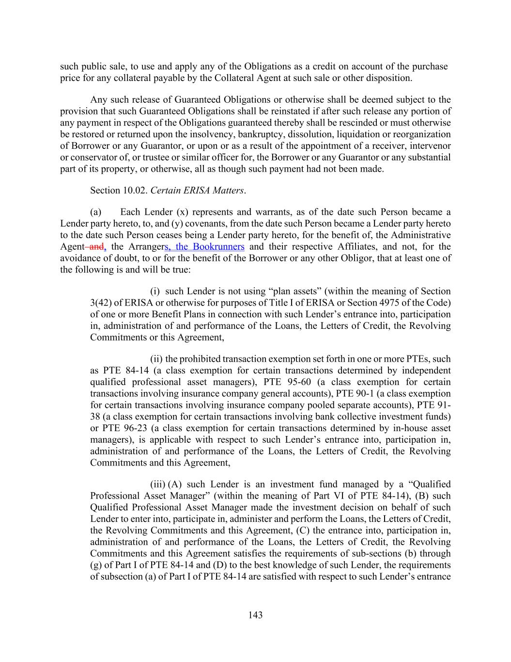143 such public sale, to use and apply any of the Obligations as a credit on account of the purchase price for any collateral payable by the Collateral Agent at such sale or other disposition. Any such release of Guaranteed Obligations or otherwise shall be deemed subject to the provision that such Guaranteed Obligations shall be reinstated if after such release any portion of any payment in respect of the Obligations guaranteed thereby shall be rescinded or must otherwise be restored or returned upon the insolvency, bankruptcy, dissolution, liquidation or reorganization of Borrower or any Guarantor, or upon or as a result of the appointment of a receiver, intervenor or conservator of, or trustee or similar officer for, the Borrower or any Guarantor or any substantial part of its property, or otherwise, all as though such payment had not been made. Section 10.02. Certain ERISA Matters. (a) Each Lender (x) represents and warrants, as of the date such Person became a Lender party hereto, to, and (y) covenants, from the date such Person became a Lender party hereto to the date such Person ceases being a Lender party hereto, for the benefit of, the Administrative Agent and, the Arrangers, the Bookrunners and their respective Affiliates, and not, for the avoidance of doubt, to or for the benefit of the Borrower or any other Obligor, that at least one of the following is and will be true: (i) such Lender is not using “plan assets” (within the meaning of Section 3(42) of ERISA or otherwise for purposes of Title I of ERISA or Section 4975 of the Code) of one or more Benefit Plans in connection with such Lender’s entrance into, participation in, administration of and performance of the Loans, the Letters of Credit, the Revolving Commitments or this Agreement, (ii) the prohibited transaction exemption set forth in one or more PTEs, such as PTE 84-14 (a class exemption for certain transactions determined by independent qualified professional asset managers), PTE 95-60 (a class exemption for certain transactions involving insurance company general accounts), PTE 90-1 (a class exemption for certain transactions involving insurance company pooled separate accounts), PTE 91- 38 (a class exemption for certain transactions involving bank collective investment funds) or PTE 96-23 (a class exemption for certain transactions determined by in-house asset managers), is applicable with respect to such Lender’s entrance into, participation in, administration of and performance of the Loans, the Letters of Credit, the Revolving Commitments and this Agreement, (iii) (A) such Lender is an investment fund managed by a “Qualified Professional Asset Manager” (within the meaning of Part VI of PTE 84-14), (B) such Qualified Professional Asset Manager made the investment decision on behalf of such Lender to enter into, participate in, administer and perform the Loans, the Letters of Credit, the Revolving Commitments and this Agreement, (C) the entrance into, participation in, administration of and performance of the Loans, the Letters of Credit, the Revolving Commitments and this Agreement satisfies the requirements of sub-sections (b) through (g) of Part I of PTE 84-14 and (D) to the best knowledge of such Lender, the requirements of subsection (a) of Part I of PTE 84-14 are satisfied with respect to such Lender’s entrance