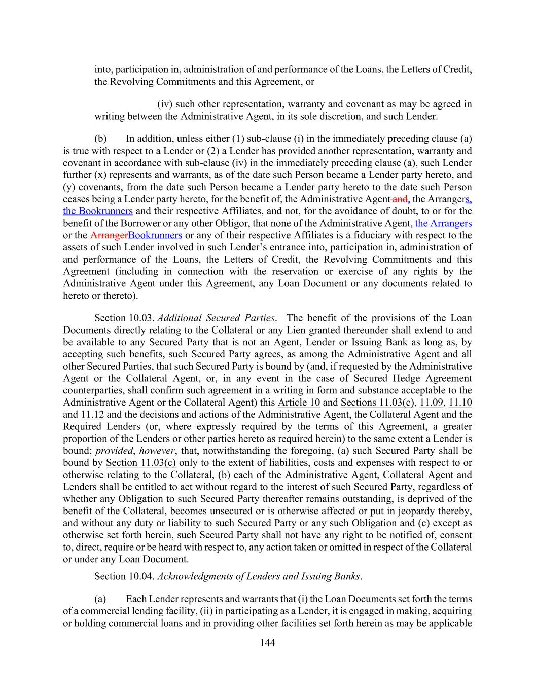 144 into, participation in, administration of and performance of the Loans, the Letters of Credit, the Revolving Commitments and this Agreement, or (iv) such other representation, warranty and covenant as may be agreed in writing between the Administrative Agent, in its sole discretion, and such Lender. (b) In addition, unless either (1) sub-clause (i) in the immediately preceding clause (a) is true with respect to a Lender or (2) a Lender has provided another representation, warranty and covenant in accordance with sub-clause (iv) in the immediately preceding clause (a), such Lender further (x) represents and warrants, as of the date such Person became a Lender party hereto, and (y) covenants, from the date such Person became a Lender party hereto to the date such Person ceases being a Lender party hereto, for the benefit of, the Administrative Agent and, the Arrangers, the Bookrunners and their respective Affiliates, and not, for the avoidance of doubt, to or for the benefit of the Borrower or any other Obligor, that none of the Administrative Agent, the Arrangers or the ArrangerBookrunners or any of their respective Affiliates is a fiduciary with respect to the assets of such Lender involved in such Lender’s entrance into, participation in, administration of and performance of the Loans, the Letters of Credit, the Revolving Commitments and this Agreement (including in connection with the reservation or exercise of any rights by the Administrative Agent under this Agreement, any Loan Document or any documents related to hereto or thereto). Section 10.03. Additional Secured Parties. The benefit of the provisions of the Loan Documents directly relating to the Collateral or any Lien granted thereunder shall extend to and be available to any Secured Party that is not an Agent, Lender or Issuing Bank as long as, by accepting such benefits, such Secured Party agrees, as among the Administrative Agent and all other Secured Parties, that such Secured Party is bound by (and, if requested by the Administrative Agent or the Collateral Agent, or, in any event in the case of Secured Hedge Agreement counterparties, shall confirm such agreement in a writing in form and substance acceptable to the Administrative Agent or the Collateral Agent) this Article 10 and Sections 11.03(c), 11.09, 11.10 and 11.12 and the decisions and actions of the Administrative Agent, the Collateral Agent and the Required Lenders (or, where expressly required by the terms of this Agreement, a greater proportion of the Lenders or other parties hereto as required herein) to the same extent a Lender is bound; provided, however, that, notwithstanding the foregoing, (a) such Secured Party shall be bound by Section 11.03(c) only to the extent of liabilities, costs and expenses with respect to or otherwise relating to the Collateral, (b) each of the Administrative Agent, Collateral Agent and Lenders shall be entitled to act without regard to the interest of such Secured Party, regardless of whether any Obligation to such Secured Party thereafter remains outstanding, is deprived of the benefit of the Collateral, becomes unsecured or is otherwise affected or put in jeopardy thereby, and without any duty or liability to such Secured Party or any such Obligation and (c) except as otherwise set forth herein, such Secured Party shall not have any right to be notified of, consent to, direct, require or be heard with respect to, any action taken or omitted in respect of the Collateral or under any Loan Document. Section 10.04. Acknowledgments of Lenders and Issuing Banks. (a) Each Lender represents and warrants that (i) the Loan Documents set forth the terms of a commercial lending facility, (ii) in participating as a Lender, it is engaged in making, acquiring or holding commercial loans and in providing other facilities set forth herein as may be applicable