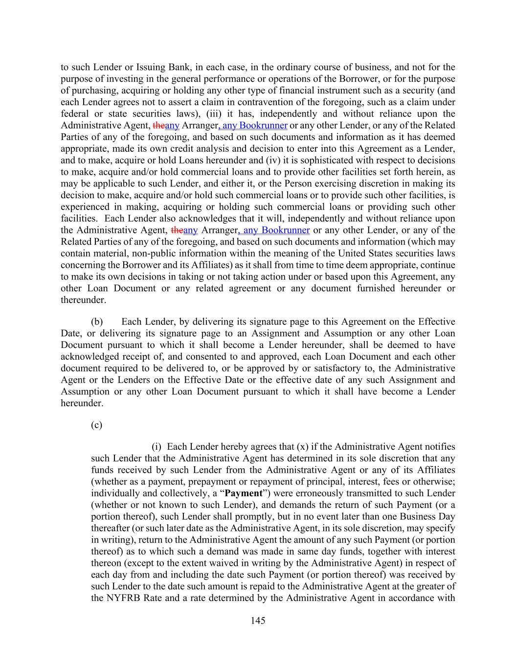 145 to such Lender or Issuing Bank, in each case, in the ordinary course of business, and not for the purpose of investing in the general performance or operations of the Borrower, or for the purpose of purchasing, acquiring or holding any other type of financial instrument such as a security (and each Lender agrees not to assert a claim in contravention of the foregoing, such as a claim under federal or state securities laws), (iii) it has, independently and without reliance upon the Administrative Agent, theany Arranger, any Bookrunner or any other Lender, or any of the Related Parties of any of the foregoing, and based on such documents and information as it has deemed appropriate, made its own credit analysis and decision to enter into this Agreement as a Lender, and to make, acquire or hold Loans hereunder and (iv) it is sophisticated with respect to decisions to make, acquire and/or hold commercial loans and to provide other facilities set forth herein, as may be applicable to such Lender, and either it, or the Person exercising discretion in making its decision to make, acquire and/or hold such commercial loans or to provide such other facilities, is experienced in making, acquiring or holding such commercial loans or providing such other facilities. Each Lender also acknowledges that it will, independently and without reliance upon the Administrative Agent, theany Arranger, any Bookrunner or any other Lender, or any of the Related Parties of any of the foregoing, and based on such documents and information (which may contain material, non-public information within the meaning of the United States securities laws concerning the Borrower and its Affiliates) as it shall from time to time deem appropriate, continue to make its own decisions in taking or not taking action under or based upon this Agreement, any other Loan Document or any related agreement or any document furnished hereunder or thereunder. (b) Each Lender, by delivering its signature page to this Agreement on the Effective Date, or delivering its signature page to an Assignment and Assumption or any other Loan Document pursuant to which it shall become a Lender hereunder, shall be deemed to have acknowledged receipt of, and consented to and approved, each Loan Document and each other document required to be delivered to, or be approved by or satisfactory to, the Administrative Agent or the Lenders on the Effective Date or the effective date of any such Assignment and Assumption or any other Loan Document pursuant to which it shall have become a Lender hereunder. (c) (i) Each Lender hereby agrees that (x) if the Administrative Agent notifies such Lender that the Administrative Agent has determined in its sole discretion that any funds received by such Lender from the Administrative Agent or any of its Affiliates (whether as a payment, prepayment or repayment of principal, interest, fees or otherwise; individually and collectively, a “Payment”) were erroneously transmitted to such Lender (whether or not known to such Lender), and demands the return of such Payment (or a portion thereof), such Lender shall promptly, but in no event later than one Business Day thereafter (or such later date as the Administrative Agent, in its sole discretion, may specify in writing), return to the Administrative Agent the amount of any such Payment (or portion thereof) as to which such a demand was made in same day funds, together with interest thereon (except to the extent waived in writing by the Administrative Agent) in respect of each day from and including the date such Payment (or portion thereof) was received by such Lender to the date such amount is repaid to the Administrative Agent at the greater of the NYFRB Rate and a rate determined by the Administrative Agent in accordance with