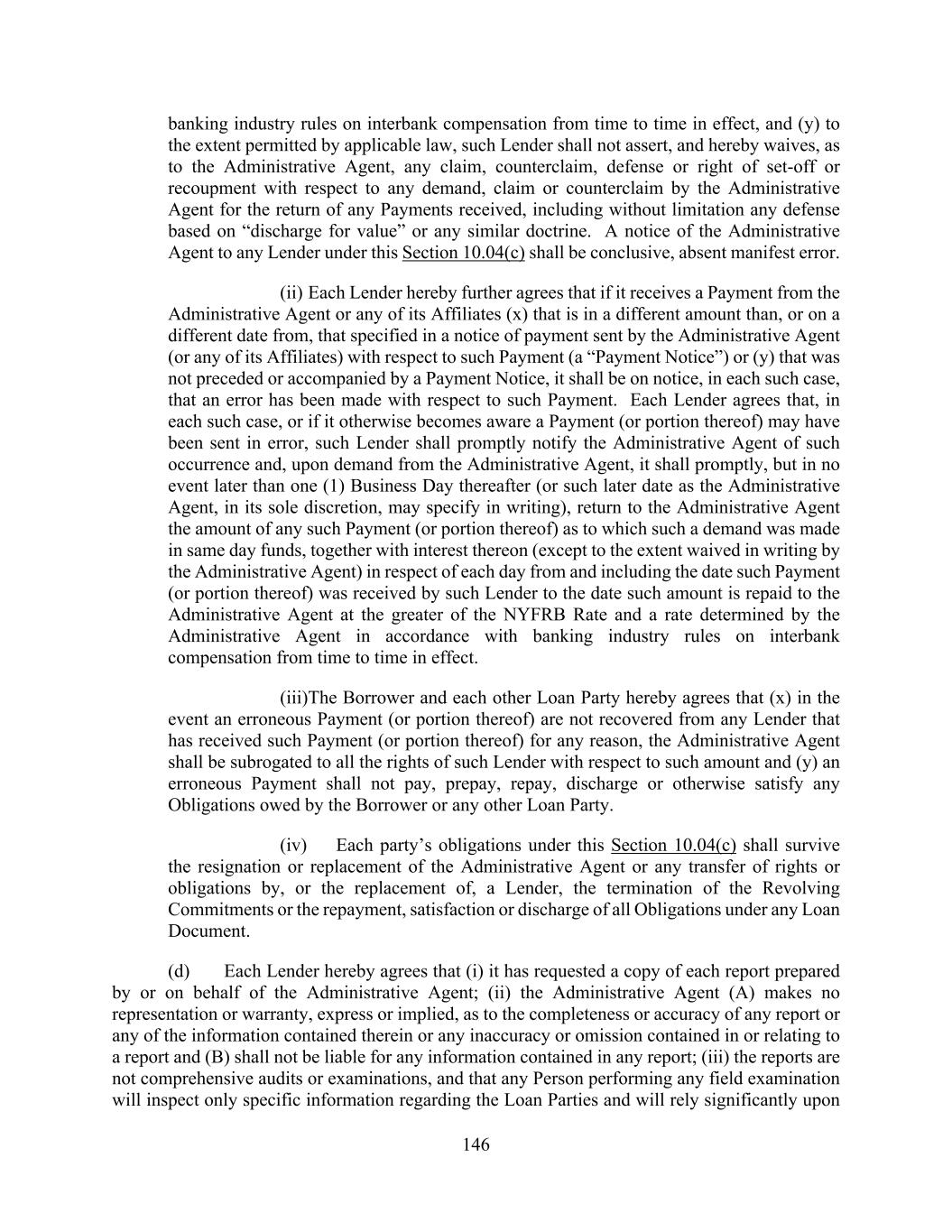 146 banking industry rules on interbank compensation from time to time in effect, and (y) to the extent permitted by applicable law, such Lender shall not assert, and hereby waives, as to the Administrative Agent, any claim, counterclaim, defense or right of set-off or recoupment with respect to any demand, claim or counterclaim by the Administrative Agent for the return of any Payments received, including without limitation any defense based on “discharge for value” or any similar doctrine. A notice of the Administrative Agent to any Lender under this Section 10.04(c) shall be conclusive, absent manifest error. (ii) Each Lender hereby further agrees that if it receives a Payment from the Administrative Agent or any of its Affiliates (x) that is in a different amount than, or on a different date from, that specified in a notice of payment sent by the Administrative Agent (or any of its Affiliates) with respect to such Payment (a “Payment Notice”) or (y) that was not preceded or accompanied by a Payment Notice, it shall be on notice, in each such case, that an error has been made with respect to such Payment. Each Lender agrees that, in each such case, or if it otherwise becomes aware a Payment (or portion thereof) may have been sent in error, such Lender shall promptly notify the Administrative Agent of such occurrence and, upon demand from the Administrative Agent, it shall promptly, but in no event later than one (1) Business Day thereafter (or such later date as the Administrative Agent, in its sole discretion, may specify in writing), return to the Administrative Agent the amount of any such Payment (or portion thereof) as to which such a demand was made in same day funds, together with interest thereon (except to the extent waived in writing by the Administrative Agent) in respect of each day from and including the date such Payment (or portion thereof) was received by such Lender to the date such amount is repaid to the Administrative Agent at the greater of the NYFRB Rate and a rate determined by the Administrative Agent in accordance with banking industry rules on interbank compensation from time to time in effect. (iii)The Borrower and each other Loan Party hereby agrees that (x) in the event an erroneous Payment (or portion thereof) are not recovered from any Lender that has received such Payment (or portion thereof) for any reason, the Administrative Agent shall be subrogated to all the rights of such Lender with respect to such amount and (y) an erroneous Payment shall not pay, prepay, repay, discharge or otherwise satisfy any Obligations owed by the Borrower or any other Loan Party. (iv) Each party’s obligations under this Section 10.04(c) shall survive the resignation or replacement of the Administrative Agent or any transfer of rights or obligations by, or the replacement of, a Lender, the termination of the Revolving Commitments or the repayment, satisfaction or discharge of all Obligations under any Loan Document. (d) Each Lender hereby agrees that (i) it has requested a copy of each report prepared by or on behalf of the Administrative Agent; (ii) the Administrative Agent (A) makes no representation or warranty, express or implied, as to the completeness or accuracy of any report or any of the information contained therein or any inaccuracy or omission contained in or relating to a report and (B) shall not be liable for any information contained in any report; (iii) the reports are not comprehensive audits or examinations, and that any Person performing any field examination will inspect only specific information regarding the Loan Parties and will rely significantly upon