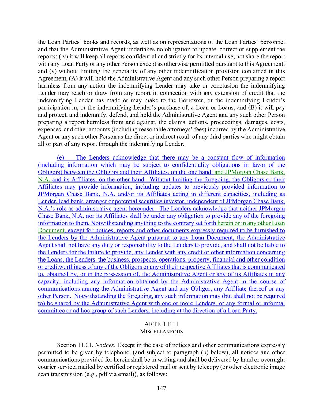 147 the Loan Parties’ books and records, as well as on representations of the Loan Parties’ personnel and that the Administrative Agent undertakes no obligation to update, correct or supplement the reports; (iv) it will keep all reports confidential and strictly for its internal use, not share the report with any Loan Party or any other Person except as otherwise permitted pursuant to this Agreement; and (v) without limiting the generality of any other indemnification provision contained in this Agreement, (A) it will hold the Administrative Agent and any such other Person preparing a report harmless from any action the indemnifying Lender may take or conclusion the indemnifying Lender may reach or draw from any report in connection with any extension of credit that the indemnifying Lender has made or may make to the Borrower, or the indemnifying Lender’s participation in, or the indemnifying Lender’s purchase of, a Loan or Loans; and (B) it will pay and protect, and indemnify, defend, and hold the Administrative Agent and any such other Person preparing a report harmless from and against, the claims, actions, proceedings, damages, costs, expenses, and other amounts (including reasonable attorneys’ fees) incurred by the Administrative Agent or any such other Person as the direct or indirect result of any third parties who might obtain all or part of any report through the indemnifying Lender. (e) The Lenders acknowledge that there may be a constant flow of information (including information which may be subject to confidentiality obligations in favor of the Obligors) between the Obligors and their Affiliates, on the one hand, and JPMorgan Chase Bank, N.A. and its Affiliates, on the other hand. Without limiting the foregoing, the Obligors or their Affiliates may provide information, including updates to previously provided information to JPMorgan Chase Bank, N.A. and/or its Affiliates acting in different capacities, including as Lender, lead bank, arranger or potential securities investor, independent of JPMorgan Chase Bank, N.A.’s role as administrative agent hereunder. The Lenders acknowledge that neither JPMorgan Chase Bank, N.A. nor its Affiliates shall be under any obligation to provide any of the foregoing information to them. Notwithstanding anything to the contrary set forth herein or in any other Loan Document, except for notices, reports and other documents expressly required to be furnished to the Lenders by the Administrative Agent pursuant to any Loan Document, the Administrative Agent shall not have any duty or responsibility to the Lenders to provide, and shall not be liable to the Lenders for the failure to provide, any Lender with any credit or other information concerning the Loans, the Lenders, the business, prospects, operations, property, financial and other condition or creditworthiness of any of the Obligors or any of their respective Affiliates that is communicated to, obtained by, or in the possession of, the Administrative Agent or any of its Affiliates in any capacity, including any information obtained by the Administrative Agent in the course of communications among the Administrative Agent and any Obligor, any Affiliate thereof or any other Person. Notwithstanding the foregoing, any such information may (but shall not be required to) be shared by the Administrative Agent with one or more Lenders, or any formal or informal committee or ad hoc group of such Lenders, including at the direction of a Loan Party. ARTICLE 11 MISCELLANEOUS Section 11.01. Notices. Except in the case of notices and other communications expressly permitted to be given by telephone, (and subject to paragraph (b) below), all notices and other communications provided for herein shall be in writing and shall be delivered by hand or overnight courier service, mailed by certified or registered mail or sent by telecopy (or other electronic image scan transmission (e.g., pdf via email)), as follows: