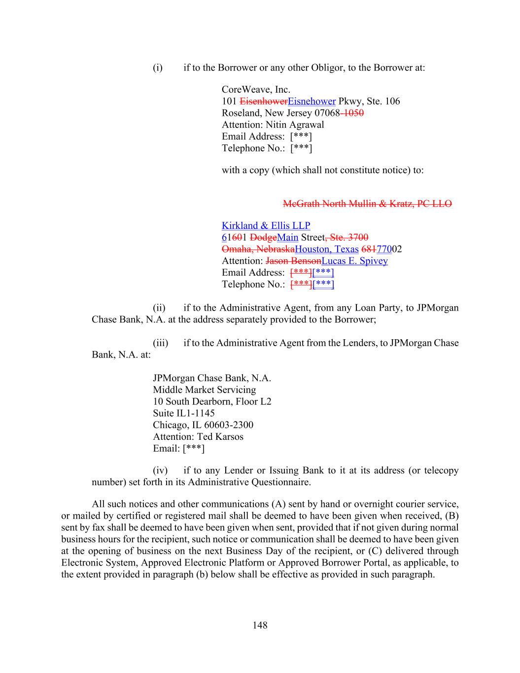 148 (i) if to the Borrower or any other Obligor, to the Borrower at: CoreWeave, Inc. 101 EisenhowerEisnehower Pkwy, Ste. 106 Roseland, New Jersey 07068-1050 Attention: Nitin Agrawal Email Address: [***] Telephone No.: [***] with a copy (which shall not constitute notice) to: McGrath North Mullin & Kratz, PC LLO Kirkland & Ellis LLP 61601 DodgeMain Street, Ste. 3700 Omaha, NebraskaHouston, Texas 68177002 Attention: Jason BensonLucas E. Spivey Email Address: [***][***] Telephone No.: [***][***] (ii) if to the Administrative Agent, from any Loan Party, to JPMorgan Chase Bank, N.A. at the address separately provided to the Borrower; (iii) if to the Administrative Agent from the Lenders, to JPMorgan Chase Bank, N.A. at: JPMorgan Chase Bank, N.A. Middle Market Servicing 10 South Dearborn, Floor L2 Suite IL1-1145 Chicago, IL 60603-2300 Attention: Ted Karsos Email: [***] (iv) if to any Lender or Issuing Bank to it at its address (or telecopy number) set forth in its Administrative Questionnaire. All such notices and other communications (A) sent by hand or overnight courier service, or mailed by certified or registered mail shall be deemed to have been given when received, (B) sent by fax shall be deemed to have been given when sent, provided that if not given during normal business hours for the recipient, such notice or communication shall be deemed to have been given at the opening of business on the next Business Day of the recipient, or (C) delivered through Electronic System, Approved Electronic Platform or Approved Borrower Portal, as applicable, to the extent provided in paragraph (b) below shall be effective as provided in such paragraph.