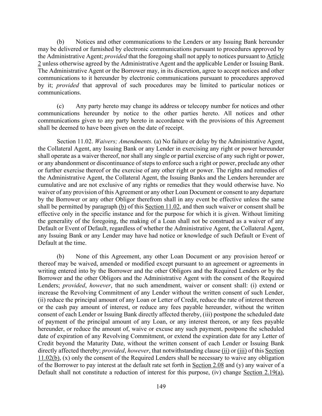 149 (b) Notices and other communications to the Lenders or any Issuing Bank hereunder may be delivered or furnished by electronic communications pursuant to procedures approved by the Administrative Agent; provided that the foregoing shall not apply to notices pursuant to Article 2 unless otherwise agreed by the Administrative Agent and the applicable Lender or Issuing Bank. The Administrative Agent or the Borrower may, in its discretion, agree to accept notices and other communications to it hereunder by electronic communications pursuant to procedures approved by it; provided that approval of such procedures may be limited to particular notices or communications. (c) Any party hereto may change its address or telecopy number for notices and other communications hereunder by notice to the other parties hereto. All notices and other communications given to any party hereto in accordance with the provisions of this Agreement shall be deemed to have been given on the date of receipt. Section 11.02. Waivers; Amendments. (a) No failure or delay by the Administrative Agent, the Collateral Agent, any Issuing Bank or any Lender in exercising any right or power hereunder shall operate as a waiver thereof, nor shall any single or partial exercise of any such right or power, or any abandonment or discontinuance of steps to enforce such a right or power, preclude any other or further exercise thereof or the exercise of any other right or power. The rights and remedies of the Administrative Agent, the Collateral Agent, the Issuing Banks and the Lenders hereunder are cumulative and are not exclusive of any rights or remedies that they would otherwise have. No waiver of any provision of this Agreement or any other Loan Document or consent to any departure by the Borrower or any other Obligor therefrom shall in any event be effective unless the same shall be permitted by paragraph (b) of this Section 11.02, and then such waiver or consent shall be effective only in the specific instance and for the purpose for which it is given. Without limiting the generality of the foregoing, the making of a Loan shall not be construed as a waiver of any Default or Event of Default, regardless of whether the Administrative Agent, the Collateral Agent, any Issuing Bank or any Lender may have had notice or knowledge of such Default or Event of Default at the time. (b) None of this Agreement, any other Loan Document or any provision hereof or thereof may be waived, amended or modified except pursuant to an agreement or agreements in writing entered into by the Borrower and the other Obligors and the Required Lenders or by the Borrower and the other Obligors and the Administrative Agent with the consent of the Required Lenders; provided, however, that no such amendment, waiver or consent shall: (i) extend or increase the Revolving Commitment of any Lender without the written consent of such Lender, (ii) reduce the principal amount of any Loan or Letter of Credit, reduce the rate of interest thereon or the cash pay amount of interest, or reduce any fees payable hereunder, without the written consent of each Lender or Issuing Bank directly affected thereby, (iii) postpone the scheduled date of payment of the principal amount of any Loan, or any interest thereon, or any fees payable hereunder, or reduce the amount of, waive or excuse any such payment, postpone the scheduled date of expiration of any Revolving Commitment, or extend the expiration date for any Letter of Credit beyond the Maturity Date, without the written consent of each Lender or Issuing Bank directly affected thereby; provided, however, that notwithstanding clause (ii) or (iii) of this Section 11.02(b), (x) only the consent of the Required Lenders shall be necessary to waive any obligation of the Borrower to pay interest at the default rate set forth in Section 2.08 and (y) any waiver of a Default shall not constitute a reduction of interest for this purpose, (iv) change Section 2.19(a),