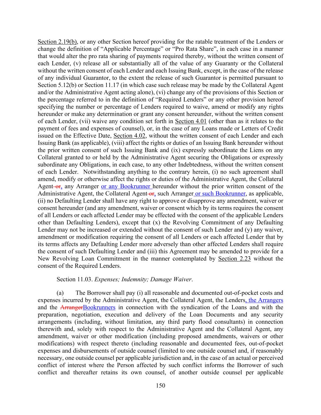 150 Section 2.19(b), or any other Section hereof providing for the ratable treatment of the Lenders or change the definition of “Applicable Percentage” or “Pro Rata Share”, in each case in a manner that would alter the pro rata sharing of payments required thereby, without the written consent of each Lender, (v) release all or substantially all of the value of any Guaranty or the Collateral without the written consent of each Lender and each Issuing Bank, except, in the case of the release of any individual Guarantor, to the extent the release of such Guarantor is permitted pursuant to Section 5.12(b) or Section 11.17 (in which case such release may be made by the Collateral Agent and/or the Administrative Agent acting alone), (vi) change any of the provisions of this Section or the percentage referred to in the definition of “Required Lenders” or any other provision hereof specifying the number or percentage of Lenders required to waive, amend or modify any rights hereunder or make any determination or grant any consent hereunder, without the written consent of each Lender, (vii) waive any condition set forth in Section 4.01 (other than as it relates to the payment of fees and expenses of counsel), or, in the case of any Loans made or Letters of Credit issued on the Effective Date, Section 4.02, without the written consent of each Lender and each Issuing Bank (as applicable), (viii) affect the rights or duties of an Issuing Bank hereunder without the prior written consent of such Issuing Bank and (ix) expressly subordinate the Liens on any Collateral granted to or held by the Administrative Agent securing the Obligations or expressly subordinate any Obligations, in each case, to any other Indebtedness, without the written consent of each Lender. Notwithstanding anything to the contrary herein, (i) no such agreement shall amend, modify or otherwise affect the rights or duties of the Administrative Agent, the Collateral Agent or, any Arranger or any Bookrunner hereunder without the prior written consent of the Administrative Agent, the Collateral Agent or, such Arranger or such Bookrunner, as applicable, (ii) no Defaulting Lender shall have any right to approve or disapprove any amendment, waiver or consent hereunder (and any amendment, waiver or consent which by its terms requires the consent of all Lenders or each affected Lender may be effected with the consent of the applicable Lenders other than Defaulting Lenders), except that (x) the Revolving Commitment of any Defaulting Lender may not be increased or extended without the consent of such Lender and (y) any waiver, amendment or modification requiring the consent of all Lenders or each affected Lender that by its terms affects any Defaulting Lender more adversely than other affected Lenders shall require the consent of such Defaulting Lender and (iii) this Agreement may be amended to provide for a New Revolving Loan Commitment in the manner contemplated by Section 2.23 without the consent of the Required Lenders. Section 11.03. Expenses; Indemnity; Damage Waiver. (a) The Borrower shall pay (i) all reasonable and documented out-of-pocket costs and expenses incurred by the Administrative Agent, the Collateral Agent, the Lenders, the Arrangers and the ArrangerBookrunners in connection with the syndication of the Loans and with the preparation, negotiation, execution and delivery of the Loan Documents and any security arrangements (including, without limitation, any third party flood consultants) in connection therewith and, solely with respect to the Administrative Agent and the Collateral Agent, any amendment, waiver or other modification (including proposed amendments, waivers or other modifications) with respect thereto (including reasonable and documented fees, out-of-pocket expenses and disbursements of outside counsel (limited to one outside counsel and, if reasonably necessary, one outside counsel per applicable jurisdiction and, in the case of an actual or perceived conflict of interest where the Person affected by such conflict informs the Borrower of such conflict and thereafter retains its own counsel, of another outside counsel per applicable