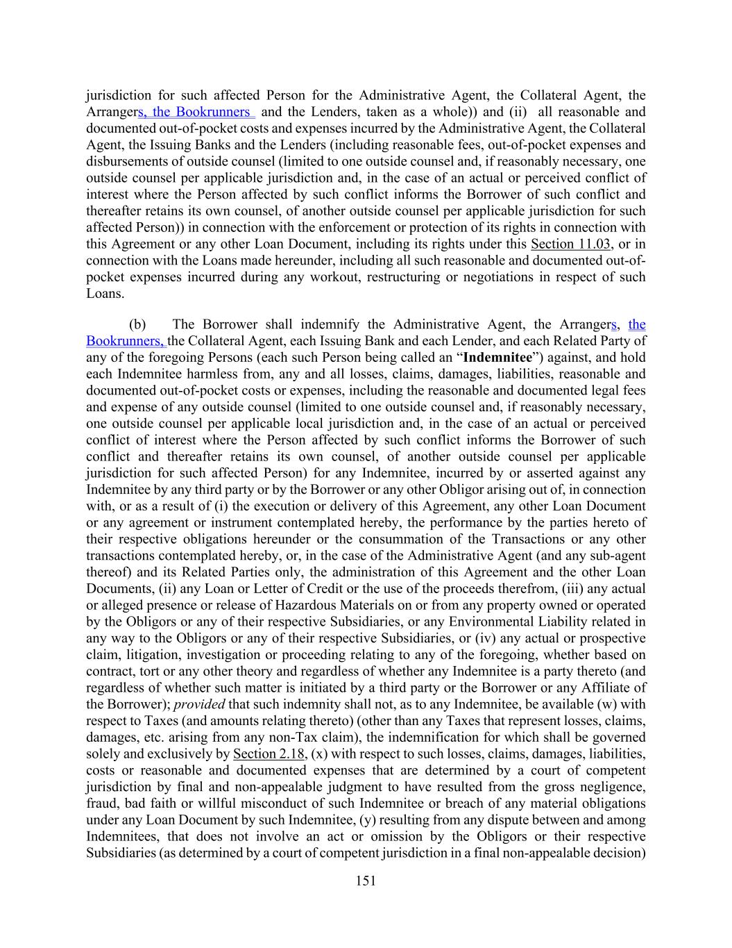 151 jurisdiction for such affected Person for the Administrative Agent, the Collateral Agent, the Arrangers, the Bookrunners and the Lenders, taken as a whole)) and (ii) all reasonable and documented out-of-pocket costs and expenses incurred by the Administrative Agent, the Collateral Agent, the Issuing Banks and the Lenders (including reasonable fees, out-of-pocket expenses and disbursements of outside counsel (limited to one outside counsel and, if reasonably necessary, one outside counsel per applicable jurisdiction and, in the case of an actual or perceived conflict of interest where the Person affected by such conflict informs the Borrower of such conflict and thereafter retains its own counsel, of another outside counsel per applicable jurisdiction for such affected Person)) in connection with the enforcement or protection of its rights in connection with this Agreement or any other Loan Document, including its rights under this Section 11.03, or in connection with the Loans made hereunder, including all such reasonable and documented out-of- pocket expenses incurred during any workout, restructuring or negotiations in respect of such Loans. (b) The Borrower shall indemnify the Administrative Agent, the Arrangers, the Bookrunners, the Collateral Agent, each Issuing Bank and each Lender, and each Related Party of any of the foregoing Persons (each such Person being called an “Indemnitee”) against, and hold each Indemnitee harmless from, any and all losses, claims, damages, liabilities, reasonable and documented out-of-pocket costs or expenses, including the reasonable and documented legal fees and expense of any outside counsel (limited to one outside counsel and, if reasonably necessary, one outside counsel per applicable local jurisdiction and, in the case of an actual or perceived conflict of interest where the Person affected by such conflict informs the Borrower of such conflict and thereafter retains its own counsel, of another outside counsel per applicable jurisdiction for such affected Person) for any Indemnitee, incurred by or asserted against any Indemnitee by any third party or by the Borrower or any other Obligor arising out of, in connection with, or as a result of (i) the execution or delivery of this Agreement, any other Loan Document or any agreement or instrument contemplated hereby, the performance by the parties hereto of their respective obligations hereunder or the consummation of the Transactions or any other transactions contemplated hereby, or, in the case of the Administrative Agent (and any sub-agent thereof) and its Related Parties only, the administration of this Agreement and the other Loan Documents, (ii) any Loan or Letter of Credit or the use of the proceeds therefrom, (iii) any actual or alleged presence or release of Hazardous Materials on or from any property owned or operated by the Obligors or any of their respective Subsidiaries, or any Environmental Liability related in any way to the Obligors or any of their respective Subsidiaries, or (iv) any actual or prospective claim, litigation, investigation or proceeding relating to any of the foregoing, whether based on contract, tort or any other theory and regardless of whether any Indemnitee is a party thereto (and regardless of whether such matter is initiated by a third party or the Borrower or any Affiliate of the Borrower); provided that such indemnity shall not, as to any Indemnitee, be available (w) with respect to Taxes (and amounts relating thereto) (other than any Taxes that represent losses, claims, damages, etc. arising from any non-Tax claim), the indemnification for which shall be governed solely and exclusively by Section 2.18, (x) with respect to such losses, claims, damages, liabilities, costs or reasonable and documented expenses that are determined by a court of competent jurisdiction by final and non-appealable judgment to have resulted from the gross negligence, fraud, bad faith or willful misconduct of such Indemnitee or breach of any material obligations under any Loan Document by such Indemnitee, (y) resulting from any dispute between and among Indemnitees, that does not involve an act or omission by the Obligors or their respective Subsidiaries (as determined by a court of competent jurisdiction in a final non-appealable decision)