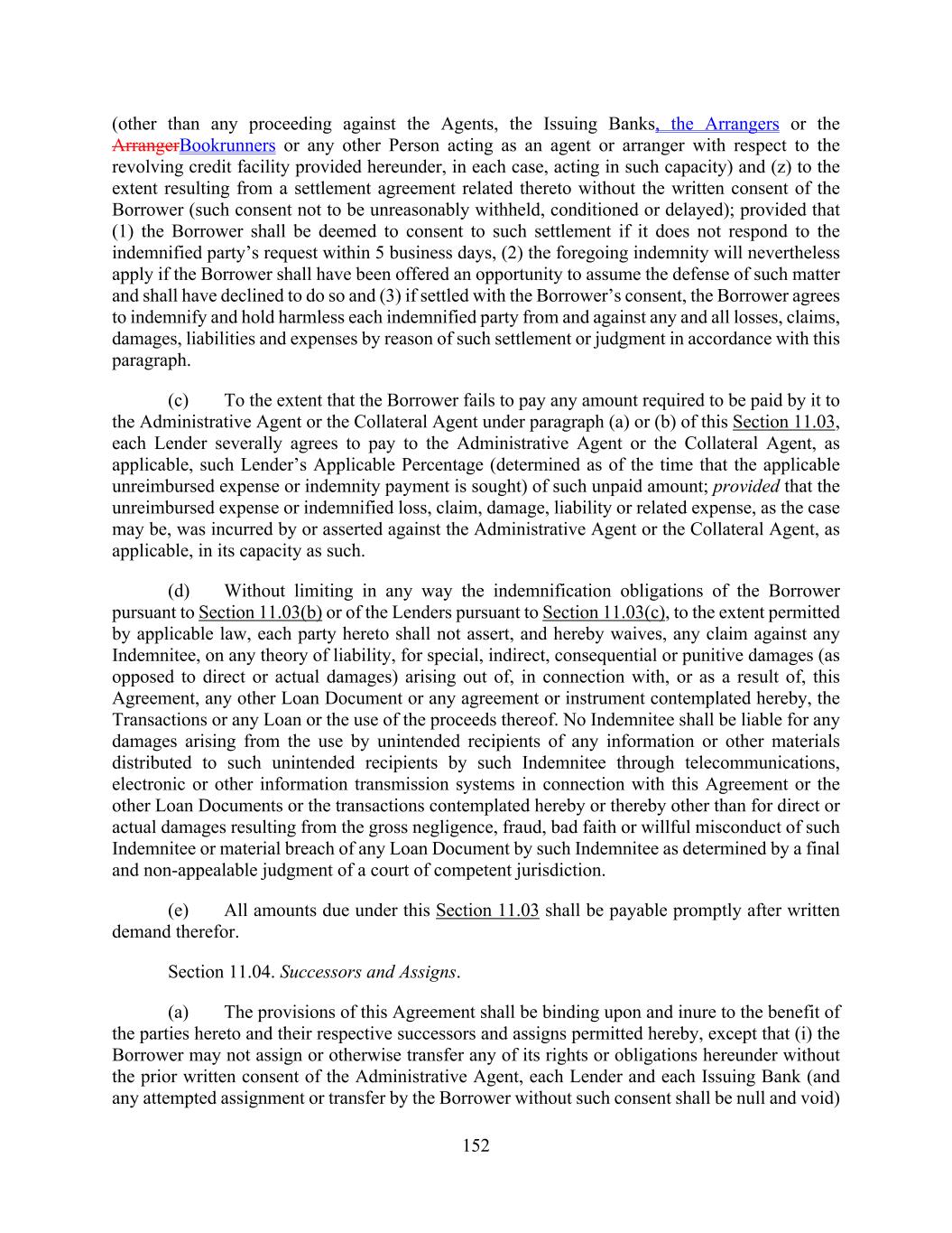 152 (other than any proceeding against the Agents, the Issuing Banks, the Arrangers or the ArrangerBookrunners or any other Person acting as an agent or arranger with respect to the revolving credit facility provided hereunder, in each case, acting in such capacity) and (z) to the extent resulting from a settlement agreement related thereto without the written consent of the Borrower (such consent not to be unreasonably withheld, conditioned or delayed); provided that (1) the Borrower shall be deemed to consent to such settlement if it does not respond to the indemnified party’s request within 5 business days, (2) the foregoing indemnity will nevertheless apply if the Borrower shall have been offered an opportunity to assume the defense of such matter and shall have declined to do so and (3) if settled with the Borrower’s consent, the Borrower agrees to indemnify and hold harmless each indemnified party from and against any and all losses, claims, damages, liabilities and expenses by reason of such settlement or judgment in accordance with this paragraph. (c) To the extent that the Borrower fails to pay any amount required to be paid by it to the Administrative Agent or the Collateral Agent under paragraph (a) or (b) of this Section 11.03, each Lender severally agrees to pay to the Administrative Agent or the Collateral Agent, as applicable, such Lender’s Applicable Percentage (determined as of the time that the applicable unreimbursed expense or indemnity payment is sought) of such unpaid amount; provided that the unreimbursed expense or indemnified loss, claim, damage, liability or related expense, as the case may be, was incurred by or asserted against the Administrative Agent or the Collateral Agent, as applicable, in its capacity as such. (d) Without limiting in any way the indemnification obligations of the Borrower pursuant to Section 11.03(b) or of the Lenders pursuant to Section 11.03(c), to the extent permitted by applicable law, each party hereto shall not assert, and hereby waives, any claim against any Indemnitee, on any theory of liability, for special, indirect, consequential or punitive damages (as opposed to direct or actual damages) arising out of, in connection with, or as a result of, this Agreement, any other Loan Document or any agreement or instrument contemplated hereby, the Transactions or any Loan or the use of the proceeds thereof. No Indemnitee shall be liable for any damages arising from the use by unintended recipients of any information or other materials distributed to such unintended recipients by such Indemnitee through telecommunications, electronic or other information transmission systems in connection with this Agreement or the other Loan Documents or the transactions contemplated hereby or thereby other than for direct or actual damages resulting from the gross negligence, fraud, bad faith or willful misconduct of such Indemnitee or material breach of any Loan Document by such Indemnitee as determined by a final and non-appealable judgment of a court of competent jurisdiction. (e) All amounts due under this Section 11.03 shall be payable promptly after written demand therefor. Section 11.04. Successors and Assigns. (a) The provisions of this Agreement shall be binding upon and inure to the benefit of the parties hereto and their respective successors and assigns permitted hereby, except that (i) the Borrower may not assign or otherwise transfer any of its rights or obligations hereunder without the prior written consent of the Administrative Agent, each Lender and each Issuing Bank (and any attempted assignment or transfer by the Borrower without such consent shall be null and void)