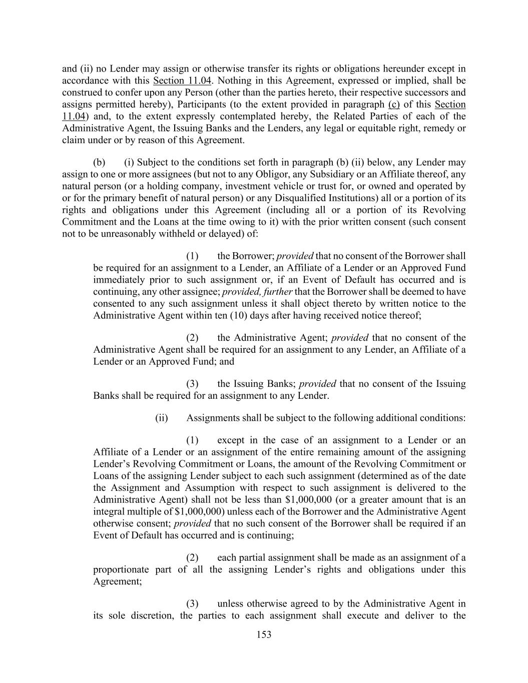 153 and (ii) no Lender may assign or otherwise transfer its rights or obligations hereunder except in accordance with this Section 11.04. Nothing in this Agreement, expressed or implied, shall be construed to confer upon any Person (other than the parties hereto, their respective successors and assigns permitted hereby), Participants (to the extent provided in paragraph (c) of this Section 11.04) and, to the extent expressly contemplated hereby, the Related Parties of each of the Administrative Agent, the Issuing Banks and the Lenders, any legal or equitable right, remedy or claim under or by reason of this Agreement. (b) (i) Subject to the conditions set forth in paragraph (b) (ii) below, any Lender may assign to one or more assignees (but not to any Obligor, any Subsidiary or an Affiliate thereof, any natural person (or a holding company, investment vehicle or trust for, or owned and operated by or for the primary benefit of natural person) or any Disqualified Institutions) all or a portion of its rights and obligations under this Agreement (including all or a portion of its Revolving Commitment and the Loans at the time owing to it) with the prior written consent (such consent not to be unreasonably withheld or delayed) of: (1) the Borrower; provided that no consent of the Borrower shall be required for an assignment to a Lender, an Affiliate of a Lender or an Approved Fund immediately prior to such assignment or, if an Event of Default has occurred and is continuing, any other assignee; provided, further that the Borrower shall be deemed to have consented to any such assignment unless it shall object thereto by written notice to the Administrative Agent within ten (10) days after having received notice thereof; (2) the Administrative Agent; provided that no consent of the Administrative Agent shall be required for an assignment to any Lender, an Affiliate of a Lender or an Approved Fund; and (3) the Issuing Banks; provided that no consent of the Issuing Banks shall be required for an assignment to any Lender. (ii) Assignments shall be subject to the following additional conditions: (1) except in the case of an assignment to a Lender or an Affiliate of a Lender or an assignment of the entire remaining amount of the assigning Lender’s Revolving Commitment or Loans, the amount of the Revolving Commitment or Loans of the assigning Lender subject to each such assignment (determined as of the date the Assignment and Assumption with respect to such assignment is delivered to the Administrative Agent) shall not be less than $1,000,000 (or a greater amount that is an integral multiple of $1,000,000) unless each of the Borrower and the Administrative Agent otherwise consent; provided that no such consent of the Borrower shall be required if an Event of Default has occurred and is continuing; (2) each partial assignment shall be made as an assignment of a proportionate part of all the assigning Lender’s rights and obligations under this Agreement; (3) unless otherwise agreed to by the Administrative Agent in its sole discretion, the parties to each assignment shall execute and deliver to the