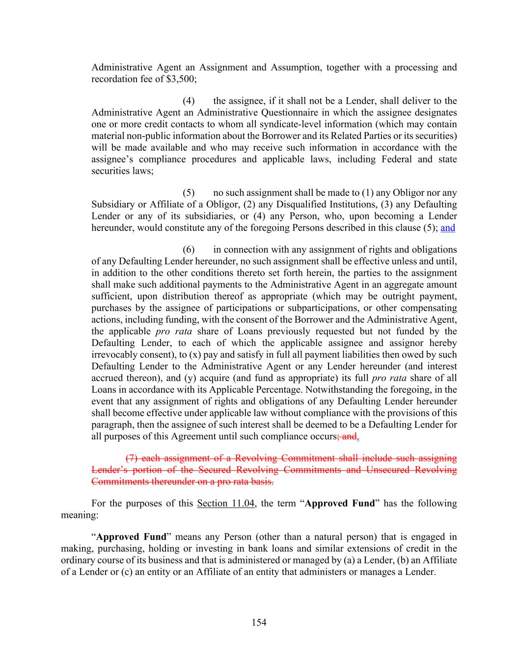 154 Administrative Agent an Assignment and Assumption, together with a processing and recordation fee of $3,500; (4) the assignee, if it shall not be a Lender, shall deliver to the Administrative Agent an Administrative Questionnaire in which the assignee designates one or more credit contacts to whom all syndicate-level information (which may contain material non-public information about the Borrower and its Related Parties or its securities) will be made available and who may receive such information in accordance with the assignee’s compliance procedures and applicable laws, including Federal and state securities laws; (5) no such assignment shall be made to (1) any Obligor nor any Subsidiary or Affiliate of a Obligor, (2) any Disqualified Institutions, (3) any Defaulting Lender or any of its subsidiaries, or (4) any Person, who, upon becoming a Lender hereunder, would constitute any of the foregoing Persons described in this clause (5); and (6) in connection with any assignment of rights and obligations of any Defaulting Lender hereunder, no such assignment shall be effective unless and until, in addition to the other conditions thereto set forth herein, the parties to the assignment shall make such additional payments to the Administrative Agent in an aggregate amount sufficient, upon distribution thereof as appropriate (which may be outright payment, purchases by the assignee of participations or subparticipations, or other compensating actions, including funding, with the consent of the Borrower and the Administrative Agent, the applicable pro rata share of Loans previously requested but not funded by the Defaulting Lender, to each of which the applicable assignee and assignor hereby irrevocably consent), to (x) pay and satisfy in full all payment liabilities then owed by such Defaulting Lender to the Administrative Agent or any Lender hereunder (and interest accrued thereon), and (y) acquire (and fund as appropriate) its full pro rata share of all Loans in accordance with its Applicable Percentage. Notwithstanding the foregoing, in the event that any assignment of rights and obligations of any Defaulting Lender hereunder shall become effective under applicable law without compliance with the provisions of this paragraph, then the assignee of such interest shall be deemed to be a Defaulting Lender for all purposes of this Agreement until such compliance occurs; and. (7) each assignment of a Revolving Commitment shall include such assigning Lender’s portion of the Secured Revolving Commitments and Unsecured Revolving Commitments thereunder on a pro rata basis. For the purposes of this Section 11.04, the term “Approved Fund” has the following meaning: “Approved Fund” means any Person (other than a natural person) that is engaged in making, purchasing, holding or investing in bank loans and similar extensions of credit in the ordinary course of its business and that is administered or managed by (a) a Lender, (b) an Affiliate of a Lender or (c) an entity or an Affiliate of an entity that administers or manages a Lender.