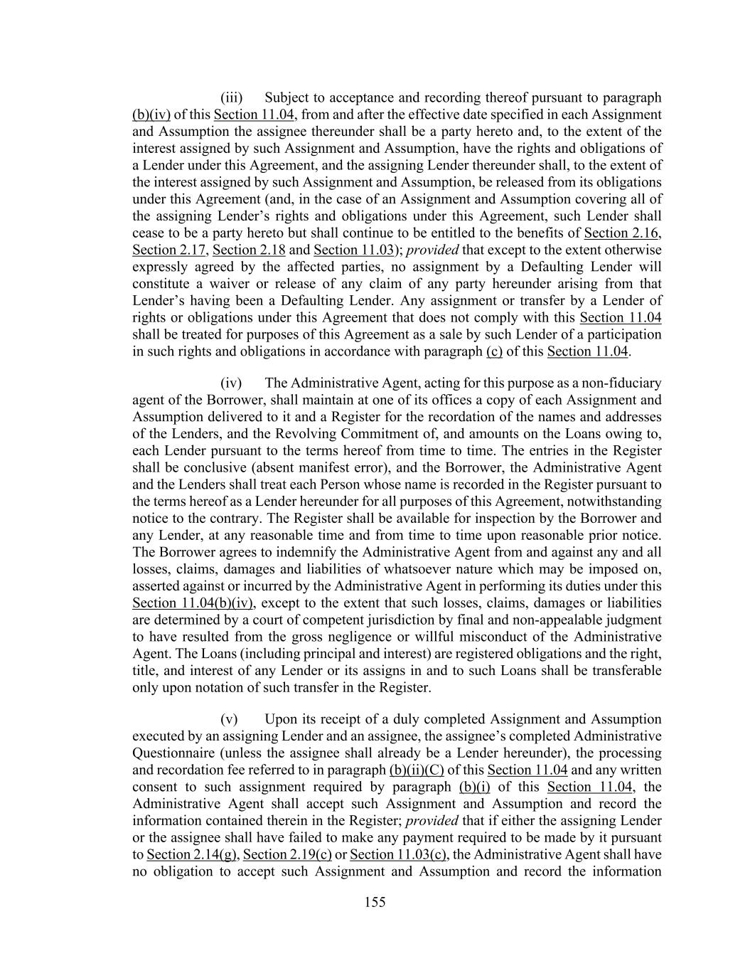 155 (iii) Subject to acceptance and recording thereof pursuant to paragraph (b)(iv) of this Section 11.04, from and after the effective date specified in each Assignment and Assumption the assignee thereunder shall be a party hereto and, to the extent of the interest assigned by such Assignment and Assumption, have the rights and obligations of a Lender under this Agreement, and the assigning Lender thereunder shall, to the extent of the interest assigned by such Assignment and Assumption, be released from its obligations under this Agreement (and, in the case of an Assignment and Assumption covering all of the assigning Lender’s rights and obligations under this Agreement, such Lender shall cease to be a party hereto but shall continue to be entitled to the benefits of Section 2.16, Section 2.17, Section 2.18 and Section 11.03); provided that except to the extent otherwise expressly agreed by the affected parties, no assignment by a Defaulting Lender will constitute a waiver or release of any claim of any party hereunder arising from that Lender’s having been a Defaulting Lender. Any assignment or transfer by a Lender of rights or obligations under this Agreement that does not comply with this Section 11.04 shall be treated for purposes of this Agreement as a sale by such Lender of a participation in such rights and obligations in accordance with paragraph (c) of this Section 11.04. (iv) The Administrative Agent, acting for this purpose as a non-fiduciary agent of the Borrower, shall maintain at one of its offices a copy of each Assignment and Assumption delivered to it and a Register for the recordation of the names and addresses of the Lenders, and the Revolving Commitment of, and amounts on the Loans owing to, each Lender pursuant to the terms hereof from time to time. The entries in the Register shall be conclusive (absent manifest error), and the Borrower, the Administrative Agent and the Lenders shall treat each Person whose name is recorded in the Register pursuant to the terms hereof as a Lender hereunder for all purposes of this Agreement, notwithstanding notice to the contrary. The Register shall be available for inspection by the Borrower and any Lender, at any reasonable time and from time to time upon reasonable prior notice. The Borrower agrees to indemnify the Administrative Agent from and against any and all losses, claims, damages and liabilities of whatsoever nature which may be imposed on, asserted against or incurred by the Administrative Agent in performing its duties under this Section 11.04(b)(iv), except to the extent that such losses, claims, damages or liabilities are determined by a court of competent jurisdiction by final and non-appealable judgment to have resulted from the gross negligence or willful misconduct of the Administrative Agent. The Loans (including principal and interest) are registered obligations and the right, title, and interest of any Lender or its assigns in and to such Loans shall be transferable only upon notation of such transfer in the Register. (v) Upon its receipt of a duly completed Assignment and Assumption executed by an assigning Lender and an assignee, the assignee’s completed Administrative Questionnaire (unless the assignee shall already be a Lender hereunder), the processing and recordation fee referred to in paragraph (b)(ii)(C) of this Section 11.04 and any written consent to such assignment required by paragraph (b)(i) of this Section 11.04, the Administrative Agent shall accept such Assignment and Assumption and record the information contained therein in the Register; provided that if either the assigning Lender or the assignee shall have failed to make any payment required to be made by it pursuant to Section 2.14(g), Section 2.19(c) or Section 11.03(c), the Administrative Agent shall have no obligation to accept such Assignment and Assumption and record the information