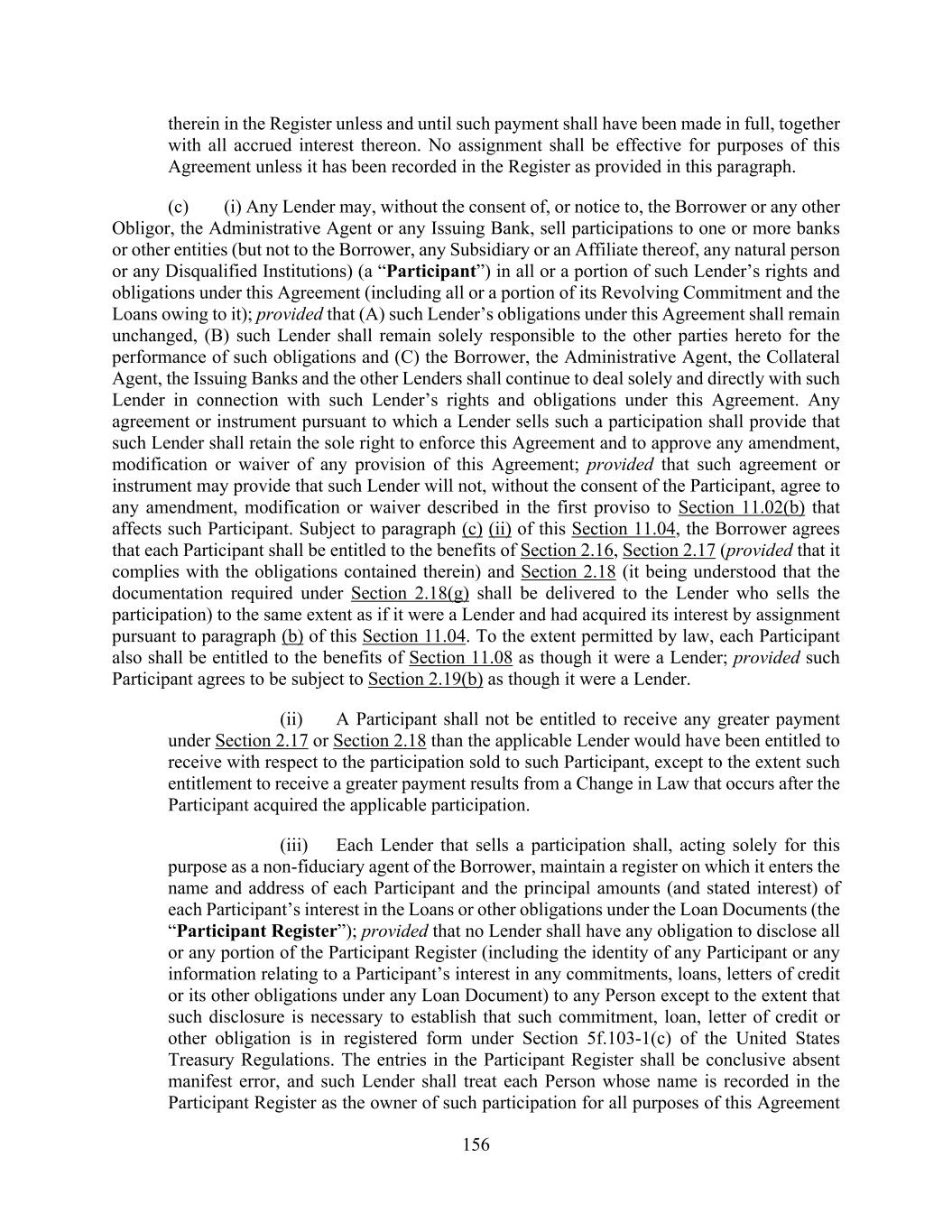 156 therein in the Register unless and until such payment shall have been made in full, together with all accrued interest thereon. No assignment shall be effective for purposes of this Agreement unless it has been recorded in the Register as provided in this paragraph. (c) (i) Any Lender may, without the consent of, or notice to, the Borrower or any other Obligor, the Administrative Agent or any Issuing Bank, sell participations to one or more banks or other entities (but not to the Borrower, any Subsidiary or an Affiliate thereof, any natural person or any Disqualified Institutions) (a “Participant”) in all or a portion of such Lender’s rights and obligations under this Agreement (including all or a portion of its Revolving Commitment and the Loans owing to it); provided that (A) such Lender’s obligations under this Agreement shall remain unchanged, (B) such Lender shall remain solely responsible to the other parties hereto for the performance of such obligations and (C) the Borrower, the Administrative Agent, the Collateral Agent, the Issuing Banks and the other Lenders shall continue to deal solely and directly with such Lender in connection with such Lender’s rights and obligations under this Agreement. Any agreement or instrument pursuant to which a Lender sells such a participation shall provide that such Lender shall retain the sole right to enforce this Agreement and to approve any amendment, modification or waiver of any provision of this Agreement; provided that such agreement or instrument may provide that such Lender will not, without the consent of the Participant, agree to any amendment, modification or waiver described in the first proviso to Section 11.02(b) that affects such Participant. Subject to paragraph (c) (ii) of this Section 11.04, the Borrower agrees that each Participant shall be entitled to the benefits of Section 2.16, Section 2.17 (provided that it complies with the obligations contained therein) and Section 2.18 (it being understood that the documentation required under Section 2.18(g) shall be delivered to the Lender who sells the participation) to the same extent as if it were a Lender and had acquired its interest by assignment pursuant to paragraph (b) of this Section 11.04. To the extent permitted by law, each Participant also shall be entitled to the benefits of Section 11.08 as though it were a Lender; provided such Participant agrees to be subject to Section 2.19(b) as though it were a Lender. (ii) A Participant shall not be entitled to receive any greater payment under Section 2.17 or Section 2.18 than the applicable Lender would have been entitled to receive with respect to the participation sold to such Participant, except to the extent such entitlement to receive a greater payment results from a Change in Law that occurs after the Participant acquired the applicable participation. (iii) Each Lender that sells a participation shall, acting solely for this purpose as a non-fiduciary agent of the Borrower, maintain a register on which it enters the name and address of each Participant and the principal amounts (and stated interest) of each Participant’s interest in the Loans or other obligations under the Loan Documents (the “Participant Register”); provided that no Lender shall have any obligation to disclose all or any portion of the Participant Register (including the identity of any Participant or any information relating to a Participant’s interest in any commitments, loans, letters of credit or its other obligations under any Loan Document) to any Person except to the extent that such disclosure is necessary to establish that such commitment, loan, letter of credit or other obligation is in registered form under Section 5f.103-1(c) of the United States Treasury Regulations. The entries in the Participant Register shall be conclusive absent manifest error, and such Lender shall treat each Person whose name is recorded in the Participant Register as the owner of such participation for all purposes of this Agreement