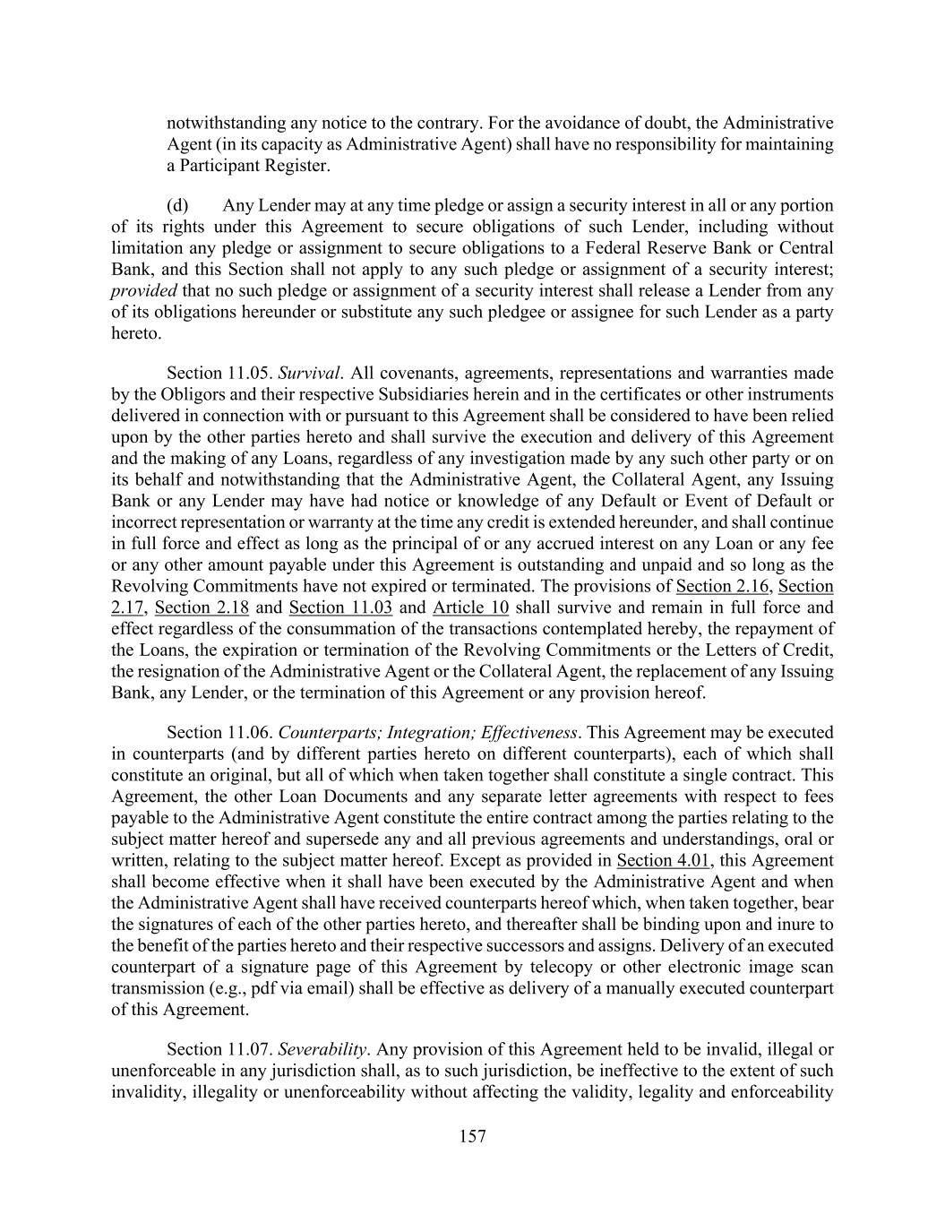 157 notwithstanding any notice to the contrary. For the avoidance of doubt, the Administrative Agent (in its capacity as Administrative Agent) shall have no responsibility for maintaining a Participant Register. (d) Any Lender may at any time pledge or assign a security interest in all or any portion of its rights under this Agreement to secure obligations of such Lender, including without limitation any pledge or assignment to secure obligations to a Federal Reserve Bank or Central Bank, and this Section shall not apply to any such pledge or assignment of a security interest; provided that no such pledge or assignment of a security interest shall release a Lender from any of its obligations hereunder or substitute any such pledgee or assignee for such Lender as a party hereto. Section 11.05. Survival. All covenants, agreements, representations and warranties made by the Obligors and their respective Subsidiaries herein and in the certificates or other instruments delivered in connection with or pursuant to this Agreement shall be considered to have been relied upon by the other parties hereto and shall survive the execution and delivery of this Agreement and the making of any Loans, regardless of any investigation made by any such other party or on its behalf and notwithstanding that the Administrative Agent, the Collateral Agent, any Issuing Bank or any Lender may have had notice or knowledge of any Default or Event of Default or incorrect representation or warranty at the time any credit is extended hereunder, and shall continue in full force and effect as long as the principal of or any accrued interest on any Loan or any fee or any other amount payable under this Agreement is outstanding and unpaid and so long as the Revolving Commitments have not expired or terminated. The provisions of Section 2.16, Section 2.17, Section 2.18 and Section 11.03 and Article 10 shall survive and remain in full force and effect regardless of the consummation of the transactions contemplated hereby, the repayment of the Loans, the expiration or termination of the Revolving Commitments or the Letters of Credit, the resignation of the Administrative Agent or the Collateral Agent, the replacement of any Issuing Bank, any Lender, or the termination of this Agreement or any provision hereof. Section 11.06. Counterparts; Integration; Effectiveness. This Agreement may be executed in counterparts (and by different parties hereto on different counterparts), each of which shall constitute an original, but all of which when taken together shall constitute a single contract. This Agreement, the other Loan Documents and any separate letter agreements with respect to fees payable to the Administrative Agent constitute the entire contract among the parties relating to the subject matter hereof and supersede any and all previous agreements and understandings, oral or written, relating to the subject matter hereof. Except as provided in Section 4.01, this Agreement shall become effective when it shall have been executed by the Administrative Agent and when the Administrative Agent shall have received counterparts hereof which, when taken together, bear the signatures of each of the other parties hereto, and thereafter shall be binding upon and inure to the benefit of the parties hereto and their respective successors and assigns. Delivery of an executed counterpart of a signature page of this Agreement by telecopy or other electronic image scan transmission (e.g., pdf via email) shall be effective as delivery of a manually executed counterpart of this Agreement. Section 11.07. Severability. Any provision of this Agreement held to be invalid, illegal or unenforceable in any jurisdiction shall, as to such jurisdiction, be ineffective to the extent of such invalidity, illegality or unenforceability without affecting the validity, legality and enforceability