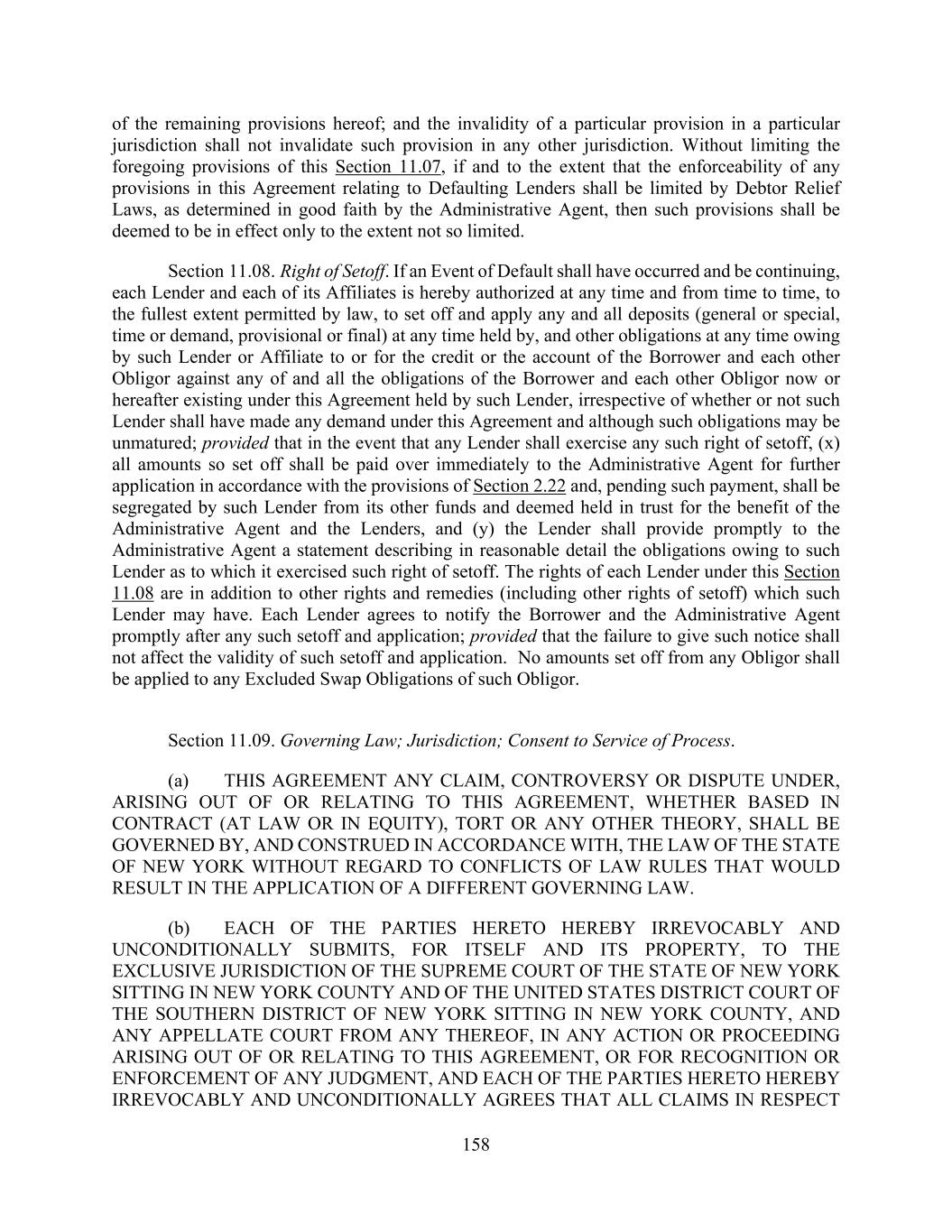 158 of the remaining provisions hereof; and the invalidity of a particular provision in a particular jurisdiction shall not invalidate such provision in any other jurisdiction. Without limiting the foregoing provisions of this Section 11.07, if and to the extent that the enforceability of any provisions in this Agreement relating to Defaulting Lenders shall be limited by Debtor Relief Laws, as determined in good faith by the Administrative Agent, then such provisions shall be deemed to be in effect only to the extent not so limited. Section 11.08. Right of Setoff. If an Event of Default shall have occurred and be continuing, each Lender and each of its Affiliates is hereby authorized at any time and from time to time, to the fullest extent permitted by law, to set off and apply any and all deposits (general or special, time or demand, provisional or final) at any time held by, and other obligations at any time owing by such Lender or Affiliate to or for the credit or the account of the Borrower and each other Obligor against any of and all the obligations of the Borrower and each other Obligor now or hereafter existing under this Agreement held by such Lender, irrespective of whether or not such Lender shall have made any demand under this Agreement and although such obligations may be unmatured; provided that in the event that any Lender shall exercise any such right of setoff, (x) all amounts so set off shall be paid over immediately to the Administrative Agent for further application in accordance with the provisions of Section 2.22 and, pending such payment, shall be segregated by such Lender from its other funds and deemed held in trust for the benefit of the Administrative Agent and the Lenders, and (y) the Lender shall provide promptly to the Administrative Agent a statement describing in reasonable detail the obligations owing to such Lender as to which it exercised such right of setoff. The rights of each Lender under this Section 11.08 are in addition to other rights and remedies (including other rights of setoff) which such Lender may have. Each Lender agrees to notify the Borrower and the Administrative Agent promptly after any such setoff and application; provided that the failure to give such notice shall not affect the validity of such setoff and application. No amounts set off from any Obligor shall be applied to any Excluded Swap Obligations of such Obligor. Section 11.09. Governing Law; Jurisdiction; Consent to Service of Process. (a) THIS AGREEMENT ANY CLAIM, CONTROVERSY OR DISPUTE UNDER, ARISING OUT OF OR RELATING TO THIS AGREEMENT, WHETHER BASED IN CONTRACT (AT LAW OR IN EQUITY), TORT OR ANY OTHER THEORY, SHALL BE GOVERNED BY, AND CONSTRUED IN ACCORDANCE WITH, THE LAW OF THE STATE OF NEW YORK WITHOUT REGARD TO CONFLICTS OF LAW RULES THAT WOULD RESULT IN THE APPLICATION OF A DIFFERENT GOVERNING LAW. (b) EACH OF THE PARTIES HERETO HEREBY IRREVOCABLY AND UNCONDITIONALLY SUBMITS, FOR ITSELF AND ITS PROPERTY, TO THE EXCLUSIVE JURISDICTION OF THE SUPREME COURT OF THE STATE OF NEW YORK SITTING IN NEW YORK COUNTY AND OF THE UNITED STATES DISTRICT COURT OF THE SOUTHERN DISTRICT OF NEW YORK SITTING IN NEW YORK COUNTY, AND ANY APPELLATE COURT FROM ANY THEREOF, IN ANY ACTION OR PROCEEDING ARISING OUT OF OR RELATING TO THIS AGREEMENT, OR FOR RECOGNITION OR ENFORCEMENT OF ANY JUDGMENT, AND EACH OF THE PARTIES HERETO HEREBY IRREVOCABLY AND UNCONDITIONALLY AGREES THAT ALL CLAIMS IN RESPECT