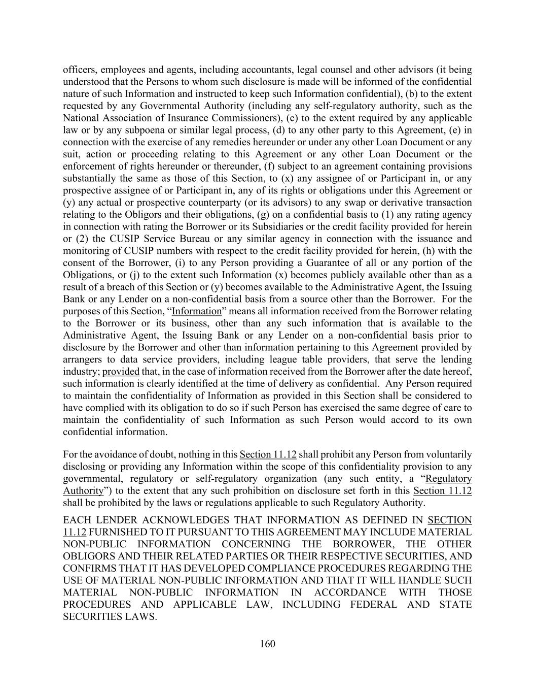 160 officers, employees and agents, including accountants, legal counsel and other advisors (it being understood that the Persons to whom such disclosure is made will be informed of the confidential nature of such Information and instructed to keep such Information confidential), (b) to the extent requested by any Governmental Authority (including any self-regulatory authority, such as the National Association of Insurance Commissioners), (c) to the extent required by any applicable law or by any subpoena or similar legal process, (d) to any other party to this Agreement, (e) in connection with the exercise of any remedies hereunder or under any other Loan Document or any suit, action or proceeding relating to this Agreement or any other Loan Document or the enforcement of rights hereunder or thereunder, (f) subject to an agreement containing provisions substantially the same as those of this Section, to (x) any assignee of or Participant in, or any prospective assignee of or Participant in, any of its rights or obligations under this Agreement or (y) any actual or prospective counterparty (or its advisors) to any swap or derivative transaction relating to the Obligors and their obligations, (g) on a confidential basis to (1) any rating agency in connection with rating the Borrower or its Subsidiaries or the credit facility provided for herein or (2) the CUSIP Service Bureau or any similar agency in connection with the issuance and monitoring of CUSIP numbers with respect to the credit facility provided for herein, (h) with the consent of the Borrower, (i) to any Person providing a Guarantee of all or any portion of the Obligations, or (j) to the extent such Information (x) becomes publicly available other than as a result of a breach of this Section or (y) becomes available to the Administrative Agent, the Issuing Bank or any Lender on a non-confidential basis from a source other than the Borrower. For the purposes of this Section, “Information” means all information received from the Borrower relating to the Borrower or its business, other than any such information that is available to the Administrative Agent, the Issuing Bank or any Lender on a non-confidential basis prior to disclosure by the Borrower and other than information pertaining to this Agreement provided by arrangers to data service providers, including league table providers, that serve the lending industry; provided that, in the case of information received from the Borrower after the date hereof, such information is clearly identified at the time of delivery as confidential. Any Person required to maintain the confidentiality of Information as provided in this Section shall be considered to have complied with its obligation to do so if such Person has exercised the same degree of care to maintain the confidentiality of such Information as such Person would accord to its own confidential information. For the avoidance of doubt, nothing in this Section 11.12 shall prohibit any Person from voluntarily disclosing or providing any Information within the scope of this confidentiality provision to any governmental, regulatory or self-regulatory organization (any such entity, a “Regulatory Authority”) to the extent that any such prohibition on disclosure set forth in this Section 11.12 shall be prohibited by the laws or regulations applicable to such Regulatory Authority. EACH LENDER ACKNOWLEDGES THAT INFORMATION AS DEFINED IN SECTION 11.12 FURNISHED TO IT PURSUANT TO THIS AGREEMENT MAY INCLUDE MATERIAL NON-PUBLIC INFORMATION CONCERNING THE BORROWER, THE OTHER OBLIGORS AND THEIR RELATED PARTIES OR THEIR RESPECTIVE SECURITIES, AND CONFIRMS THAT IT HAS DEVELOPED COMPLIANCE PROCEDURES REGARDING THE USE OF MATERIAL NON-PUBLIC INFORMATION AND THAT IT WILL HANDLE SUCH MATERIAL NON-PUBLIC INFORMATION IN ACCORDANCE WITH THOSE PROCEDURES AND APPLICABLE LAW, INCLUDING FEDERAL AND STATE SECURITIES LAWS.