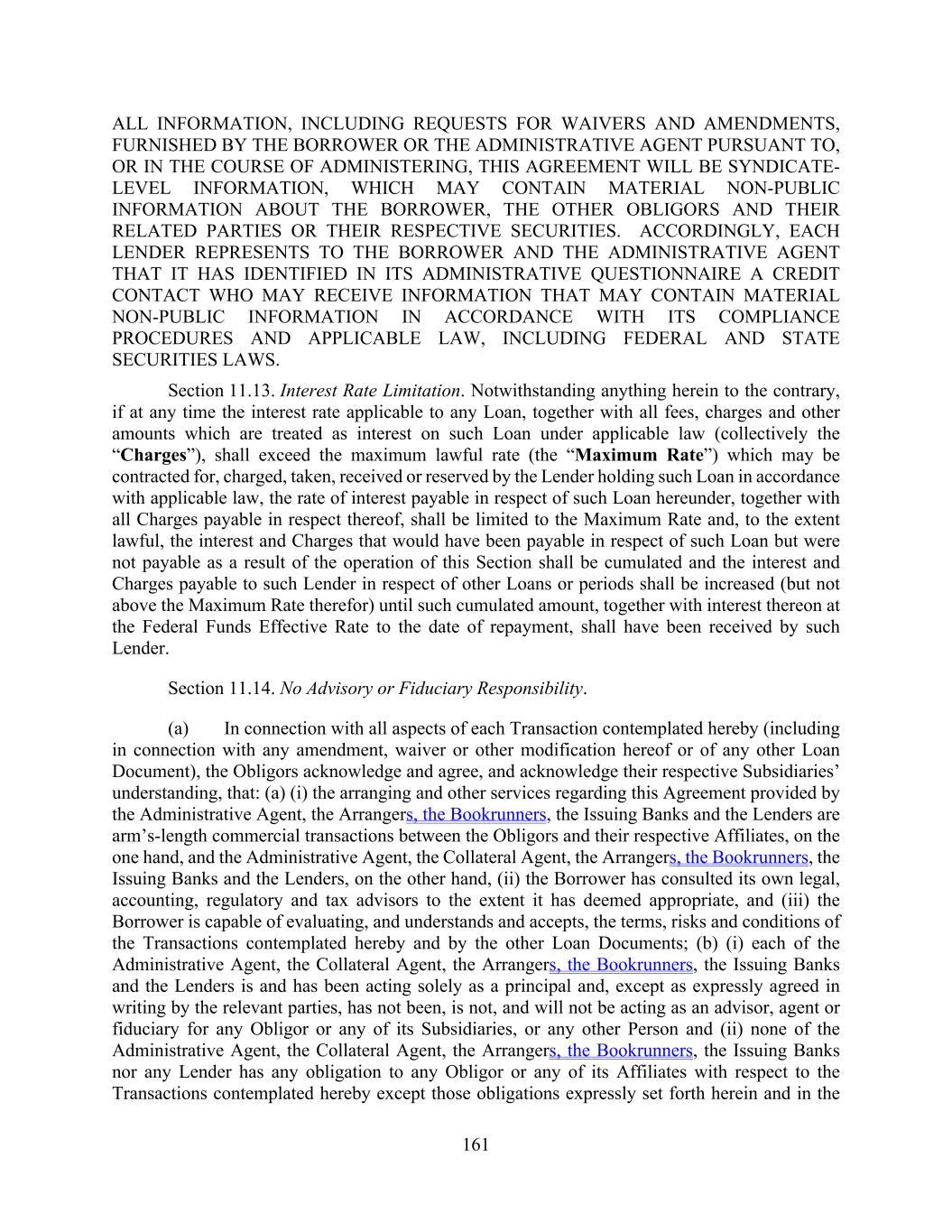 161 ALL INFORMATION, INCLUDING REQUESTS FOR WAIVERS AND AMENDMENTS, FURNISHED BY THE BORROWER OR THE ADMINISTRATIVE AGENT PURSUANT TO, OR IN THE COURSE OF ADMINISTERING, THIS AGREEMENT WILL BE SYNDICATE- LEVEL INFORMATION, WHICH MAY CONTAIN MATERIAL NON-PUBLIC INFORMATION ABOUT THE BORROWER, THE OTHER OBLIGORS AND THEIR RELATED PARTIES OR THEIR RESPECTIVE SECURITIES. ACCORDINGLY, EACH LENDER REPRESENTS TO THE BORROWER AND THE ADMINISTRATIVE AGENT THAT IT HAS IDENTIFIED IN ITS ADMINISTRATIVE QUESTIONNAIRE A CREDIT CONTACT WHO MAY RECEIVE INFORMATION THAT MAY CONTAIN MATERIAL NON-PUBLIC INFORMATION IN ACCORDANCE WITH ITS COMPLIANCE PROCEDURES AND APPLICABLE LAW, INCLUDING FEDERAL AND STATE SECURITIES LAWS. Section 11.13. Interest Rate Limitation. Notwithstanding anything herein to the contrary, if at any time the interest rate applicable to any Loan, together with all fees, charges and other amounts which are treated as interest on such Loan under applicable law (collectively the “Charges”), shall exceed the maximum lawful rate (the “Maximum Rate”) which may be contracted for, charged, taken, received or reserved by the Lender holding such Loan in accordance with applicable law, the rate of interest payable in respect of such Loan hereunder, together with all Charges payable in respect thereof, shall be limited to the Maximum Rate and, to the extent lawful, the interest and Charges that would have been payable in respect of such Loan but were not payable as a result of the operation of this Section shall be cumulated and the interest and Charges payable to such Lender in respect of other Loans or periods shall be increased (but not above the Maximum Rate therefor) until such cumulated amount, together with interest thereon at the Federal Funds Effective Rate to the date of repayment, shall have been received by such Lender. Section 11.14. No Advisory or Fiduciary Responsibility. (a) In connection with all aspects of each Transaction contemplated hereby (including in connection with any amendment, waiver or other modification hereof or of any other Loan Document), the Obligors acknowledge and agree, and acknowledge their respective Subsidiaries’ understanding, that: (a) (i) the arranging and other services regarding this Agreement provided by the Administrative Agent, the Arrangers, the Bookrunners, the Issuing Banks and the Lenders are arm’s-length commercial transactions between the Obligors and their respective Affiliates, on the one hand, and the Administrative Agent, the Collateral Agent, the Arrangers, the Bookrunners, the Issuing Banks and the Lenders, on the other hand, (ii) the Borrower has consulted its own legal, accounting, regulatory and tax advisors to the extent it has deemed appropriate, and (iii) the Borrower is capable of evaluating, and understands and accepts, the terms, risks and conditions of the Transactions contemplated hereby and by the other Loan Documents; (b) (i) each of the Administrative Agent, the Collateral Agent, the Arrangers, the Bookrunners, the Issuing Banks and the Lenders is and has been acting solely as a principal and, except as expressly agreed in writing by the relevant parties, has not been, is not, and will not be acting as an advisor, agent or fiduciary for any Obligor or any of its Subsidiaries, or any other Person and (ii) none of the Administrative Agent, the Collateral Agent, the Arrangers, the Bookrunners, the Issuing Banks nor any Lender has any obligation to any Obligor or any of its Affiliates with respect to the Transactions contemplated hereby except those obligations expressly set forth herein and in the