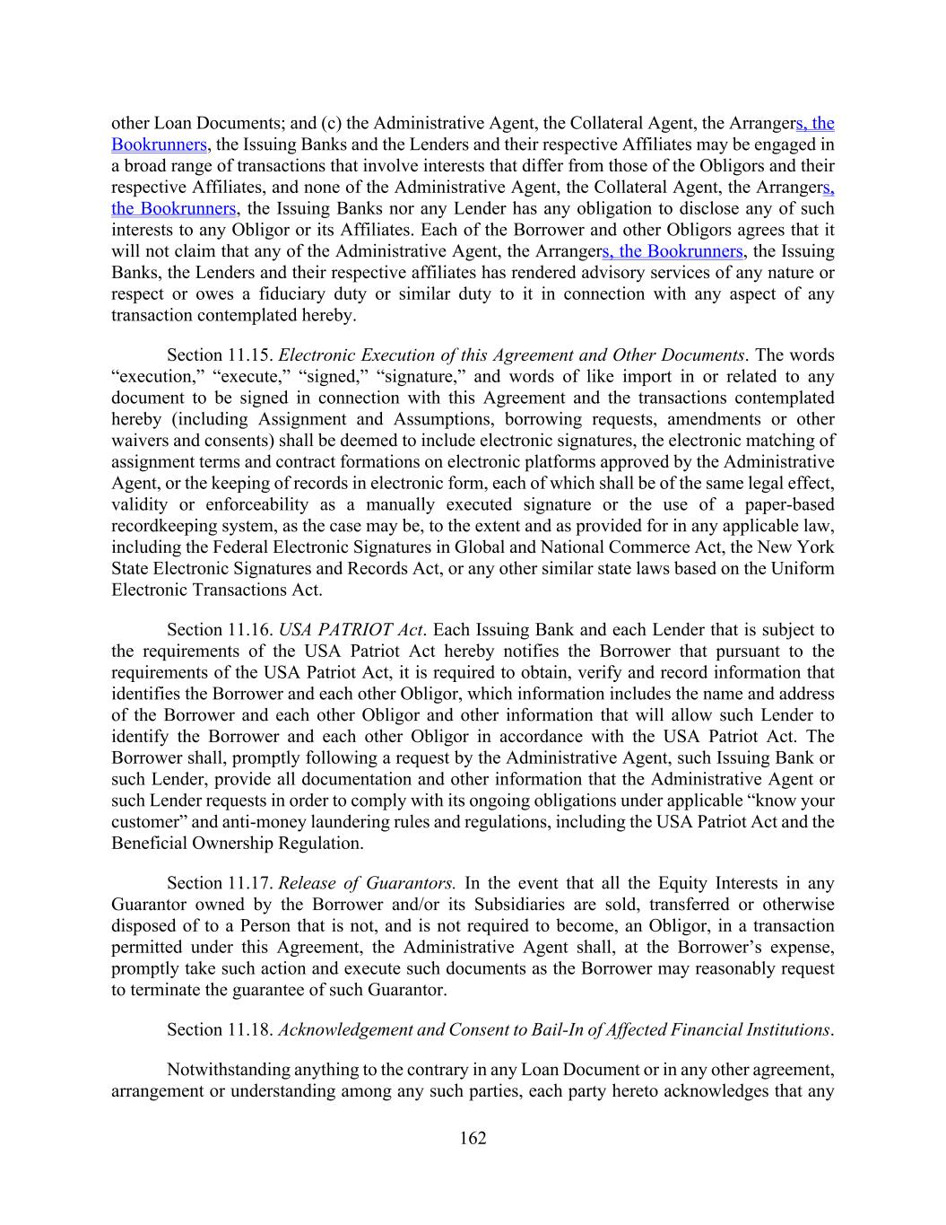 162 other Loan Documents; and (c) the Administrative Agent, the Collateral Agent, the Arrangers, the Bookrunners, the Issuing Banks and the Lenders and their respective Affiliates may be engaged in a broad range of transactions that involve interests that differ from those of the Obligors and their respective Affiliates, and none of the Administrative Agent, the Collateral Agent, the Arrangers, the Bookrunners, the Issuing Banks nor any Lender has any obligation to disclose any of such interests to any Obligor or its Affiliates. Each of the Borrower and other Obligors agrees that it will not claim that any of the Administrative Agent, the Arrangers, the Bookrunners, the Issuing Banks, the Lenders and their respective affiliates has rendered advisory services of any nature or respect or owes a fiduciary duty or similar duty to it in connection with any aspect of any transaction contemplated hereby. Section 11.15. Electronic Execution of this Agreement and Other Documents. The words “execution,” “execute,” “signed,” “signature,” and words of like import in or related to any document to be signed in connection with this Agreement and the transactions contemplated hereby (including Assignment and Assumptions, borrowing requests, amendments or other waivers and consents) shall be deemed to include electronic signatures, the electronic matching of assignment terms and contract formations on electronic platforms approved by the Administrative Agent, or the keeping of records in electronic form, each of which shall be of the same legal effect, validity or enforceability as a manually executed signature or the use of a paper-based recordkeeping system, as the case may be, to the extent and as provided for in any applicable law, including the Federal Electronic Signatures in Global and National Commerce Act, the New York State Electronic Signatures and Records Act, or any other similar state laws based on the Uniform Electronic Transactions Act. Section 11.16. USA PATRIOT Act. Each Issuing Bank and each Lender that is subject to the requirements of the USA Patriot Act hereby notifies the Borrower that pursuant to the requirements of the USA Patriot Act, it is required to obtain, verify and record information that identifies the Borrower and each other Obligor, which information includes the name and address of the Borrower and each other Obligor and other information that will allow such Lender to identify the Borrower and each other Obligor in accordance with the USA Patriot Act. The Borrower shall, promptly following a request by the Administrative Agent, such Issuing Bank or such Lender, provide all documentation and other information that the Administrative Agent or such Lender requests in order to comply with its ongoing obligations under applicable “know your customer” and anti-money laundering rules and regulations, including the USA Patriot Act and the Beneficial Ownership Regulation. Section 11.17. Release of Guarantors. In the event that all the Equity Interests in any Guarantor owned by the Borrower and/or its Subsidiaries are sold, transferred or otherwise disposed of to a Person that is not, and is not required to become, an Obligor, in a transaction permitted under this Agreement, the Administrative Agent shall, at the Borrower’s expense, promptly take such action and execute such documents as the Borrower may reasonably request to terminate the guarantee of such Guarantor. Section 11.18. Acknowledgement and Consent to Bail-In of Affected Financial Institutions. Notwithstanding anything to the contrary in any Loan Document or in any other agreement, arrangement or understanding among any such parties, each party hereto acknowledges that any
