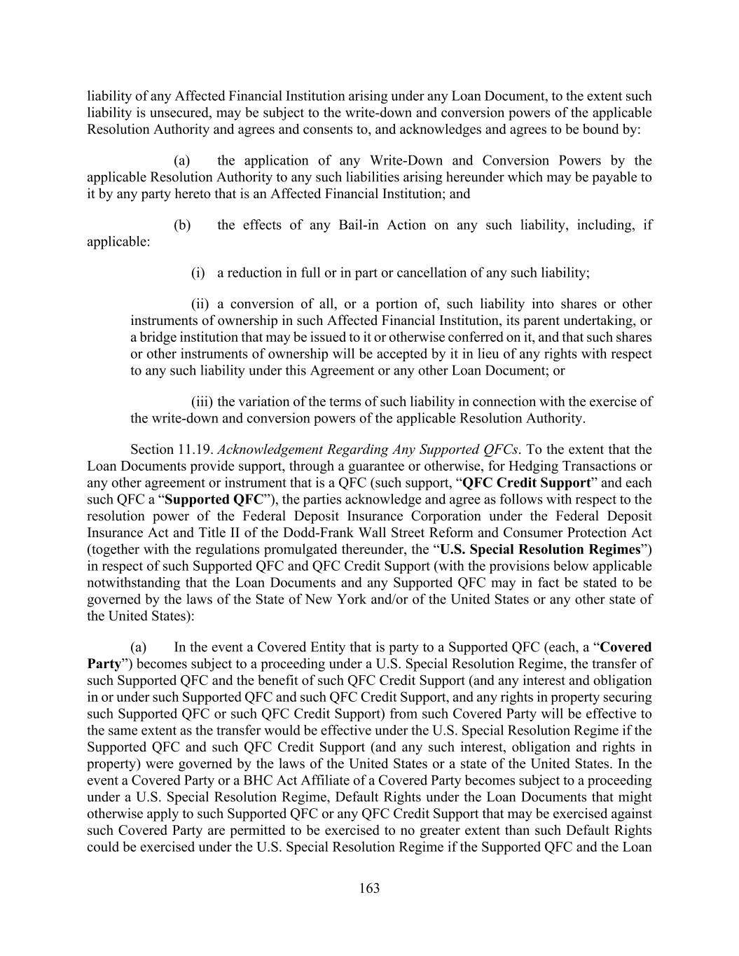 163 liability of any Affected Financial Institution arising under any Loan Document, to the extent such liability is unsecured, may be subject to the write-down and conversion powers of the applicable Resolution Authority and agrees and consents to, and acknowledges and agrees to be bound by: (a) the application of any Write-Down and Conversion Powers by the applicable Resolution Authority to any such liabilities arising hereunder which may be payable to it by any party hereto that is an Affected Financial Institution; and (b) the effects of any Bail-in Action on any such liability, including, if applicable: (i) a reduction in full or in part or cancellation of any such liability; (ii) a conversion of all, or a portion of, such liability into shares or other instruments of ownership in such Affected Financial Institution, its parent undertaking, or a bridge institution that may be issued to it or otherwise conferred on it, and that such shares or other instruments of ownership will be accepted by it in lieu of any rights with respect to any such liability under this Agreement or any other Loan Document; or (iii) the variation of the terms of such liability in connection with the exercise of the write-down and conversion powers of the applicable Resolution Authority. Section 11.19. Acknowledgement Regarding Any Supported QFCs. To the extent that the Loan Documents provide support, through a guarantee or otherwise, for Hedging Transactions or any other agreement or instrument that is a QFC (such support, “QFC Credit Support” and each such QFC a “Supported QFC”), the parties acknowledge and agree as follows with respect to the resolution power of the Federal Deposit Insurance Corporation under the Federal Deposit Insurance Act and Title II of the Dodd-Frank Wall Street Reform and Consumer Protection Act (together with the regulations promulgated thereunder, the “U.S. Special Resolution Regimes”) in respect of such Supported QFC and QFC Credit Support (with the provisions below applicable notwithstanding that the Loan Documents and any Supported QFC may in fact be stated to be governed by the laws of the State of New York and/or of the United States or any other state of the United States): (a) In the event a Covered Entity that is party to a Supported QFC (each, a “Covered Party”) becomes subject to a proceeding under a U.S. Special Resolution Regime, the transfer of such Supported QFC and the benefit of such QFC Credit Support (and any interest and obligation in or under such Supported QFC and such QFC Credit Support, and any rights in property securing such Supported QFC or such QFC Credit Support) from such Covered Party will be effective to the same extent as the transfer would be effective under the U.S. Special Resolution Regime if the Supported QFC and such QFC Credit Support (and any such interest, obligation and rights in property) were governed by the laws of the United States or a state of the United States. In the event a Covered Party or a BHC Act Affiliate of a Covered Party becomes subject to a proceeding under a U.S. Special Resolution Regime, Default Rights under the Loan Documents that might otherwise apply to such Supported QFC or any QFC Credit Support that may be exercised against such Covered Party are permitted to be exercised to no greater extent than such Default Rights could be exercised under the U.S. Special Resolution Regime if the Supported QFC and the Loan