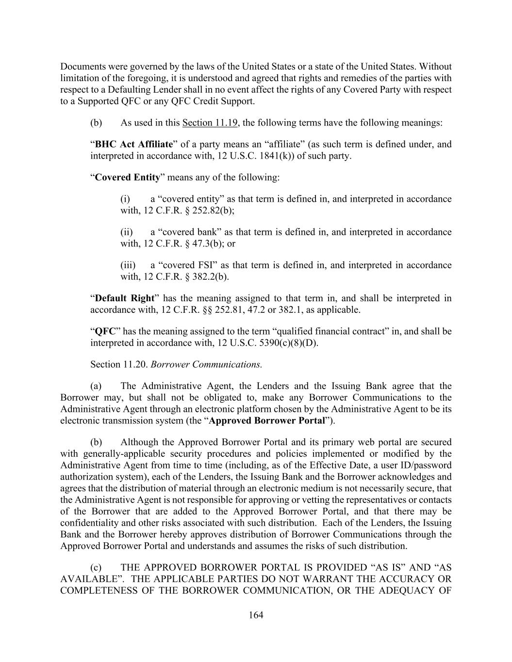 164 Documents were governed by the laws of the United States or a state of the United States. Without limitation of the foregoing, it is understood and agreed that rights and remedies of the parties with respect to a Defaulting Lender shall in no event affect the rights of any Covered Party with respect to a Supported QFC or any QFC Credit Support. (b) As used in this Section 11.19, the following terms have the following meanings: “BHC Act Affiliate” of a party means an “affiliate” (as such term is defined under, and interpreted in accordance with, 12 U.S.C. 1841(k)) of such party. “Covered Entity” means any of the following: (i) a “covered entity” as that term is defined in, and interpreted in accordance with, 12 C.F.R. § 252.82(b); (ii) a “covered bank” as that term is defined in, and interpreted in accordance with, 12 C.F.R. § 47.3(b); or (iii) a “covered FSI” as that term is defined in, and interpreted in accordance with, 12 C.F.R. § 382.2(b). “Default Right” has the meaning assigned to that term in, and shall be interpreted in accordance with, 12 C.F.R. §§ 252.81, 47.2 or 382.1, as applicable. “QFC” has the meaning assigned to the term “qualified financial contract” in, and shall be interpreted in accordance with, 12 U.S.C. 5390(c)(8)(D). Section 11.20. Borrower Communications. (a) The Administrative Agent, the Lenders and the Issuing Bank agree that the Borrower may, but shall not be obligated to, make any Borrower Communications to the Administrative Agent through an electronic platform chosen by the Administrative Agent to be its electronic transmission system (the “Approved Borrower Portal”). (b) Although the Approved Borrower Portal and its primary web portal are secured with generally-applicable security procedures and policies implemented or modified by the Administrative Agent from time to time (including, as of the Effective Date, a user ID/password authorization system), each of the Lenders, the Issuing Bank and the Borrower acknowledges and agrees that the distribution of material through an electronic medium is not necessarily secure, that the Administrative Agent is not responsible for approving or vetting the representatives or contacts of the Borrower that are added to the Approved Borrower Portal, and that there may be confidentiality and other risks associated with such distribution. Each of the Lenders, the Issuing Bank and the Borrower hereby approves distribution of Borrower Communications through the Approved Borrower Portal and understands and assumes the risks of such distribution. (c) THE APPROVED BORROWER PORTAL IS PROVIDED “AS IS” AND “AS AVAILABLE”. THE APPLICABLE PARTIES DO NOT WARRANT THE ACCURACY OR COMPLETENESS OF THE BORROWER COMMUNICATION, OR THE ADEQUACY OF