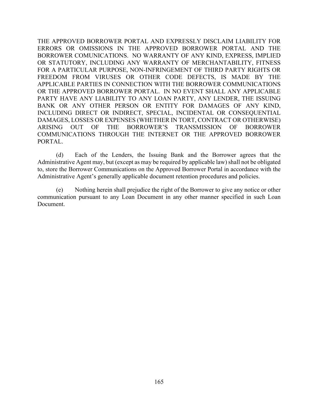 165 THE APPROVED BORROWER PORTAL AND EXPRESSLY DISCLAIM LIABILITY FOR ERRORS OR OMISSIONS IN THE APPROVED BORROWER PORTAL AND THE BORROWER COMUNICATIONS. NO WARRANTY OF ANY KIND, EXPRESS, IMPLIED OR STATUTORY, INCLUDING ANY WARRANTY OF MERCHANTABILITY, FITNESS FOR A PARTICULAR PURPOSE, NON-INFRINGEMENT OF THIRD PARTY RIGHTS OR FREEDOM FROM VIRUSES OR OTHER CODE DEFECTS, IS MADE BY THE APPLICABLE PARTIES IN CONNECTION WITH THE BORROWER COMMUNICATIONS OR THE APPROVED BORROWER PORTAL. IN NO EVENT SHALL ANY APPLICABLE PARTY HAVE ANY LIABILITY TO ANY LOAN PARTY, ANY LENDER, THE ISSUING BANK OR ANY OTHER PERSON OR ENTITY FOR DAMAGES OF ANY KIND, INCLUDING DIRECT OR INDIRECT, SPECIAL, INCIDENTAL OR CONSEQUENTIAL DAMAGES, LOSSES OR EXPENSES (WHETHER IN TORT, CONTRACT OR OTHERWISE) ARISING OUT OF THE BORROWER’S TRANSMISSION OF BORROWER COMMUNICATIONS THROUGH THE INTERNET OR THE APPROVED BORROWER PORTAL. (d) Each of the Lenders, the Issuing Bank and the Borrower agrees that the Administrative Agent may, but (except as may be required by applicable law) shall not be obligated to, store the Borrower Communications on the Approved Borrower Portal in accordance with the Administrative Agent’s generally applicable document retention procedures and policies. (e) Nothing herein shall prejudice the right of the Borrower to give any notice or other communication pursuant to any Loan Document in any other manner specified in such Loan Document.