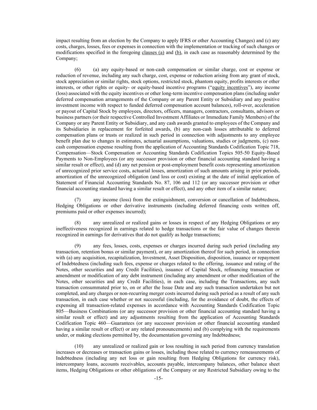 -15- impact resulting from an election by the Company to apply IFRS or other Accounting Changes) and (c) any costs, charges, losses, fees or expenses in connection with the implementation or tracking of such changes or modifications specified in the foregoing clauses (a) and (b), in each case as reasonably determined by the Company; (6) (a) any equity-based or non-cash compensation or similar charge, cost or expense or reduction of revenue, including any such charge, cost, expense or reduction arising from any grant of stock, stock appreciation or similar rights, stock options, restricted stock, phantom equity, profits interests or other interests, or other rights or equity- or equity-based incentive programs (“equity incentives”), any income (loss) associated with the equity incentives or other long-term incentive compensation plans (including under deferred compensation arrangements of the Company or any Parent Entity or Subsidiary and any positive investment income with respect to funded deferred compensation account balances), roll-over, acceleration or payout of Capital Stock by employees, directors, officers, managers, contractors, consultants, advisors or business partners (or their respective Controlled Investment Affiliates or Immediate Family Members) of the Company or any Parent Entity or Subsidiary, and any cash awards granted to employees of the Company and its Subsidiaries in replacement for forfeited awards, (b) any non-cash losses attributable to deferred compensation plans or trusts or realized in such period in connection with adjustments to any employee benefit plan due to changes in estimates, actuarial assumptions, valuations, studies or judgments, (c) non- cash compensation expense resulting from the application of Accounting Standards Codification Topic 718, Compensation—Stock Compensation or Accounting Standards Codification Topics 505-50 Equity-Based Payments to Non-Employees (or any successor provision or other financial accounting standard having a similar result or effect), and (d) any net pension or post-employment benefit costs representing amortization of unrecognized prior service costs, actuarial losses, amortization of such amounts arising in prior periods, amortization of the unrecognized obligation (and loss or cost) existing at the date of initial application of Statement of Financial Accounting Standards No. 87, 106 and 112 (or any successor provision or other financial accounting standard having a similar result or effect), and any other item of a similar nature; (7) any income (loss) from the extinguishment, conversion or cancellation of Indebtedness, Hedging Obligations or other derivative instruments (including deferred financing costs written off, premiums paid or other expenses incurred); (8) any unrealized or realized gains or losses in respect of any Hedging Obligations or any ineffectiveness recognized in earnings related to hedge transactions or the fair value of changes therein recognized in earnings for derivatives that do not qualify as hedge transactions; (9) any fees, losses, costs, expenses or charges incurred during such period (including any transaction, retention bonus or similar payment), or any amortization thereof for such period, in connection with (a) any acquisition, recapitalization, Investment, Asset Disposition, disposition, issuance or repayment of Indebtedness (including such fees, expense or charges related to the offering, issuance and rating of the Notes, other securities and any Credit Facilities), issuance of Capital Stock, refinancing transaction or amendment or modification of any debt instrument (including any amendment or other modification of the Notes, other securities and any Credit Facilities), in each case, including the Transactions, any such transaction consummated prior to, on or after the Issue Date and any such transaction undertaken but not completed, and any charges or non-recurring merger costs incurred during such period as a result of any such transaction, in each case whether or not successful (including, for the avoidance of doubt, the effects of expensing all transaction-related expenses in accordance with Accounting Standards Codification Topic 805—Business Combinations (or any successor provision or other financial accounting standard having a similar result or effect) and any adjustments resulting from the application of Accounting Standards Codification Topic 460—Guarantees (or any successor provision or other financial accounting standard having a similar result or effect) or any related pronouncements) and (b) complying with the requirements under, or making elections permitted by, the documentation governing any Indebtedness; (10) any unrealized or realized gain or loss resulting in such period from currency translation increases or decreases or transaction gains or losses, including those related to currency remeasurements of Indebtedness (including any net loss or gain resulting from Hedging Obligations for currency risk), intercompany loans, accounts receivables, accounts payable, intercompany balances, other balance sheet items, Hedging Obligations or other obligations of the Company or any Restricted Subsidiary owing to the