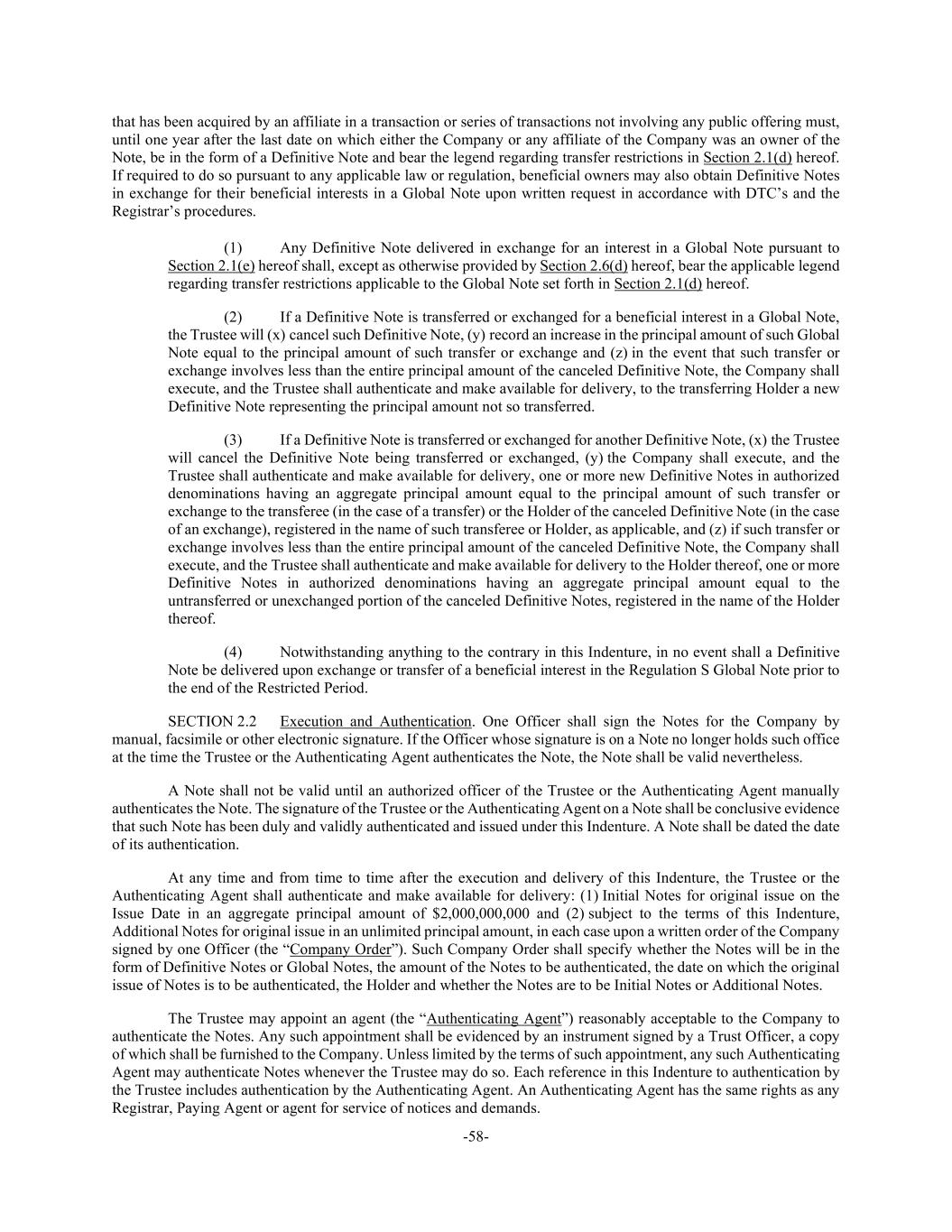 -56- IN EACH CASE, IN ACCORDANCE WITH ANY APPLICABLE SECURITIES LAWS OF ANY STATE OF THE UNITED STATES. AN INSTITUTIONAL ACCREDITED INVESTOR HOLDING THIS SECURITY AGREES THAT IT WILL FURNISH TO THE COMPANY AND THE TRUSTEE SUCH CERTIFICATES, OPINIONS OF COUNSEL AND OTHER INFORMATION AS THEY MAY REASONABLY REQUIRE TO CONFIRM THAT THE TRANSFER BY IT OF THIS SECURITY COMPLIES WITH THE FOREGOING RESTRICTIONS. THE HOLDER HEREOF, BY PURCHASING THIS SECURITY, REPRESENTS AND AGREES FOR THE BENEFIT OF THE COMPANY THAT IT IS (1) A QUALIFIED INSTITUTIONAL BUYER WITHIN THE MEANING OF RULE 144A OR (2) PURCHASING FROM A PERSON NOT PARTICIPATING IN THE INITIAL DISTRIBUTION OF THIS SECURITY (OR ANY PREDECESSOR SECURITY), THAT IT IS AN INSTITUTION THAT IS AN “ACCREDITED INVESTOR” AS DEFINED IN RULE 501(a)(l), (2), (3) OR (7) OF REGULATION D UNDER THE SECURITIES ACT AND THAT IT IS HOLDING THIS SECURITY FOR INVESTMENT PURPOSES AND NOT FOR DISTRIBUTION OR (3) A NON-U.S. PERSON OUTSIDE THE UNITED STATES WITHIN THE MEANING OF (OR AN ACCOUNT SATISFYING THE REQUIREMENTS OF PARAGRAPH (k)(2)(i) OF RULE 902 UNDER) REGULATION S UNDER THE SECURITIES ACT. (g) BY ITS PURCHASE OF THIS SECURITY OR ANY INTEREST HEREIN, THE HOLDER HEREOF WILL BE DEEMED TO HAVE REPRESENTED AND WARRANTED THAT EITHER (1) NO PORTION OF THE ASSETS USED BY SUCH HOLDER TO PURCHASE OR HOLD THIS SECURITY (OR ANY INTEREST HEREIN) CONSTITUTES THE ASSETS OF ANY (A) “EMPLOYEE BENEFIT PLAN” WITHIN THE MEANING OF SECTION 3(3) OF THE EMPLOYEE RETIREMENT INCOME SECURITY ACT OF 1974, AS AMENDED (“ERISA”) SUBJECT TO TITLE I OF ERISA, (B) PLAN, INDIVIDUAL RETIREMENT ACCOUNT OR OTHER ARRANGEMENT THAT IS SUBJECT TO SECTION 4975 OF THE U.S. INTERNAL REVENUE CODE OF 1986, AS AMENDED (THE “CODE”) OR PROVISIONS UNDER ANY OTHER FEDERAL, STATE, LOCAL, NON-U.S. OR OTHER LAWS OR REGULATIONS THAT ARE SIMILAR TO TITLE I OF ERISA OR SECTION 4975 OF THE CODE (“SIMILAR LAWS”), OR (C) ENTITY OR ACCOUNT WHOSE UNDERLYING ASSETS ARE CONSIDERED TO INCLUDE THE ASSETS OF ANY SUCH PLAN, ACCOUNT OR ARRANGEMENT, OR (2) THE HOLDER’S PURCHASE, HOLDING AND DISPOSITION OF THIS SECURITY (OR ANY INTEREST HEREIN) WILL NOT CONSTITUTE OR RESULT IN A NON- EXEMPT PROHIBITED TRANSACTION UNDER SECTION 406 OF ERISA OR SECTION 4975 OF THE CODE OR A VIOLATION OF ANY APPLICABLE SIMILAR LAWS. (2) Each Global Note, whether or not an Initial Note, shall bear the following legend on the face thereof: UNLESS THIS CERTIFICATE IS PRESENTED BY AN AUTHORIZED REPRESENTATIVE OF THE DEPOSITORY TRUST COMPANY, A NEW YORK CORPORATION (“DTC”), TO THE COMPANY OR ITS AGENT FOR REGISTRATION OF TRANSFER, EXCHANGE OR PAYMENT, AND ANY CERTIFICATE ISSUED IS REGISTERED IN THE NAME OF CEDE & CO. OR IN SUCH OTHER NAME AS IS REQUESTED BY AN AUTHORIZED REPRESENTATIVE OF DTC (AND ANY PAYMENT IS MADE TO CEDE & CO. OR TO SUCH OTHER ENTITY AS IS REQUESTED BY AN AUTHORIZED REPRESENTATIVE OF DTC), ANY TRANSFER, PLEDGE OR OTHER USE HEREOF FOR VALUE OR OTHERWISE BY OR TO ANY PERSON IS WRONGFUL INASMUCH AS THE REGISTERED OWNER HEREOF, CEDE & CO., HAS AN INTEREST HEREIN. TRANSFERS OF THIS GLOBAL NOTE SHALL BE LIMITED TO TRANSFERS IN WHOLE, BUT NOT IN PART, TO DTC, TO NOMINEES OF DTC OR TO A SUCCESSOR THEREOF OR SUCH SUCCESSOR’S NOMINEE AND TRANSFERS OF PORTIONS OF THIS GLOBAL NOTE SHALL BE LIMITED TO TRANSFERS MADE IN ACCORDANCE WITH THE RESTRICTIONS SET FORTH IN THE INDENTURE REFERRED TO ON THE REVERSE HEREOF. (e) Book-Entry Provisions. (i) This Section 2.1(e) shall apply only to Global Notes deposited with the Trustee, as custodian for DTC, and for which the applicable procedures of DTC shall govern.