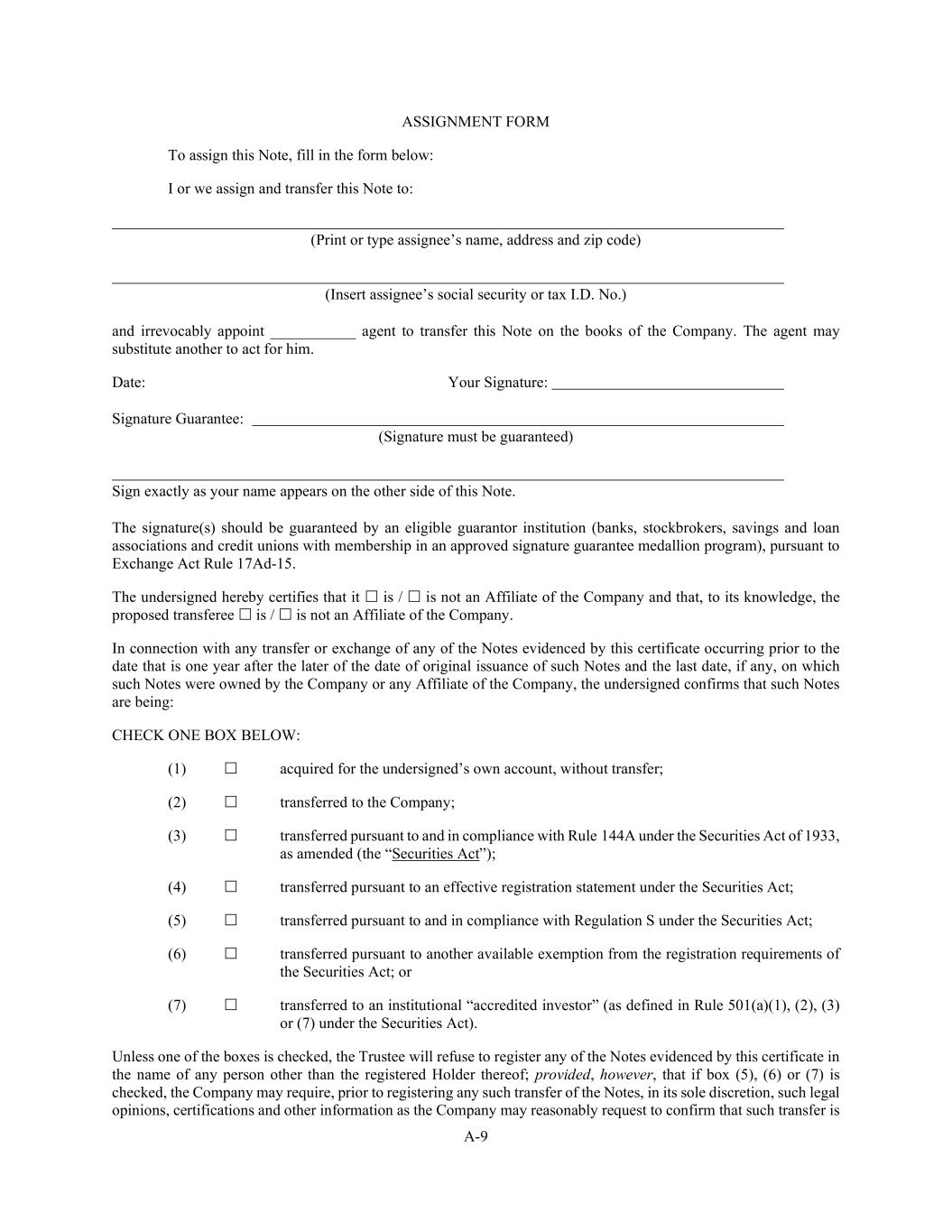 A-9 ASSIGNMENT FORM To assign this Note, fill in the form below: I or we assign and transfer this Note to: (Print or type assignee’s name, address and zip code) (Insert assignee’s social security or tax I.D. No.) and irrevocably appoint ___________ agent to transfer this Note on the books of the Company. The agent may substitute another to act for him. Date: Your Signature: Signature Guarantee: (Signature must be guaranteed) Sign exactly as your name appears on the other side of this Note. The signature(s) should be guaranteed by an eligible guarantor institution (banks, stockbrokers, savings and loan associations and credit unions with membership in an approved signature guarantee medallion program), pursuant to Exchange Act Rule 17Ad-15. The undersigned hereby certifies that it is / is not an Affiliate of the Company and that, to its knowledge, the proposed transferee is / is not an Affiliate of the Company. In connection with any transfer or exchange of any of the Notes evidenced by this certificate occurring prior to the date that is one year after the later of the date of original issuance of such Notes and the last date, if any, on which such Notes were owned by the Company or any Affiliate of the Company, the undersigned confirms that such Notes are being: CHECK ONE BOX BELOW: (1) acquired for the undersigned’s own account, without transfer; (2) transferred to the Company; (3) transferred pursuant to and in compliance with Rule 144A under the Securities Act of 1933, as amended (the “Securities Act”); (4) transferred pursuant to an effective registration statement under the Securities Act; (5) transferred pursuant to and in compliance with Regulation S under the Securities Act; (6) transferred pursuant to another available exemption from the registration requirements of the Securities Act; or (7) transferred to an institutional “accredited investor” (as defined in Rule 501(a)(1), (2), (3) or (7) under the Securities Act). Unless one of the boxes is checked, the Trustee will refuse to register any of the Notes evidenced by this certificate in the name of any person other than the registered Holder thereof; provided, however, that if box (5), (6) or (7) is checked, the Company may require, prior to registering any such transfer of the Notes, in its sole discretion, such legal opinions, certifications and other information as the Company may reasonably request to confirm that such transfer is