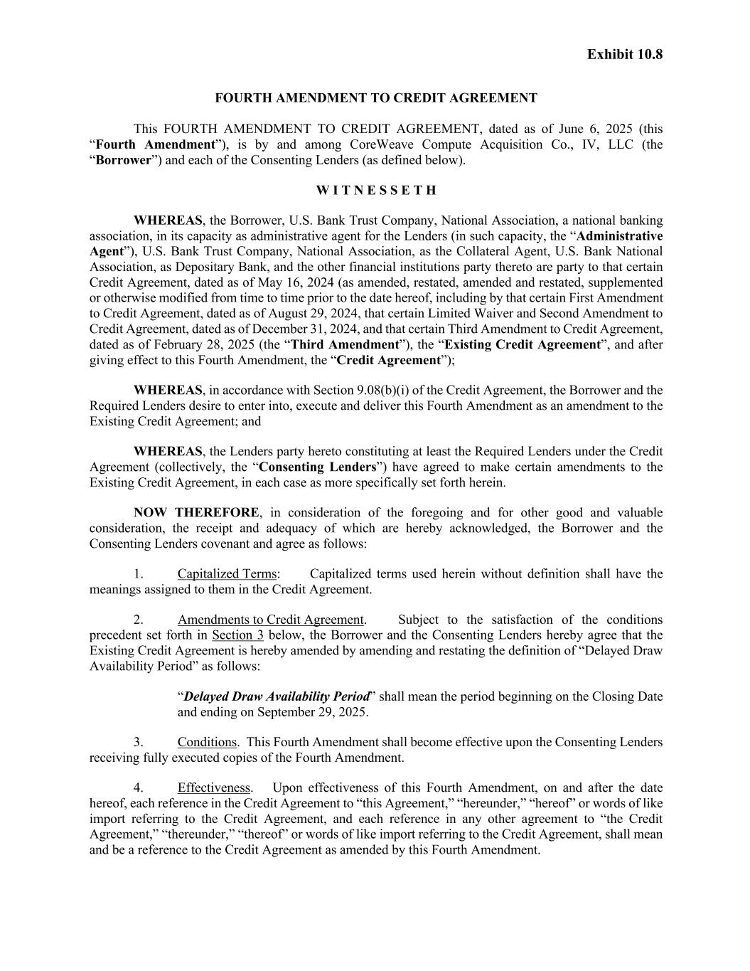 Exhibit 10.8 FOURTH AMENDMENT TO CREDIT AGREEMENT This FOURTH AMENDMENT TO CREDIT AGREEMENT, dated as of June 6, 2025 (this “Fourth Amendment”), is by and among CoreWeave Compute Acquisition Co., IV, LLC (the “Borrower”) and each of the Consenting Lenders (as defined below). W I T N E S S E T H WHEREAS, the Borrower, U.S. Bank Trust Company, National Association, a national banking association, in its capacity as administrative agent for the Lenders (in such capacity, the “Administrative Agent”), U.S. Bank Trust Company, National Association, as the Collateral Agent, U.S. Bank National Association, as Depositary Bank, and the other financial institutions party thereto are party to that certain Credit Agreement, dated as of May 16, 2024 (as amended, restated, amended and restated, supplemented or otherwise modified from time to time prior to the date hereof, including by that certain First Amendment to Credit Agreement, dated as of August 29, 2024, that certain Limited Waiver and Second Amendment to Credit Agreement, dated as of December 31, 2024, and that certain Third Amendment to Credit Agreement, dated as of February 28, 2025 (the “Third Amendment”), the “Existing Credit Agreement”, and after giving effect to this Fourth Amendment, the “Credit Agreement”); WHEREAS, in accordance with Section 9.08(b)(i) of the Credit Agreement, the Borrower and the Required Lenders desire to enter into, execute and deliver this Fourth Amendment as an amendment to the Existing Credit Agreement; and WHEREAS, the Lenders party hereto constituting at least the Required Lenders under the Credit Agreement (collectively, the “Consenting Lenders”) have agreed to make certain amendments to the Existing Credit Agreement, in each case as more specifically set forth herein. NOW THEREFORE, in consideration of the foregoing and for other good and valuable consideration, the receipt and adequacy of which are hereby acknowledged, the Borrower and the Consenting Lenders covenant and agree as follows: 1. Capitalized Terms: Capitalized terms used herein without definition shall have the meanings assigned to them in the Credit Agreement. 2. Amendments to Credit Agreement. Subject to the satisfaction of the conditions precedent set forth in Section 3 below, the Borrower and the Consenting Lenders hereby agree that the Existing Credit Agreement is hereby amended by amending and restating the definition of “Delayed Draw Availability Period” as follows: “Delayed Draw Availability Period” shall mean the period beginning on the Closing Date and ending on September 29, 2025. 3. Conditions. This Fourth Amendment shall become effective upon the Consenting Lenders receiving fully executed copies of the Fourth Amendment. 4. Effectiveness. Upon effectiveness of this Fourth Amendment, on and after the date hereof, each reference in the Credit Agreement to “this Agreement,” “hereunder,” “hereof” or words of like import referring to the Credit Agreement, and each reference in any other agreement to “the Credit Agreement,” “thereunder,” “thereof” or words of like import referring to the Credit Agreement, shall mean and be a reference to the Credit Agreement as amended by this Fourth Amendment.