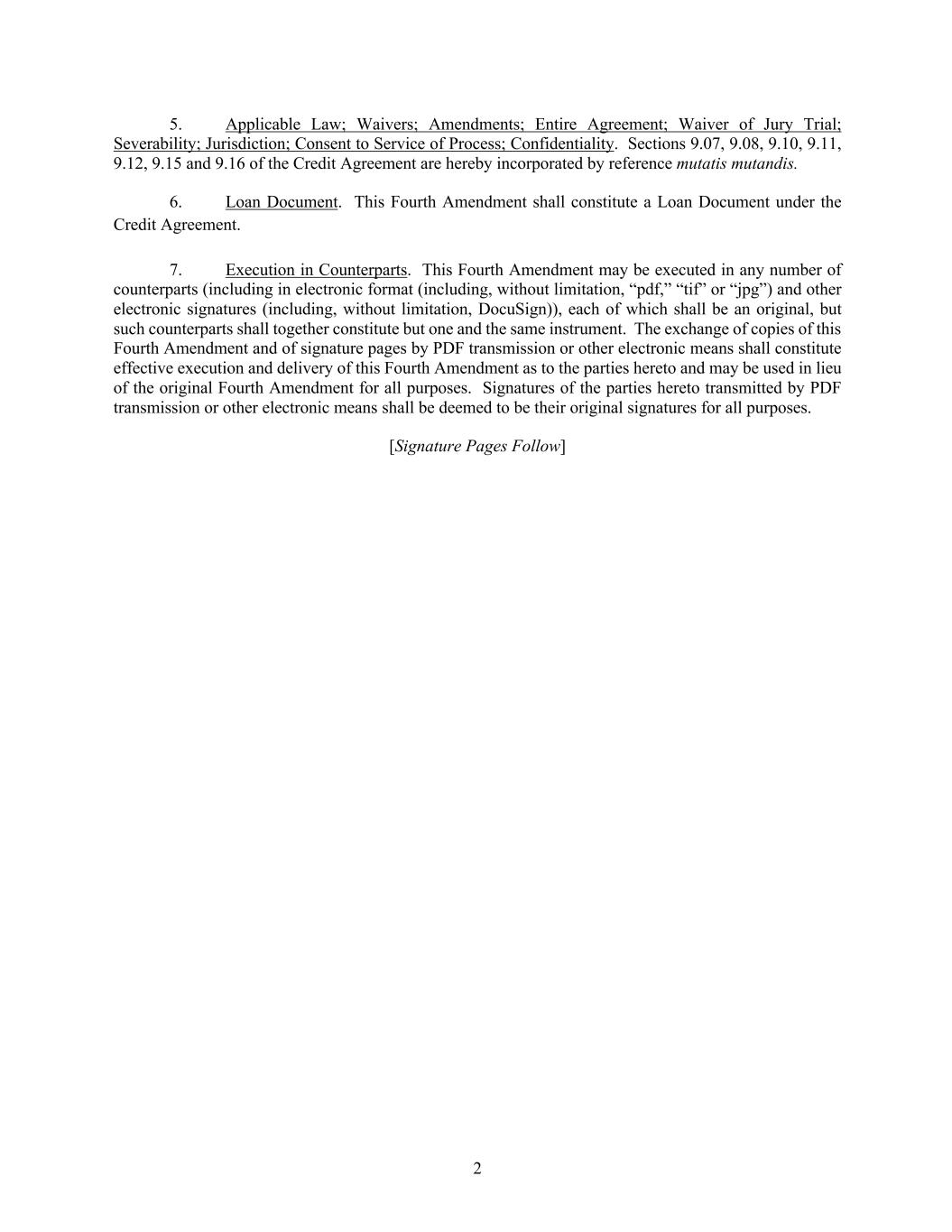 2 5. Applicable Law; Waivers; Amendments; Entire Agreement; Waiver of Jury Trial; Severability; Jurisdiction; Consent to Service of Process; Confidentiality. Sections 9.07, 9.08, 9.10, 9.11, 9.12, 9.15 and 9.16 of the Credit Agreement are hereby incorporated by reference mutatis mutandis. 6. Loan Document. This Fourth Amendment shall constitute a Loan Document under the Credit Agreement. 7. Execution in Counterparts. This Fourth Amendment may be executed in any number of counterparts (including in electronic format (including, without limitation, “pdf,” “tif” or “jpg”) and other electronic signatures (including, without limitation, DocuSign)), each of which shall be an original, but such counterparts shall together constitute but one and the same instrument. The exchange of copies of this Fourth Amendment and of signature pages by PDF transmission or other electronic means shall constitute effective execution and delivery of this Fourth Amendment as to the parties hereto and may be used in lieu of the original Fourth Amendment for all purposes. Signatures of the parties hereto transmitted by PDF transmission or other electronic means shall be deemed to be their original signatures for all purposes. [Signature Pages Follow]