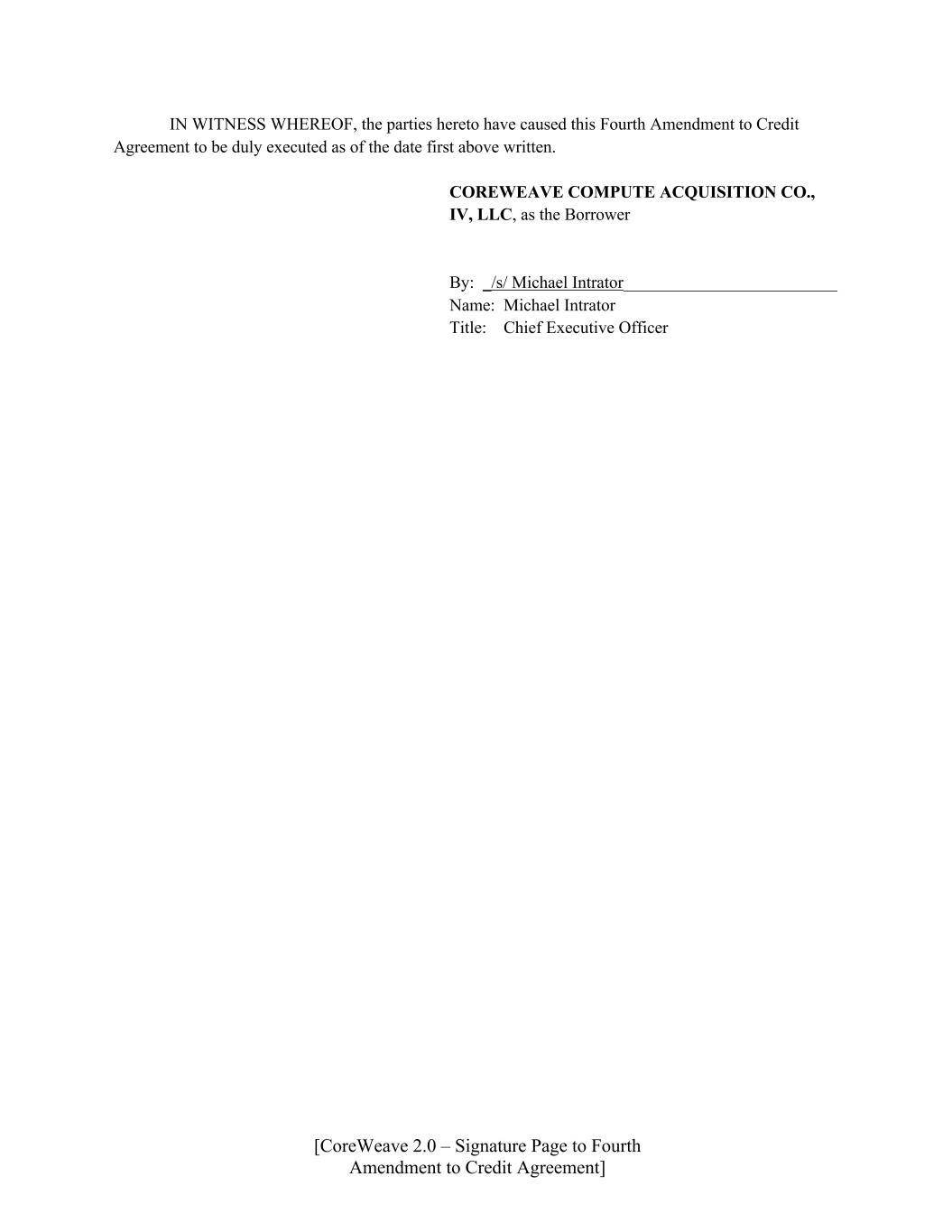 [CoreWeave 2.0 – Signature Page to Fourth Amendment to Credit Agreement] IN WITNESS WHEREOF, the parties hereto have caused this Fourth Amendment to Credit Agreement to be duly executed as of the date first above written. COREWEAVE COMPUTE ACQUISITION CO., IV, LLC, as the Borrower By: _/s/ Michael Intrator_________________________ Name: Michael Intrator Title: Chief Executive Officer