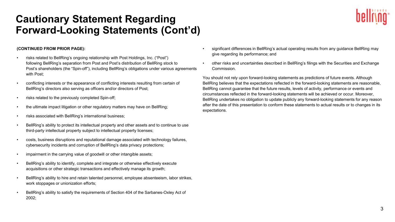 -BellRingのPost Holdings, Inc.(以下「Post」)との継続的な関係に関するリスク - BellRingのPostからの分離及びPostによるBellRing株式のPost株主への分配(以下「本件スピンオフ」)に伴う、BellRingのPostとの様々な契約上の義務を含む;