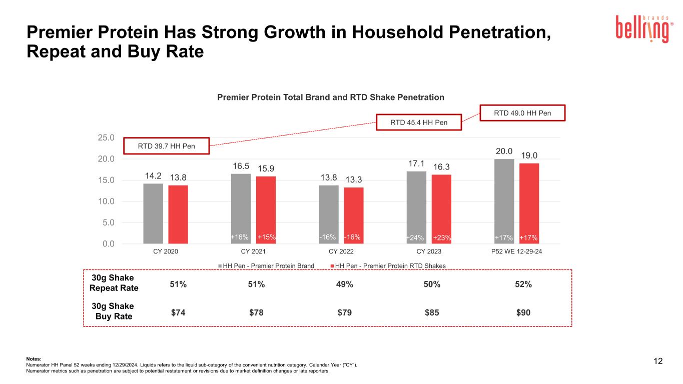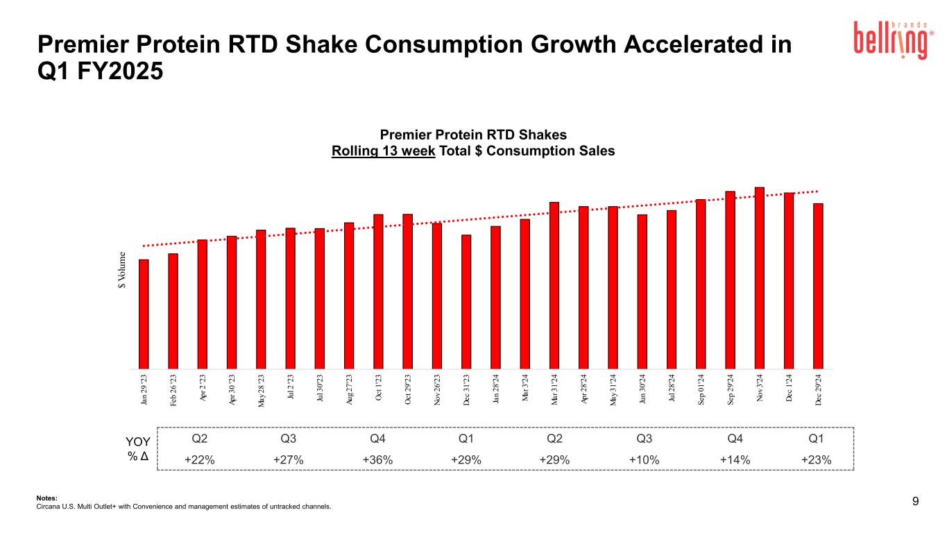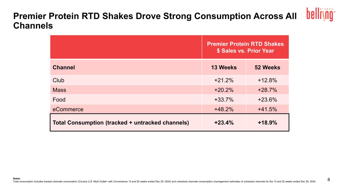 2024年12月29日に終了した13週間のPremier ProteinシェイクおよびPremier Proteinパウダー製品のドル消費量は、前年同期と比較してそれぞれ23.4%および24.4%増加し、Dymatize製品は8.2%減少した(Circana United States(「米国」)のMulti Outlet Plus with Convenienceおよび未追跡チャネルの経営陣推定値を含む)。消費指標に関する追加情報については、ベルリングのウェブサイトの投資家向け情報セクションからアクセスできる補足資料をご覧ください。